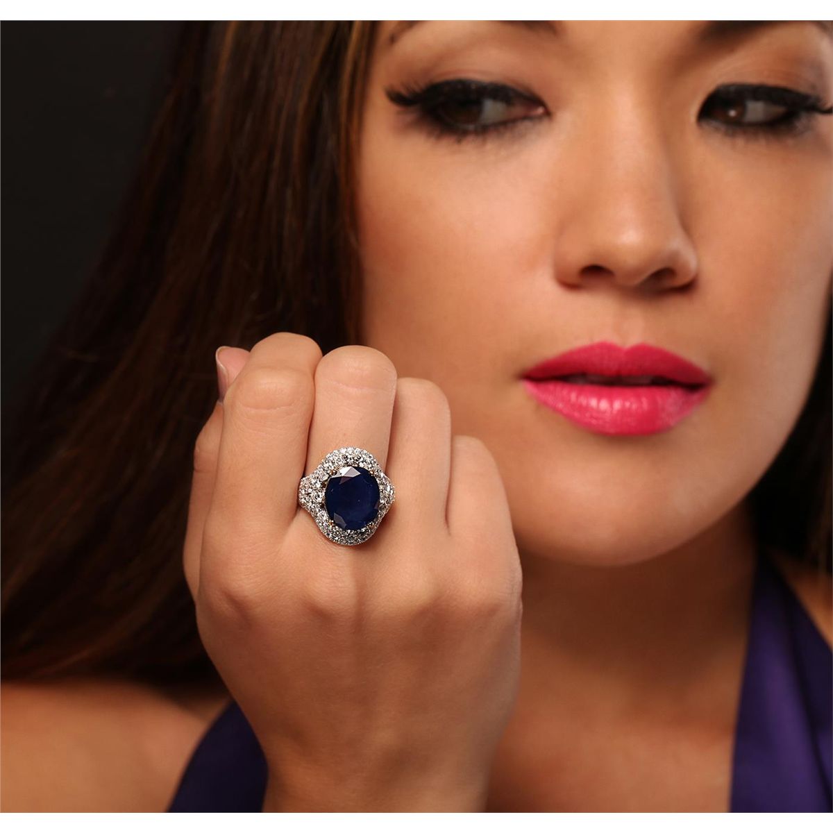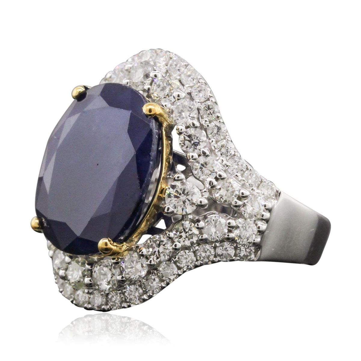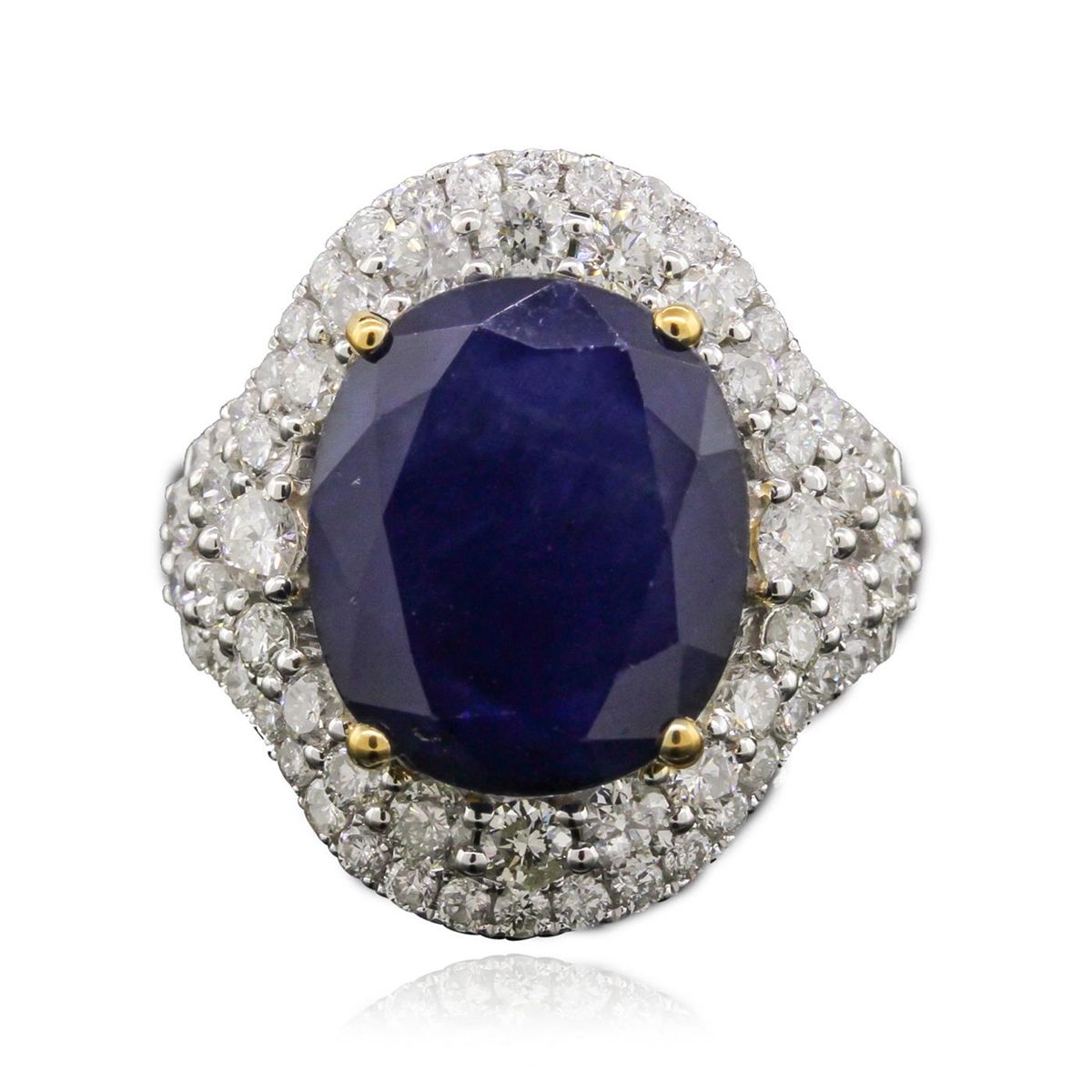 One electronically tested 14KT yellow and white gold Ladies combination cast & assembled ring with a bright polish finish. Condition is new. Identified with markings of "14K". Containing: Thirty-Eight prong set round brilliant cut diamonds, measuring 1.50 - 1.50 x 0.90mm (depth est.) approximate. Total Weight of 38 Stones = 1.00ct. Clarity: I-1 to I-2. Color: G - H, Cut is Good. Twenty-Six prong set round brilliant cut diamonds, measuring 1.90 - 1.90 x 1.14mm (depth est.) approximate. Total Weight of 26 Stones = 0.85ct. Clarity: I-1 to I-2. Color: G - H, Cut is Good. Two prong set round brilliant cut diamonds, measuring 2.70 - 2.70 x 1.62mm (depth est.) approximate. Total Weight of 2 Stones = 0.14ct. Clarity: I-1. Color: G - H, Cut is Good. One prong set oval modified brilliant cut natural blue sapphire, measuring 14.00 x 12.00 x 6.60mm, approximate weight of 10.10ct., clarity is heavily included, type II, medium dark, moderately strong, blue color, (GIA B 6/4), cut is good. Colored gemstones are presumed to have been subjected to commonly used color/clarity enhancement processes. Total Weight of Colored Stones 10.10ct. Total Weight of Diamonds 1.99ct. Total Weight of Ring 9.20 grams. GGL Appraised at $9,775.00.