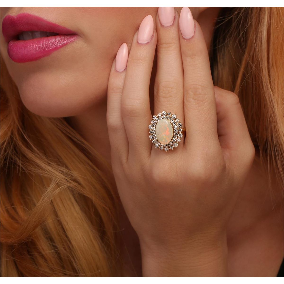 One electronically tested 14KT white and yellow gold ladies combination cast & assembled ring with a flat shank with a bright polish finish. Identified with markings of "14K". Condition is new. Containing: One white opal that is cut in a oval shape and is prong set, measuring 18.53 mm long x 13.17 mm wide, and 9.86 mm thick and the approximate weight is 10.65 carats. The opal has a somewhat bright, green-orange play of color (fire) in a flashfire pattern; a low dome; a good cut; no inclusions; slight variation in base in its brightness and pattern; and is somewhat directional. Twenty-Four prong set round brilliant cut diamonds, measuring 2.20 - 2.20 x 1.32mm (depth est.) approximate total weight of 24 Stones = 0.93ct. Clarity: SI-2 to I-2. Color: H - I, Cut is Very Good. Colored gemstones are presumed to have been subjected to commonly used enhancement processes. All diamonds and colored gemstones are graded in the mounting, unless otherwise stated. Total Weight of Diamonds 0.93ct. Total Weight of Opals 10.65ct. Total Weight of Ring 9.20 grams. GGL Appraised at $5,480.00.