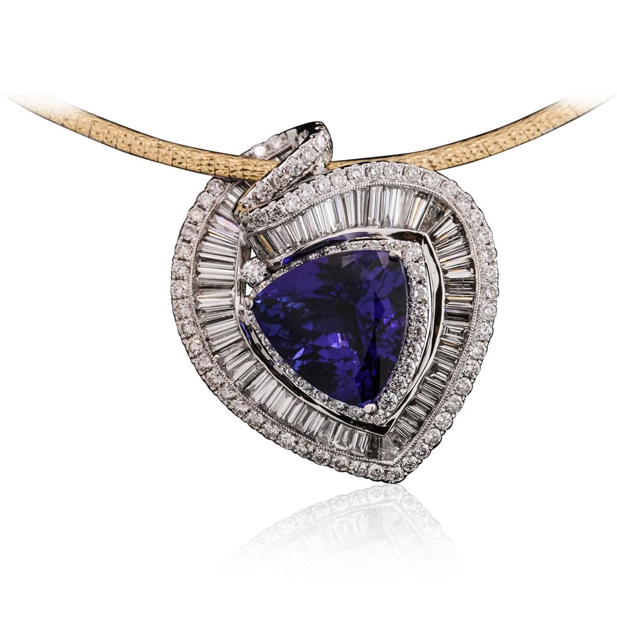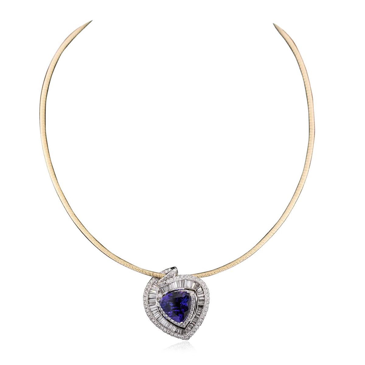 One electronically tested 14KT white and yellow gold ladies combination cast & assembled pendant & necklace with a lobster claw clasp with a bright polish finish. Necklace: 12" in length. Identified with markings of "14K". Condition is new. Containing: One prong set triangle modified brilliant cut natural tanzanite, measuring 14.30 x 14.42 x 8.55mm, approximate weight of 10.88ct., clarity is eye clean, type I, medium, moderately strong, bluish violet color, (GIA bV 5/4), cut is very good. Graded loose prior to setting by GIA Gemological Laboratory. GIA Report: #1166453352. Sixty channel set baguette cut diamonds, measuring from 2.00 x 1.50 x 1.28mm (depth est.) to 4.00 x 1.50 x 1.28mm (depth est.) approximate total weight of 60 Stones = 6.12ct. Clarity: VS-1 to VS-2. Color: H - I, Cut is Good. One Hundred prong set round brilliant cut diamonds, measuring 2.00 - 1.50 x 1.05mm (depth est.) approximate total weight of 100 Stones = 1.10ct. Clarity: SI-1 to SI-2. Color: G - H, Cut is Good. Colored gemstones are presumed to have been subjected to commonly used enhancement processes. All diamonds and colored gemstones are graded in the mounting, unless otherwise stated. Total Weight of Colored Stones 10.88ct. Total Weight of Diamonds 7.22ct. Total Weight of Pendant & Necklace 24.90 grams. GGL Appraised at $45,590.00.