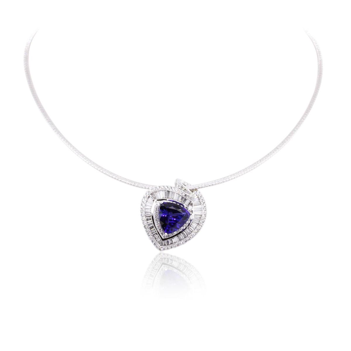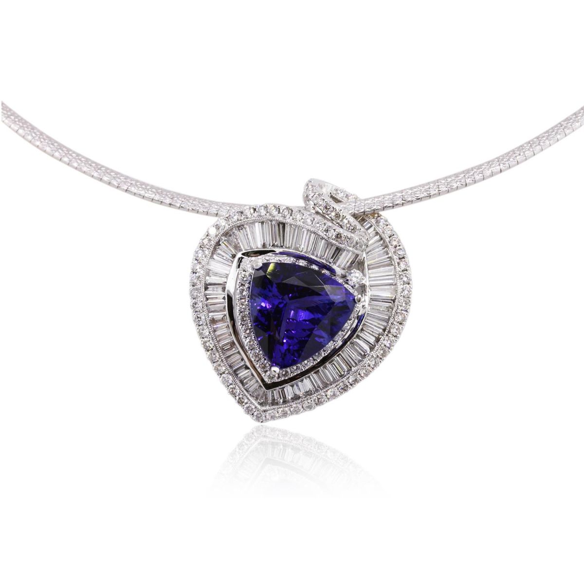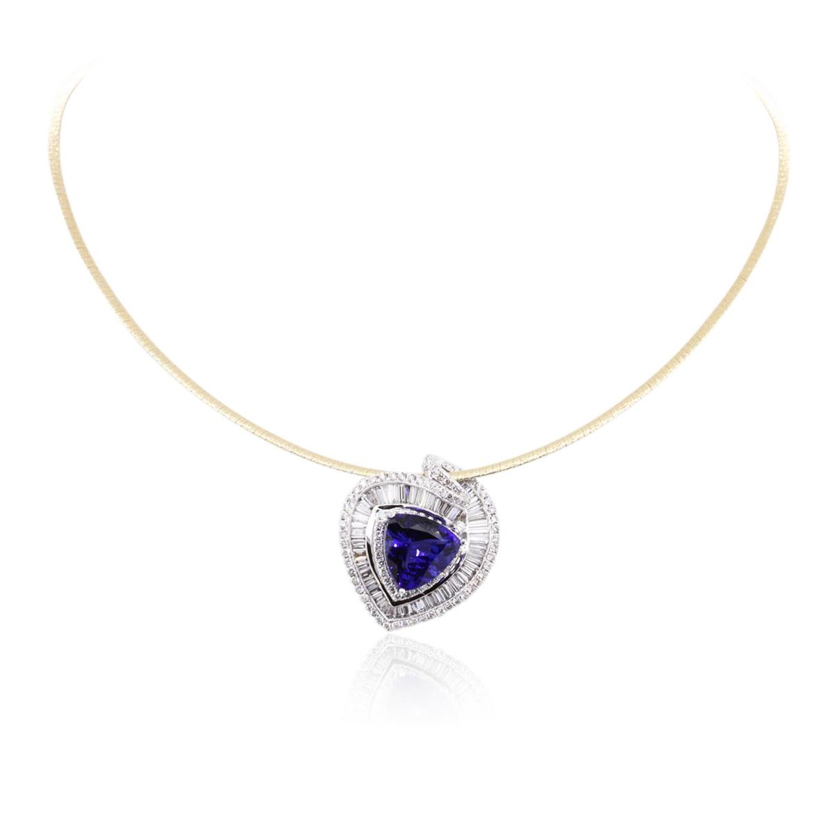 One electronically tested 14KT white and yellow gold ladies combination cast & assembled pendant & necklace with a lobster claw clasp with a bright polish finish. Necklace: 12" in length. Identified with markings of "14K". Condition is new. Containing: One prong set triangle modified brilliant cut natural tanzanite, measuring 14.30 x 14.42 x 8.55mm, approximate weight of 10.88ct., clarity is eye clean, type I, medium, moderately strong, bluish violet color, (GIA bV 5/4), cut is very good. Graded loose prior to setting by GIA Gemological Laboratory. GIA Report: #1166453352. Sixty channel set baguette cut diamonds, measuring from 2.00 x 1.50 x 1.28mm (depth est.) to 4.00 x 1.50 x 1.28mm (depth est.) approximate total weight of 60 Stones = 6.12ct. Clarity: VS-1 to VS-2. Color: H - I, Cut is Good. One Hundred prong set round brilliant cut diamonds, measuring 2.00 - 1.50 x 1.05mm (depth est.) approximate total weight of 100 Stones = 1.10ct. Clarity: SI-1 to SI-2. Color: G - H, Cut is Good. Colored gemstones are presumed to have been subjected to commonly used enhancement processes. All diamonds and colored gemstones are graded in the mounting, unless otherwise stated. Total Weight of Colored Stones 10.88ct. Total Weight of Diamonds 7.22ct. Total Weight of Pendant & Necklace 24.90 grams. GGL Appraised at $45,590.00.