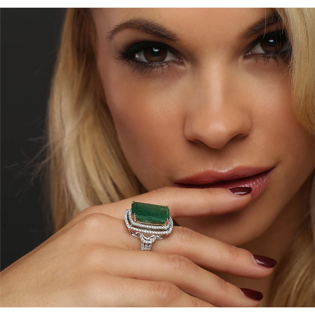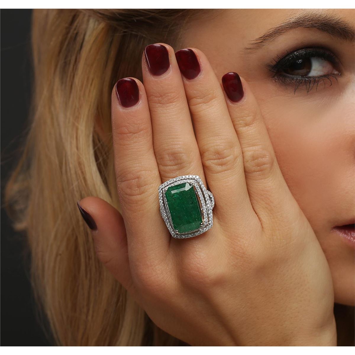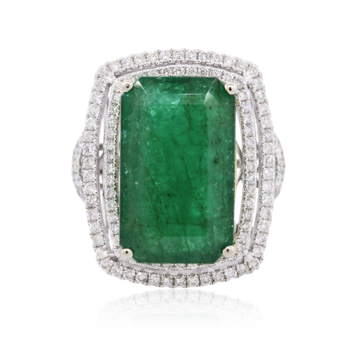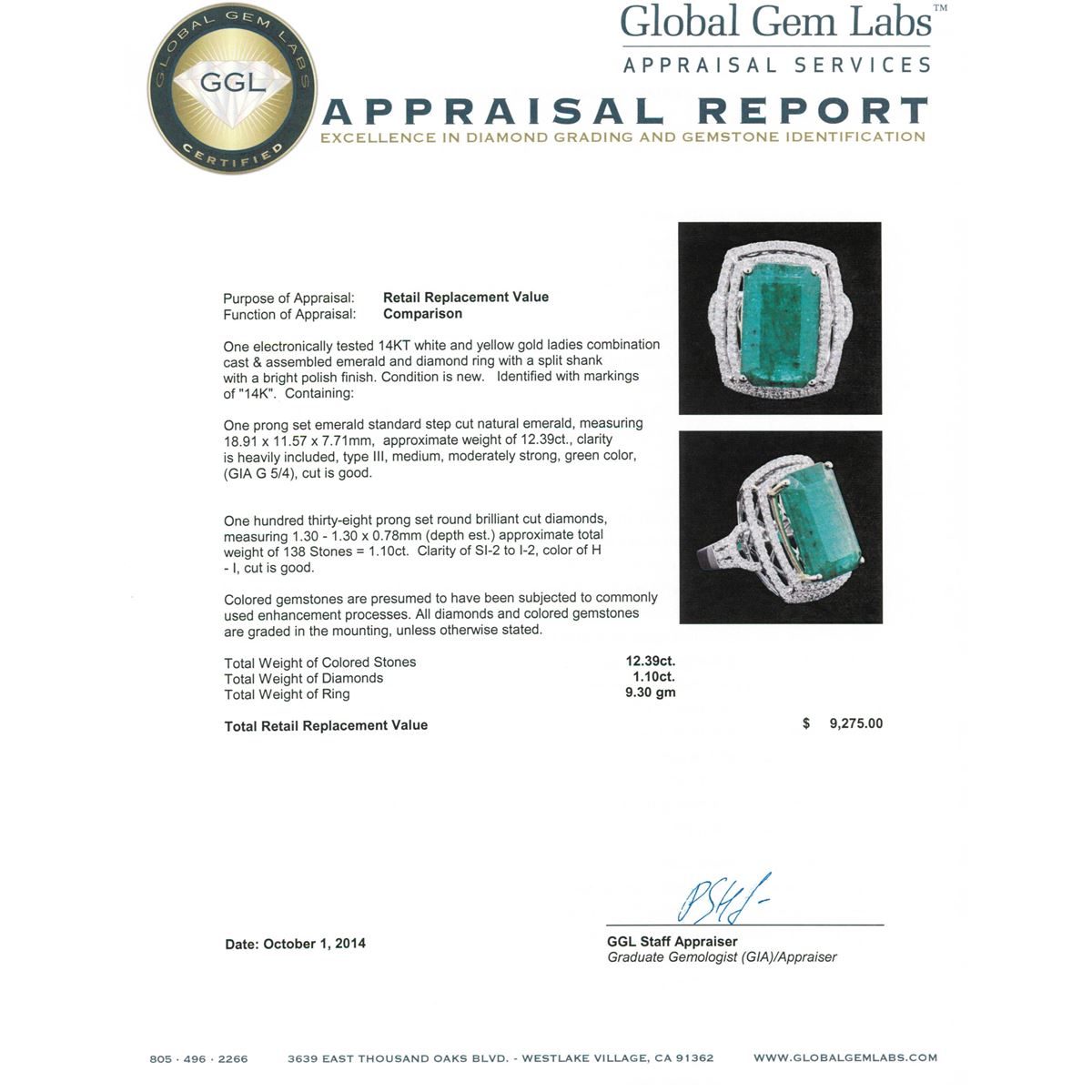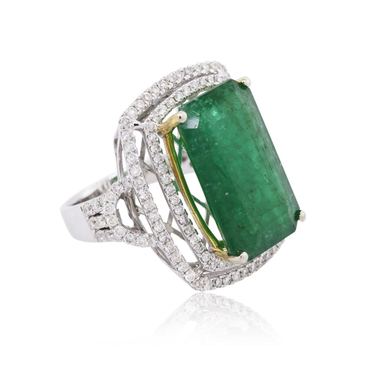 One electronically tested 14KT white and yellow gold ladies combination cast & assembled emerald and diamond ring with a split shank with a bright polish finish. Identified with markings of "14K". Condition is new. Containing: One prong set emerald standard step cut natural emerald, measuring 18.91 x 11.57 x 7.71mm, approximate weight of 12.39ct., clarity is heavily included, type III, medium, moderately strong, green color, (GIA G 5/4), cut is good. One Hundred Thirty-Eight prong set round brilliant cut diamonds, measuring 1.30 - 1.30 x 0.78mm (depth est.) approximate total weight of 138 Stones = 1.10ct. Clarity: SI-2 to I-2. Color: H - I, Cut is Good. Colored gemstones are presumed to have been subjected to commonly used enhancement processes. All diamonds and colored gemstones are graded in the mounting, unless otherwise stated. Total Weight of Colored Stones 12.39ct. Total Weight of Diamonds 1.10ct. Total Weight of Ring 9.30 grams. GGL Appraised at $9,275.00.