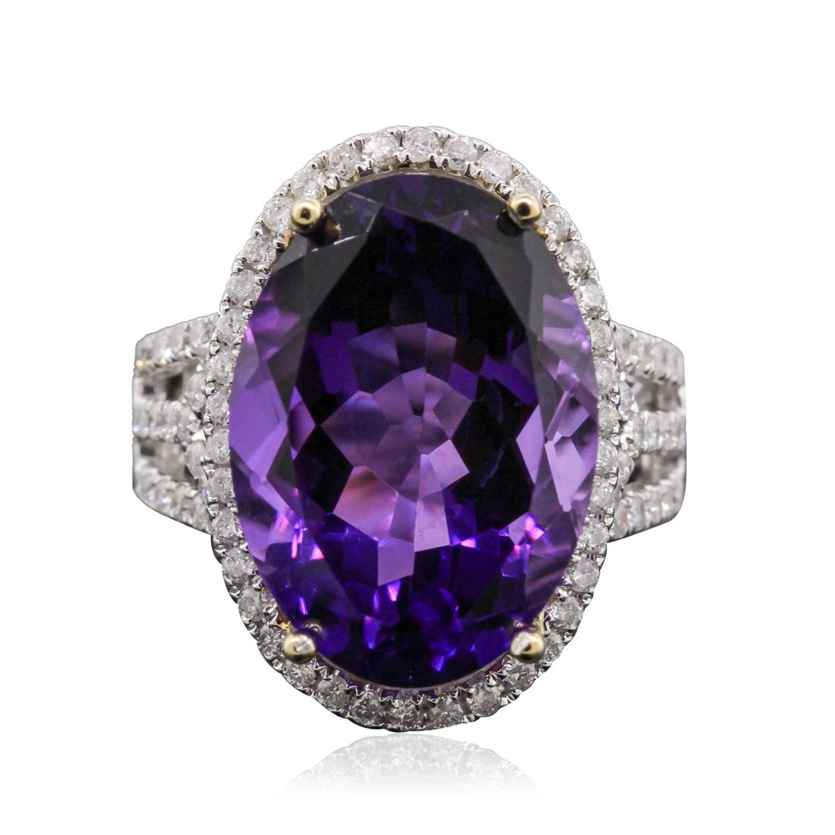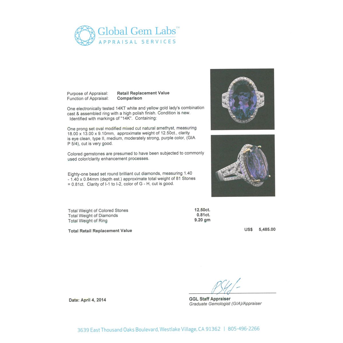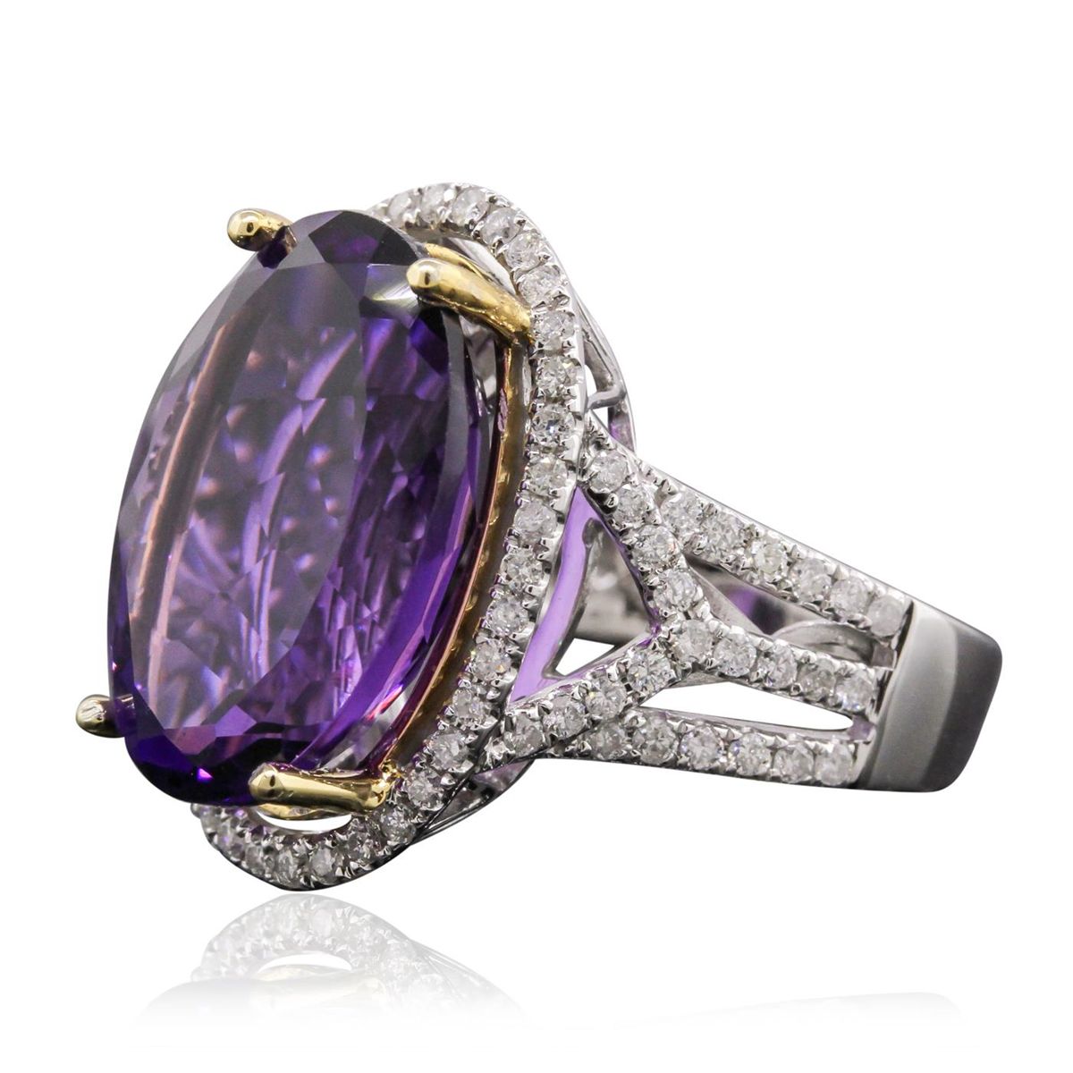 One electronically tested 14KT white and yellow gold Ladies combination cast & assembled ring with a high polish finish. Condition is new. Identified with markings of "14K". Containing: One prong set oval modified mixed cut natural amethyst, measuring 18.00 x 13.00 x 9.10mm, approximate weight of 12.50ct., clarity is eye clean, type II, medium, moderately strong, purple color, (GIA P 5/4), cut is very good. Colored gemstones are presumed to have been subjected to commonly used color/clarity enhancement processes. Eighty-One bead set round brilliant cut diamonds, measuring 1.40 - 1.40 x 0.84mm (depth est.) approximate. Total Weight of 81 Stones = 0.81ct. Clarity: I-1 to I-2. Color: G - H, Cut is Good. Total Weight of Colored Stones 12.50ct. Total Weight of Diamonds 0.81ct. Total Weight of Ring 9.20 grams. GGL Appraised at $5,485.00.
