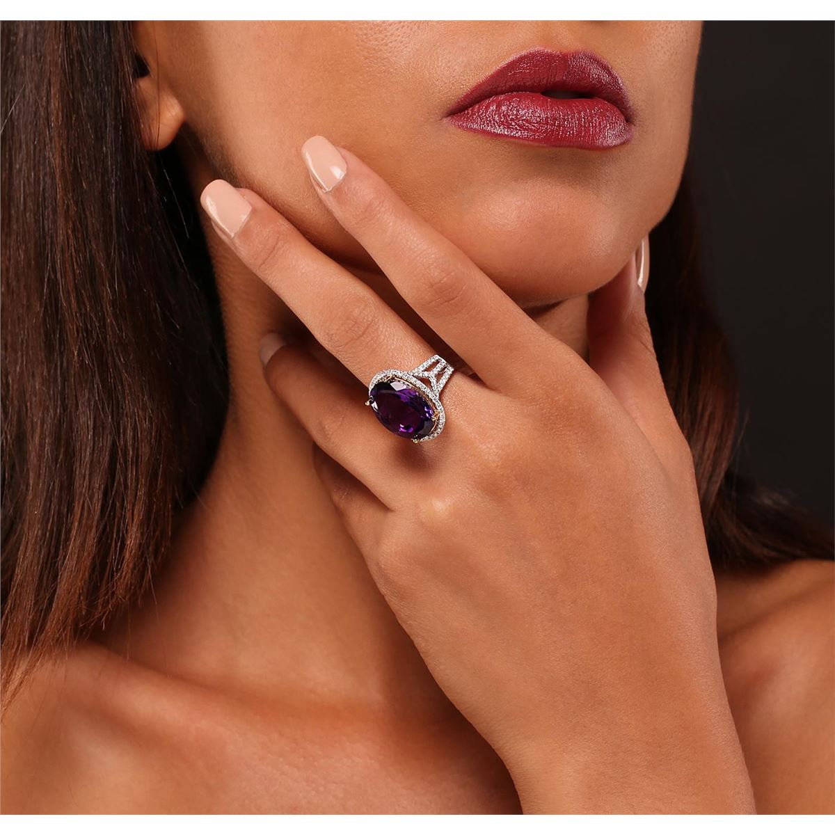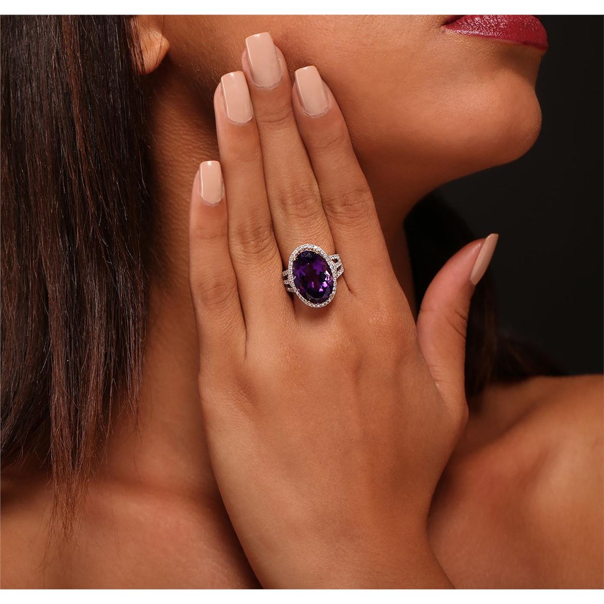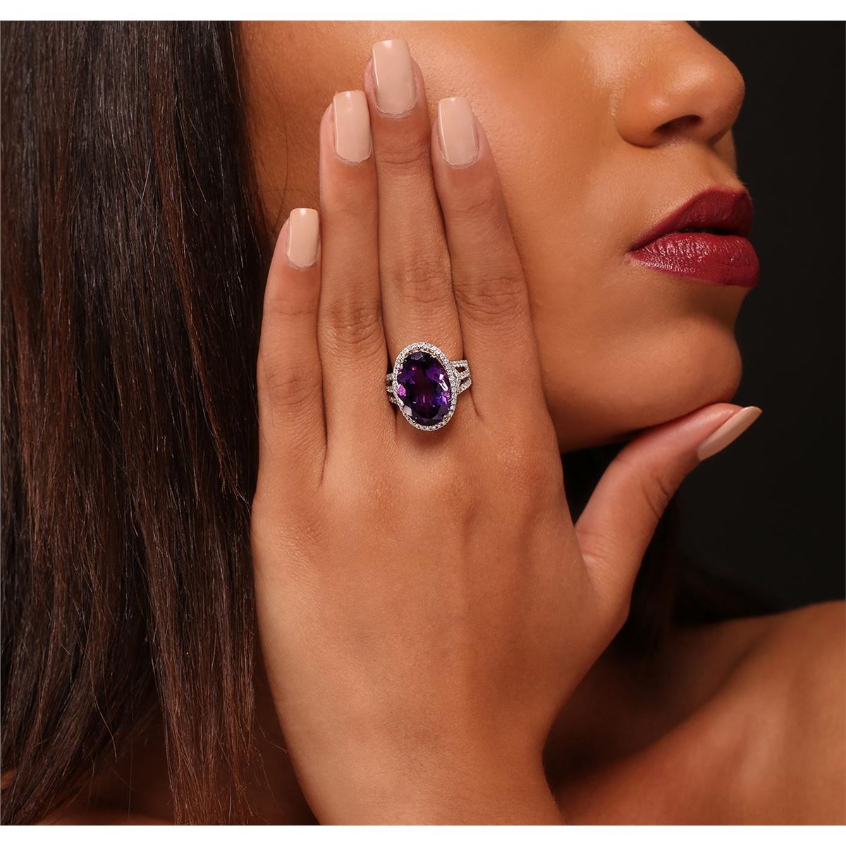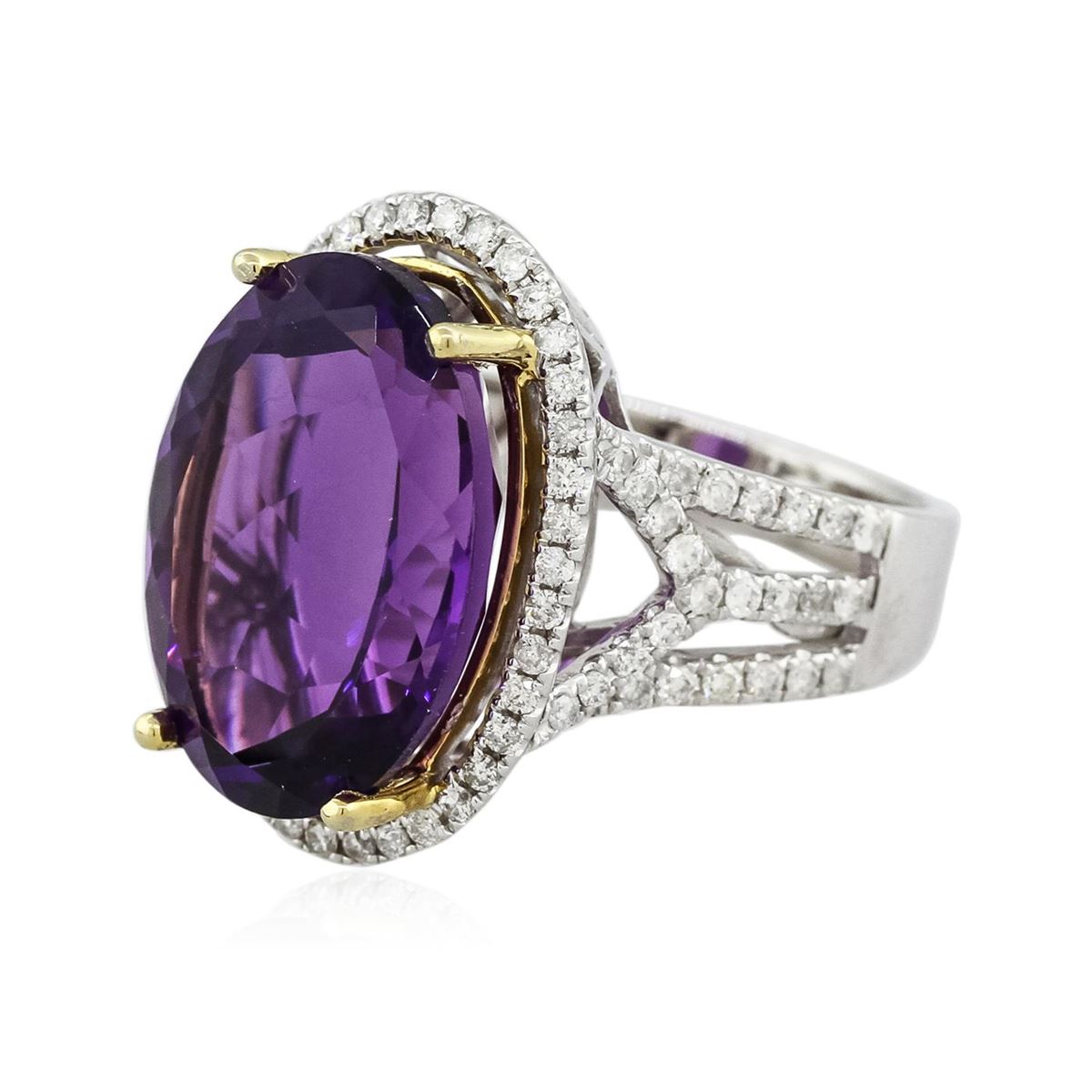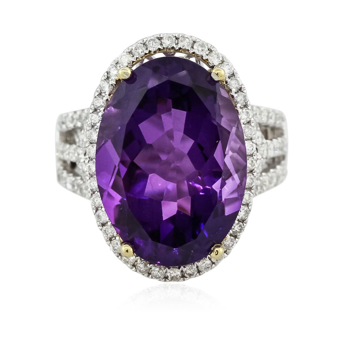 One electronically tested 14KT white and yellow gold Ladies combination cast & assembled ring with a high polish finish. Condition is new. Identified with markings of "14K". Containing: One prong set oval modified mixed cut natural amethyst, measuring 18.00 x 13.00 x 9.10mm, approximate weight of 12.50ct., clarity is eye clean, type II, medium, moderately strong, purple color, (GIA P 5/4), cut is very good. Colored gemstones are presumed to have been subjected to commonly used color/clarity enhancement processes. Eighty-One bead set round brilliant cut diamonds, measuring 1.40 - 1.40 x 0.84mm (depth est.) approximate. Total Weight of 81 Stones = 0.81ct. Clarity: I-1 to I-2. Color: G - H, Cut is Good. Total Weight of Colored Stones 12.50ct. Total Weight of Diamonds 0.81ct. Total Weight of Ring 9.20 grams. GGL Appraised at $5,485.00.