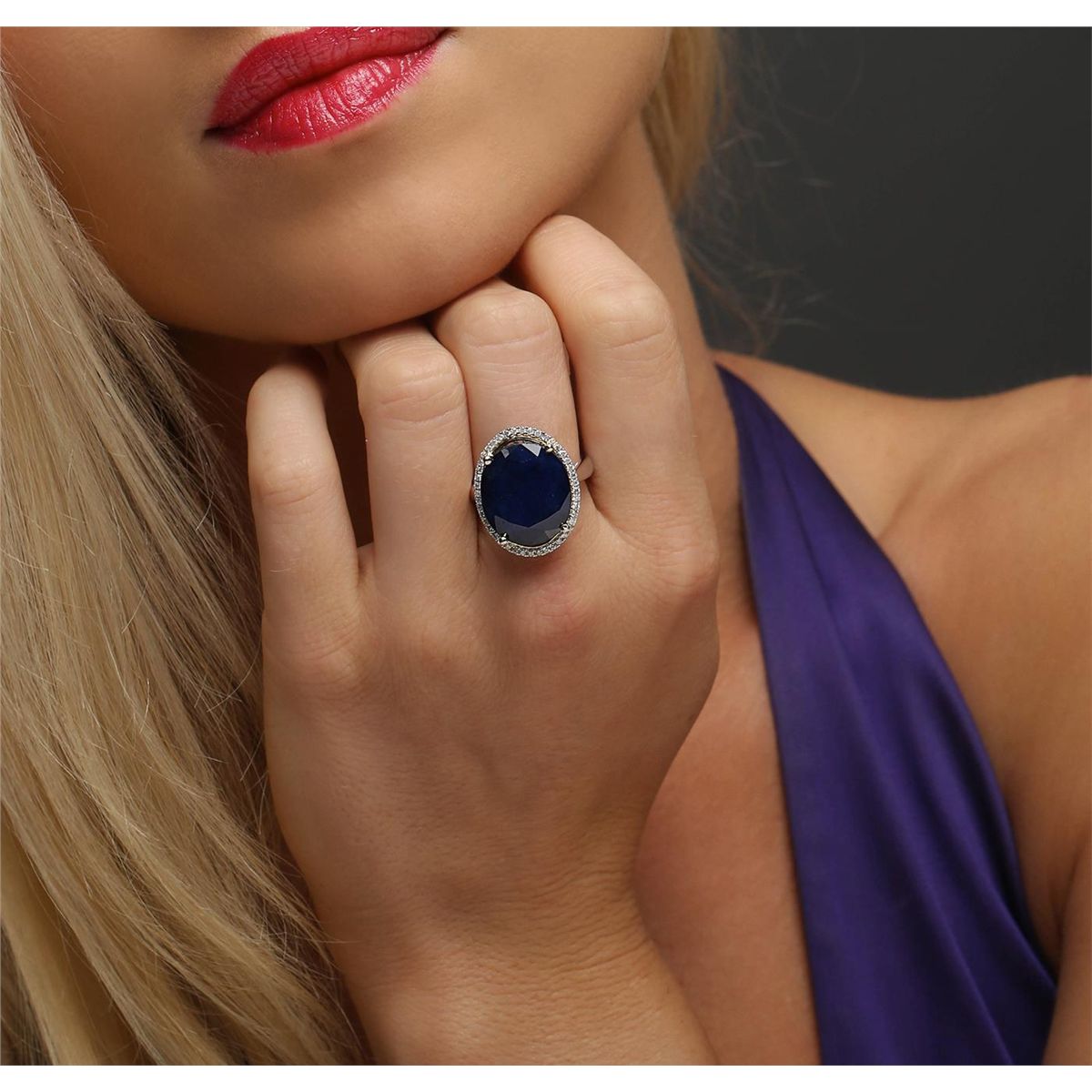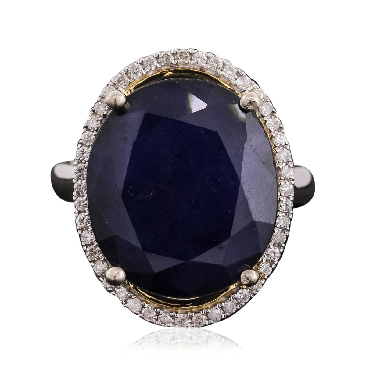 One electronically tested 14KT white and yellow gold ladies combination cast & assembled sapphire and diamond ring with a flat shank with a bright polish finish. Identified with markings of "14K". Condition is new. Containing: One prong set oval modified brilliant cut natural blue sapphire, measuring 17.07 x 14.76 x 6.47mm, approximate weight of 13.11ct., clarity is heavily included, type II, dark, moderately strong, blue color, (GIA B 7/4), cut is good. Forty-Two prong set round brilliant cut diamonds, measuring 1.10 - 1.10 x 0.66mm (depth est.) approximate total weight of 42 Stones = 0.20ct. Clarity: I-1 to I-2. Color: I - J, Cut is Good. Colored gemstones are presumed to have been subjected to commonly used enhancement processes. All diamonds and colored gemstones are graded in the mounting, unless otherwise stated total weight of Colored Stones 13.11ct. Total Weight of Diamonds 0.20ct. Total Weight of Ring 9.10 grams. GGL Appraised at $8,695.00.