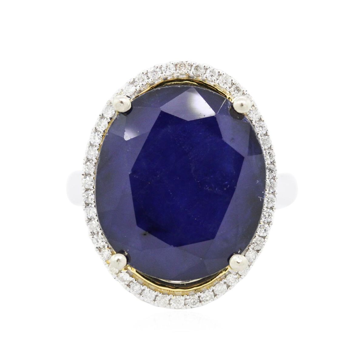 One electronically tested 14KT white and yellow gold ladies combination cast & assembled sapphire and diamond ring with a flat shank with a bright polish finish. Identified with markings of "14K". Condition is new. Containing: One prong set oval modified brilliant cut natural blue sapphire, measuring 17.07 x 14.76 x 6.47mm, approximate weight of 13.11ct., clarity is heavily included, type II, dark, moderately strong, blue color, (GIA B 7/4), cut is good. Forty-Two prong set round brilliant cut diamonds, measuring 1.10 - 1.10 x 0.66mm (depth est.) approximate total weight of 42 Stones = 0.20ct. Clarity: I-1 to I-2. Color: I - J, Cut is Good. Colored gemstones are presumed to have been subjected to commonly used enhancement processes. All diamonds and colored gemstones are graded in the mounting, unless otherwise stated total weight of Colored Stones 13.11ct. Total Weight of Diamonds 0.20ct. Total Weight of Ring 9.10 grams. GGL Appraised at $8,695.00.