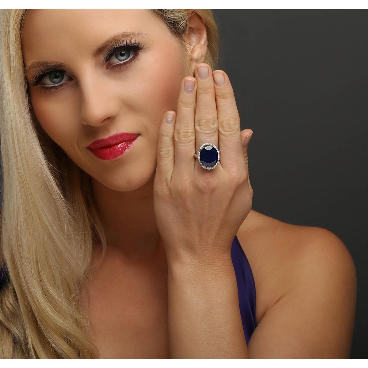 One electronically tested 14KT white and yellow gold ladies combination cast & assembled sapphire and diamond ring with a flat shank with a bright polish finish. Identified with markings of "14K". Condition is new. Containing: One prong set oval modified brilliant cut natural blue sapphire, measuring 17.07 x 14.76 x 6.47mm, approximate weight of 13.11ct., clarity is heavily included, type II, dark, moderately strong, blue color, (GIA B 7/4), cut is good. Forty-Two prong set round brilliant cut diamonds, measuring 1.10 - 1.10 x 0.66mm (depth est.) approximate total weight of 42 Stones = 0.20ct. Clarity: I-1 to I-2. Color: I - J, Cut is Good. Colored gemstones are presumed to have been subjected to commonly used enhancement processes. All diamonds and colored gemstones are graded in the mounting, unless otherwise stated total weight of Colored Stones 13.11ct. Total Weight of Diamonds 0.20ct. Total Weight of Ring 9.10 grams. GGL Appraised at $8,695.00.