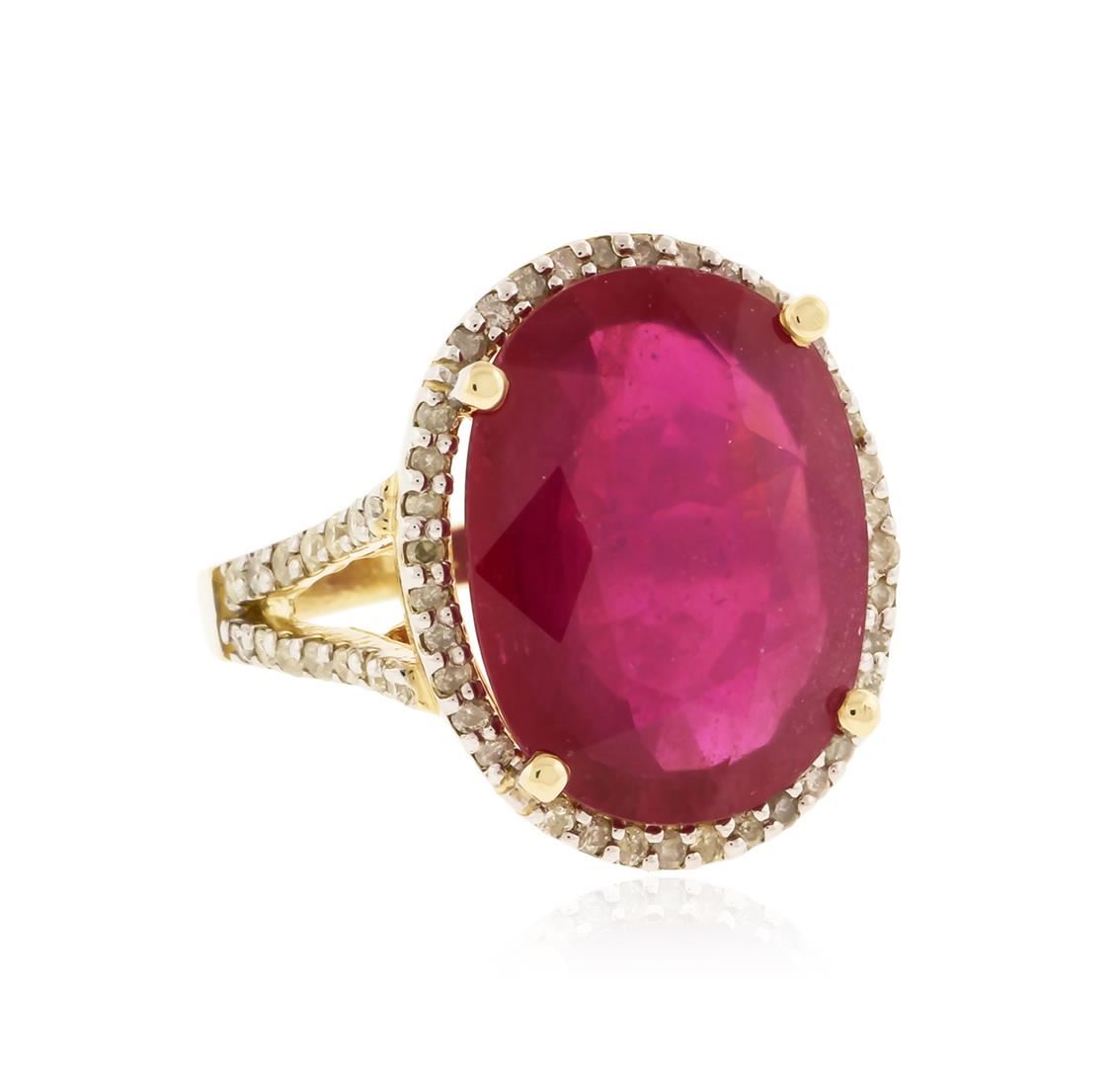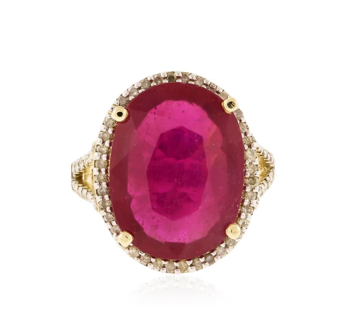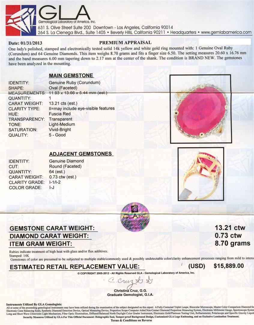 One ladies polished, stamped and electronically tested solid 14KT yellow and white gold ring mounted with: 1 genuine oval ruby (corundum) and 64 genuine diamonds. This item weighs 8.70 gramds and fits a finger size 6.50. The setting measures 20.60 x 16.76 mm and the band measures 6.00 mm tapering down to 2.17 mm at the center of the shank. The condition is brand new. The gemstones have been analyzed in the setting. GLA Appraised at $15,889.00.