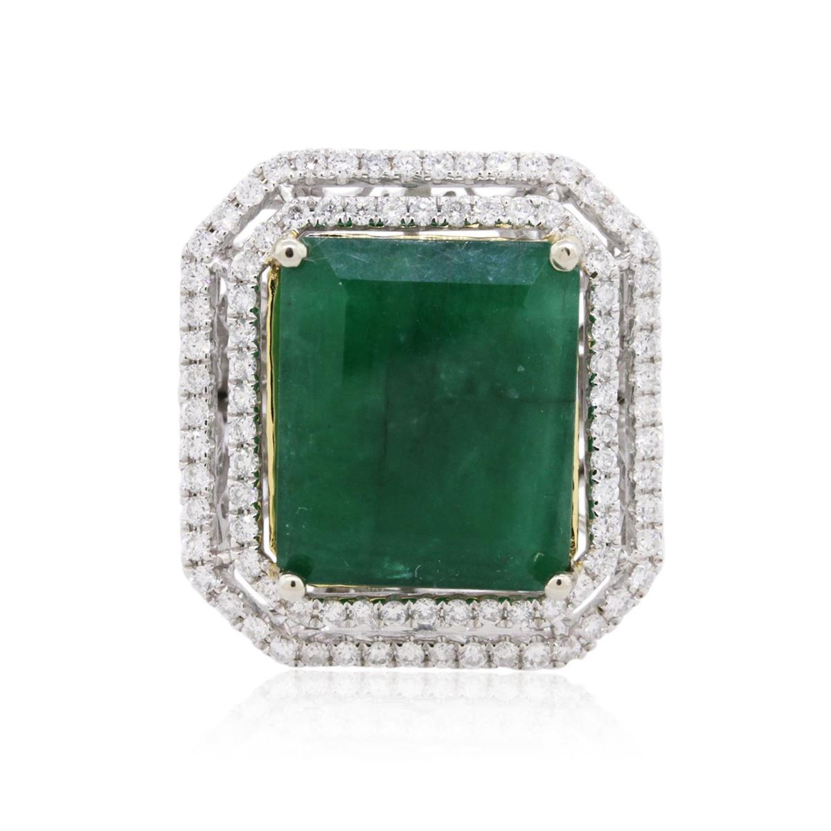 One electronically tested 14KT white and yellow gold ladies combination cast & assembled emerald and diamond ring with a split shank with a bright polish finish. Identified with markings of "14K". Condition is new. Containing: One prong set emerald standard step cut natural emerald, measuring 15.71 x 13.36 x 8.68mm, approximate weight of 13.38ct., clarity is heavily included, type III, medium dark, moderately strong, green color, (GIA G 6/4), cut is good. One Hundred Forty-Eight prong set round brilliant cut diamonds, measuring 1.30 - 1.30 x 0.78mm (depth est.) approximate total weight of 148 Stones = 1.18ct. Clarity: SI-2 to I-1. Color: H - I, Cut is Good. Colored gemstones are presumed to have been subjected to commonly used enhancement processes. All diamonds and colored gemstones are graded in the mounting, unless otherwise stated. Total Weight of Colored Stones 13.38ct. Total Weight of Diamonds 1.18ct. Total Weight of Ring 12.10 grams. GGL Appraised at $14,880.00.