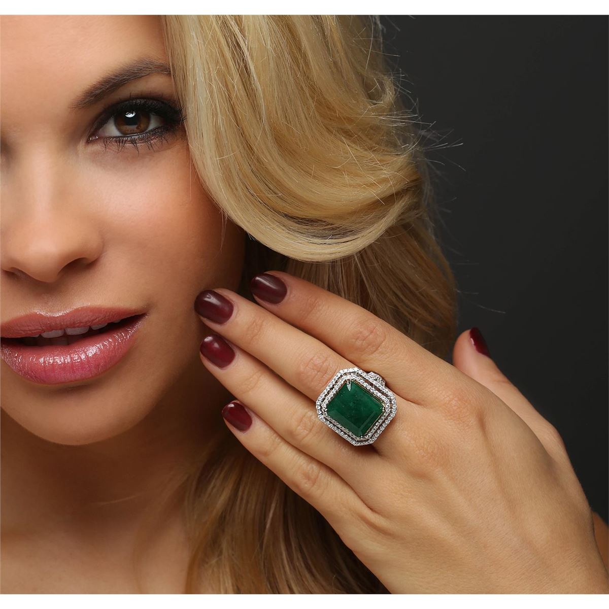 One electronically tested 14KT white and yellow gold ladies combination cast & assembled emerald and diamond ring with a split shank with a bright polish finish. Identified with markings of "14K". Condition is new. Containing: One prong set emerald standard step cut natural emerald, measuring 15.71 x 13.36 x 8.68mm, approximate weight of 13.38ct., clarity is heavily included, type III, medium dark, moderately strong, green color, (GIA G 6/4), cut is good. One Hundred Forty-Eight prong set round brilliant cut diamonds, measuring 1.30 - 1.30 x 0.78mm (depth est.) approximate total weight of 148 Stones = 1.18ct. Clarity: SI-2 to I-1. Color: H - I, Cut is Good. Colored gemstones are presumed to have been subjected to commonly used enhancement processes. All diamonds and colored gemstones are graded in the mounting, unless otherwise stated. Total Weight of Colored Stones 13.38ct. Total Weight of Diamonds 1.18ct. Total Weight of Ring 12.10 grams. GGL Appraised at $14,880.00.