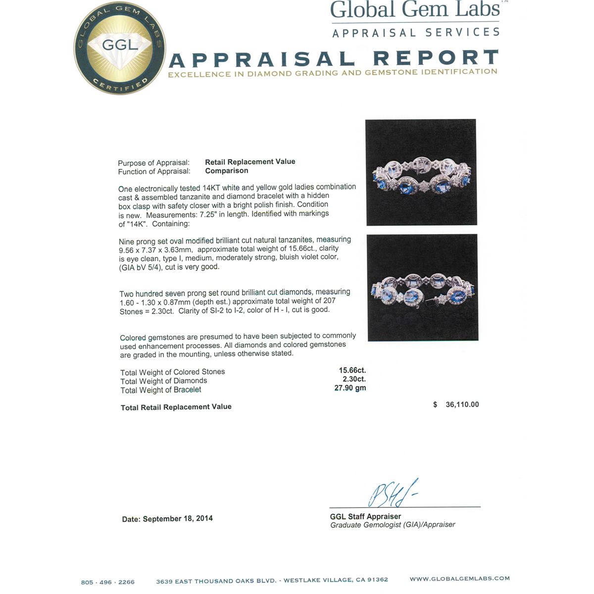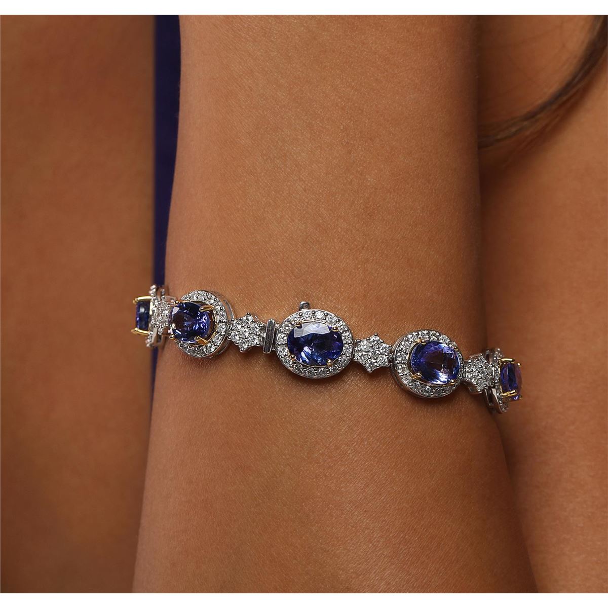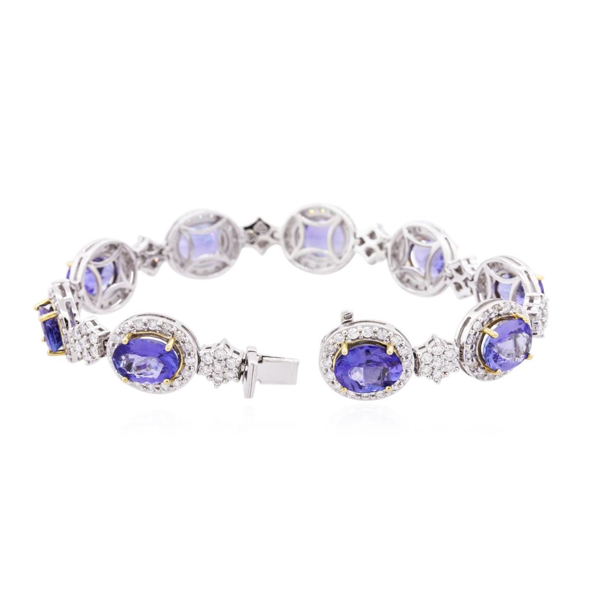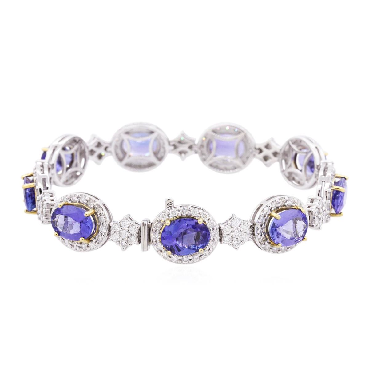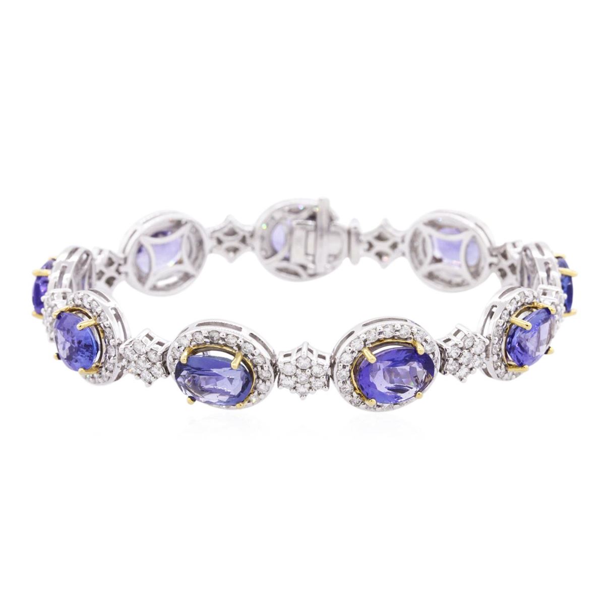 One electronically tested 14KT white and yellow gold ladies combination cast & assembled tanzanite and diamond bracelet with a hidden box clasp with safety closer with a bright polish finish. Measurements: 7.25" in length. Identified with markings of "14K". Condition is new. Containing: Nine prong set oval modified brilliant cut natural tanzanites, measuring 9.56 x 7.37 x 3.63mm, approximate total weight of 15.66ct., clarity is eye clean, type I, medium, moderately strong, bluish violet color, (GIA bV 5/4), cut is very good. Two Hundred Seven prong set round brilliant cut diamonds, measuring 1.60 - 1.30 x 0.87mm (depth est.) approximate total weight of 207 Stones = 2.30ct. Clarity: SI-2 to I-2. Color: H - I, Cut is Good. Colored gemstones are presumed to have been subjected to commonly used enhancement processes. All diamonds and colored gemstones are graded in the mounting, unless otherwise stated. Total Weight of Colored Stones 15.66ct. Total Weight of Diamonds 2.30ct. Total Weight of Bracelet 27.90 grams. GGL Appraised at $36,110.00.