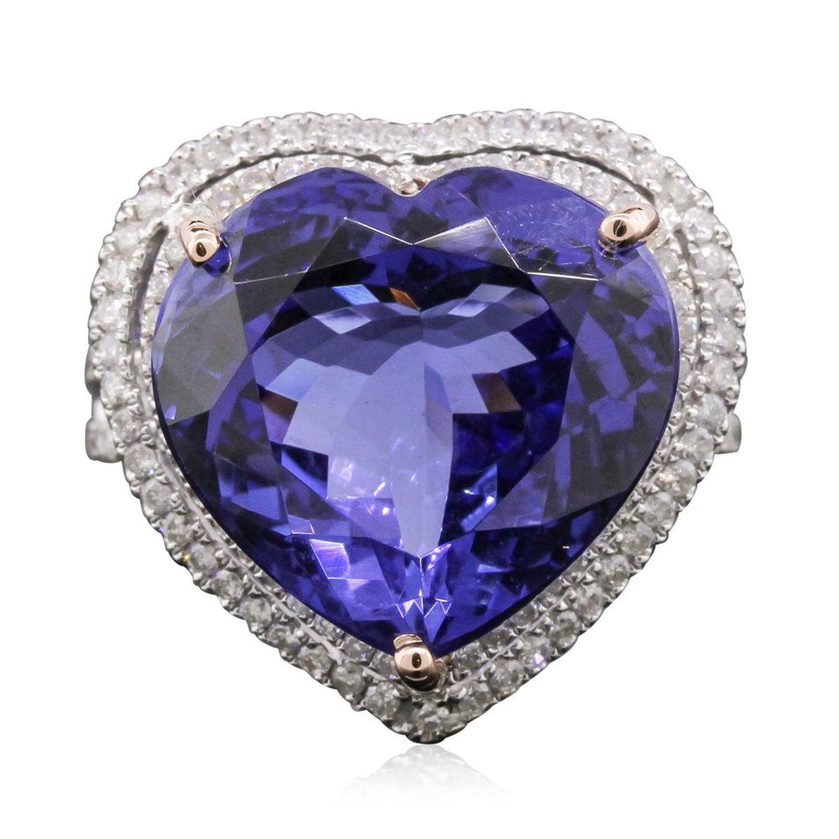 One electronically tested 14KT rose and white gold Ladies combination cast & assembled fashion ring with a bright polish finish. Condition is new. Containing: One prong set heart modified brilliant cut natural tanzanite, measuring 15.38 x 16.27 x 9.46mm, exact weight 16.27ct., clarity is eye clean, type I, medium, moderately strong, violetish blue color, (GIA vB 5/4), cut is very good. GIA Report: #6157961730.Colored gemstones are presumed to have been subjected to commonly used color/clarity enhancement processes. One Hundred Thirty-Four bead set round brilliant cut diamonds, measuring 1.30 - 1.30 x 0.78mm (depth est.) approximate. Total Weight of 134 Stones = 1.07ct. Clarity: SI-2 to I-2. Color: H - I, Cut is Good. Total Weight of Colored Stones 16.27ct. Total Weight of Diamonds 1.07ct. Total Weight of Ring 9.20 grams. GGL Appraised at $27,515.00.