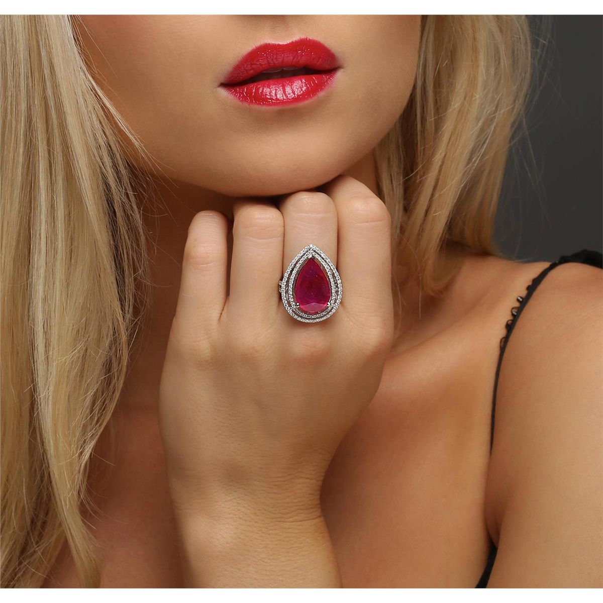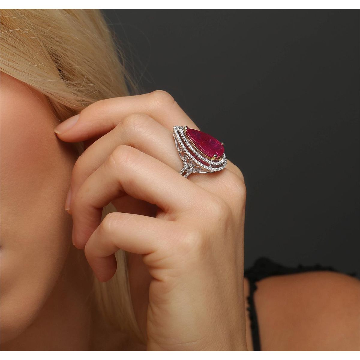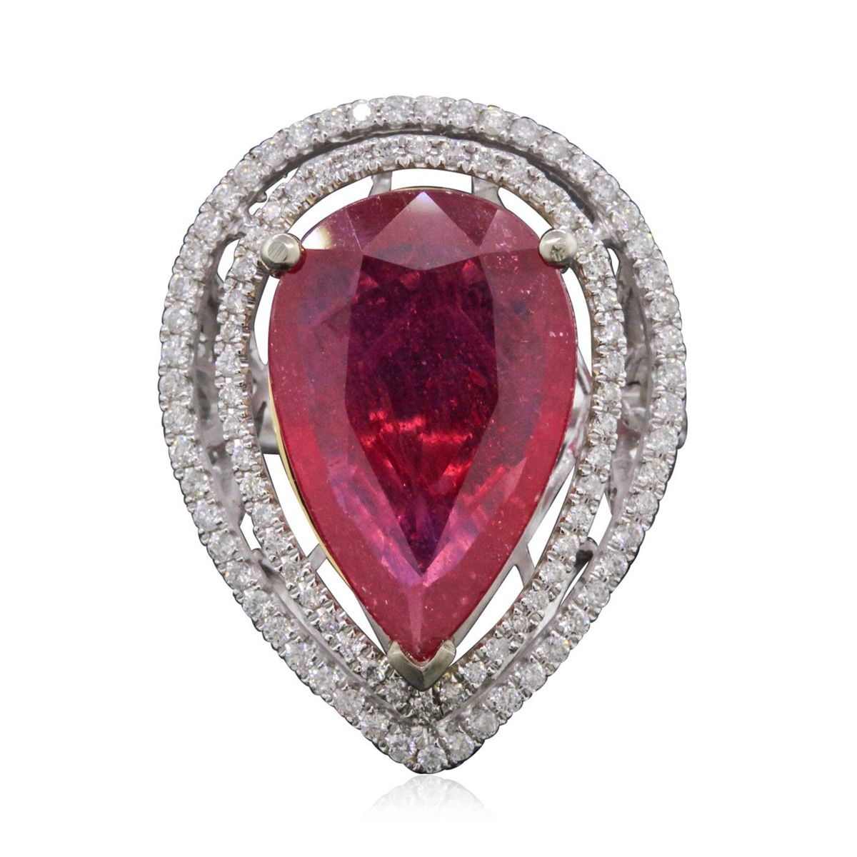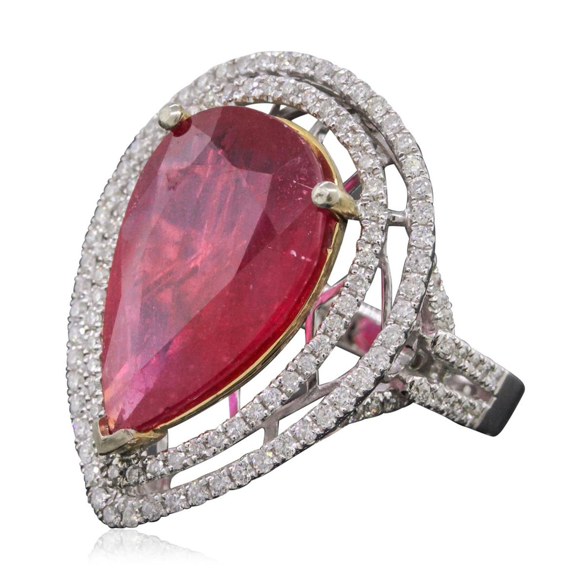 One electronically tested 14KT white and yellow gold ladies combination cast & assembled ruby and diamond ring with a cathedral shank with a bright polish finish. Identified with markings of "14K". Condition is new. Containing: One prong set pear modified brilliant cut natural ruby, measuring 18.00 x 16.66 x 7.00mm, approximate weight of 16.79ct., clarity is heavily included, type II, medium, moderately strong, strongly purplish red color, (GIA stpR 5/4), cut is good. One Hundred Thirty-Four prong set round brilliant cut diamonds, measuring 1.10 - 1.10 x 0.66mm (depth est.) stated total weight of 134 Stones = 0.64ct. Clarity: I-1 to I-2. Color: I - J, Cut is Good. Colored gemstones are presumed to have been subjected to commonly used enhancement processes. All diamonds and colored gemstones are graded in the mounting, unless otherwise stated total weight of Colored Stones 16.79ct. Total Weight of Diamonds 0.64ct. Total Weight of Ring 8.60 grams. GGL Appraised at $10,060.00.