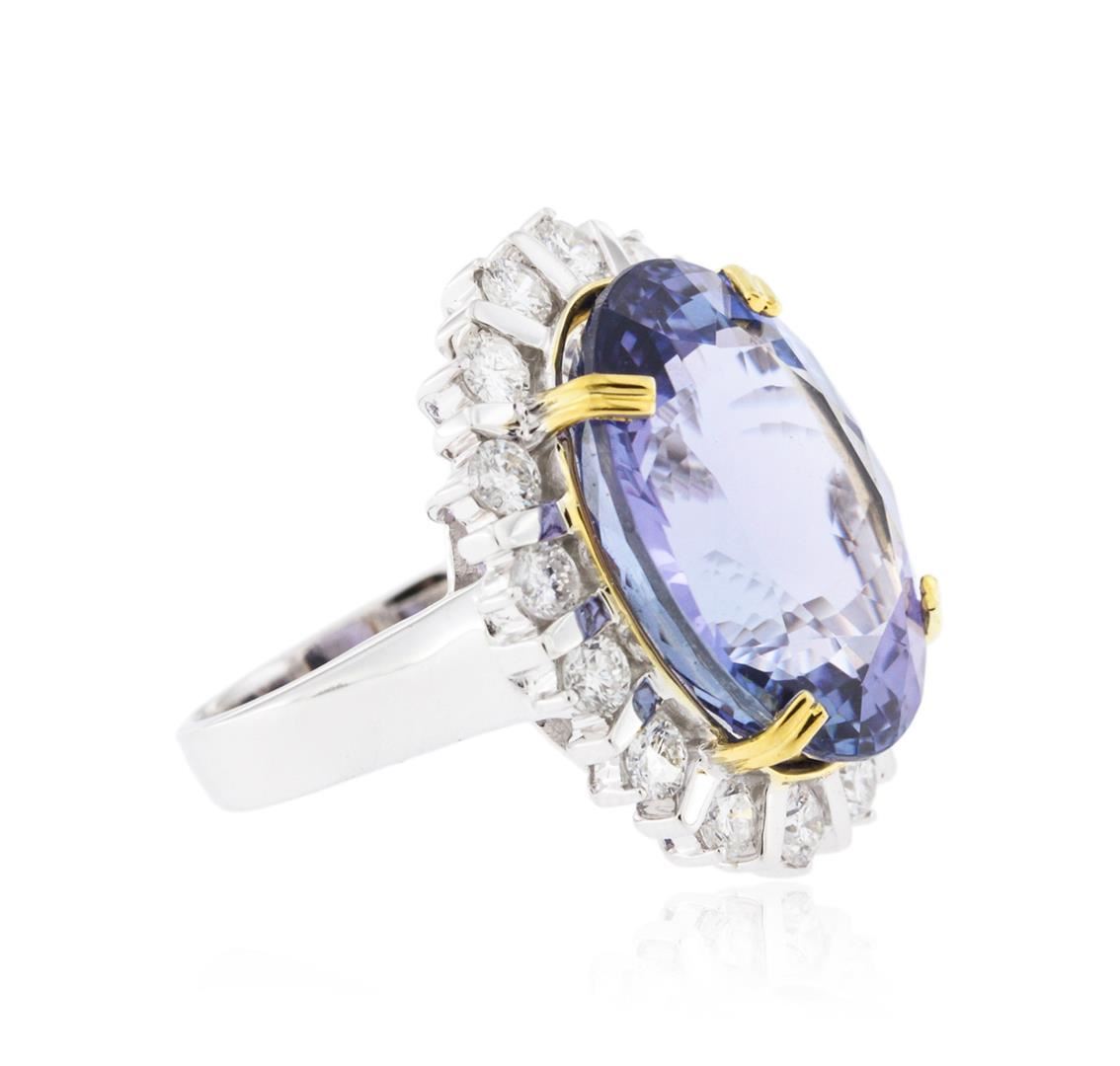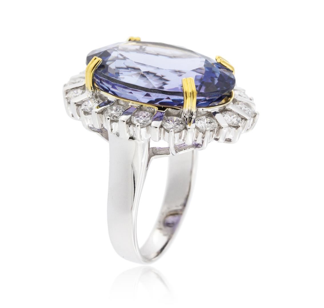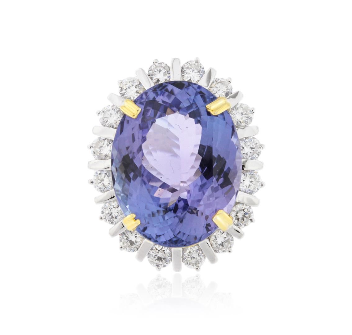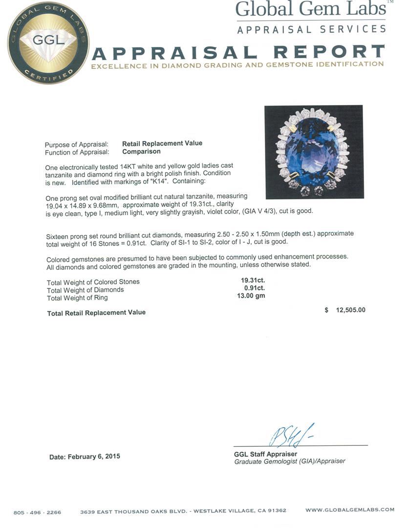 One electronically tested 14KT white and yellow gold ladies cast tanzanite and diamond ring with a bright polish finish. Identified with markings of "K14". Condition is new. Containing: One prong set oval modified brilliant cut natural tanzanite, measuring 19.04 x 14.89 x 9.68mm, approximate weight of 19.31ct., clarity is eye clean, type I, medium light, very slightly grayish, violet color, (GIA V 4/3), cut is good. Sixteen prong set round brilliant cut diamonds, measuring 2.50 - 2.50 x 1.50mm (depth est.) approximate. total weight of 16 Stones = 0.91ct. Clarity: SI-1 to SI-2. Color: I - J, Cut is Good. Colored gemstones are presumed to have been subjected to commonly used enhancement processes. All diamonds and colored gemstones are graded in the mounting, unless otherwise stated. Total Weight of Colored Stones 19.31ct. Total Weight of Diamonds 0.91ct. Total Weight of Ring 13.00 grams. GGL Appraised at $12,505.00.
