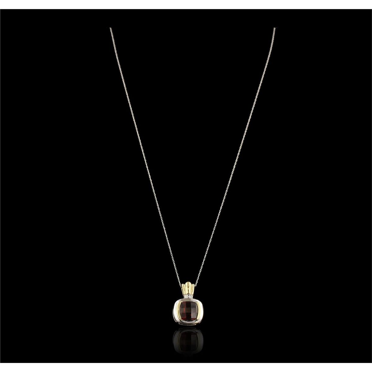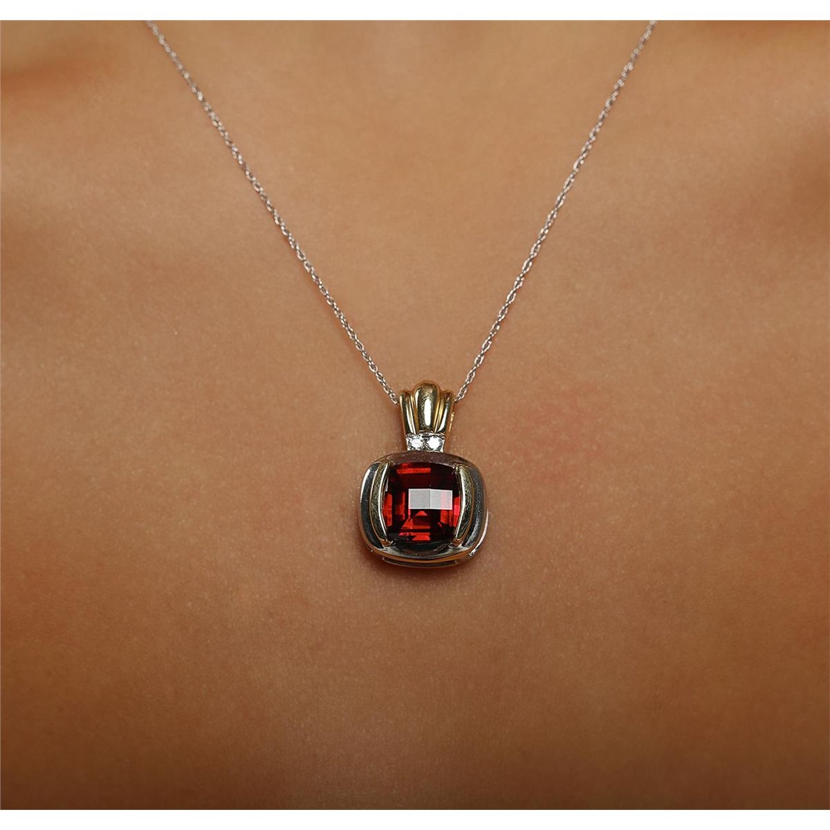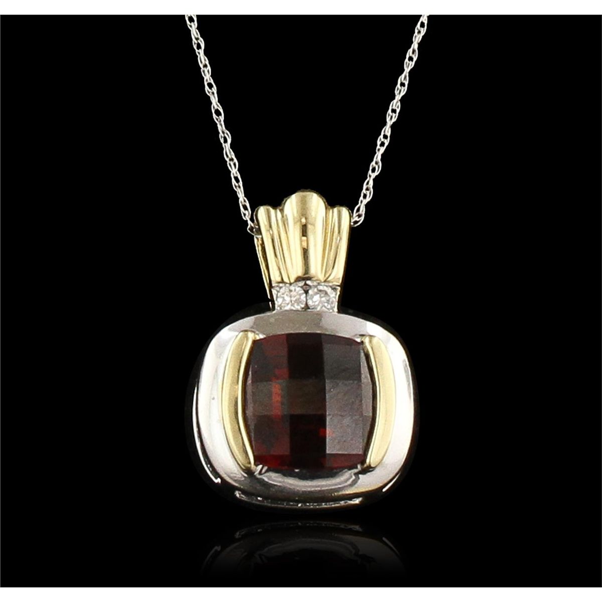 One pendant with chain featuring: 5.10 grams of 14KT two-tone gold, (1) 2.00ct garnet and 0.10cts of diamonds.