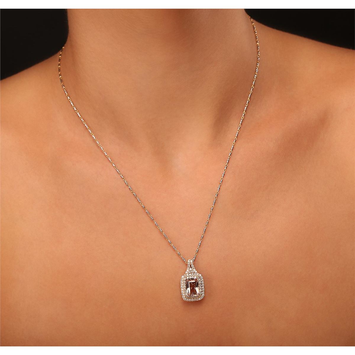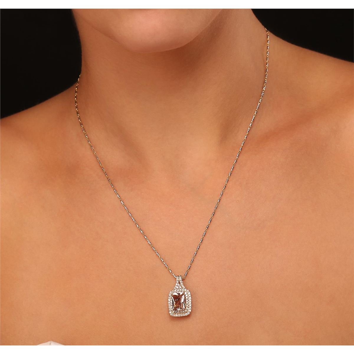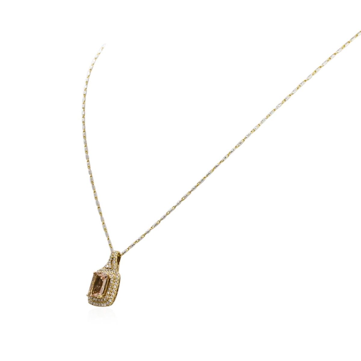 One electronically tested 14KT white and yellow gold Ladies combination cast & assembled pendant & chain 17.5" long, light open cable link with a lobster claw clasp with a bright polish finish. Identified with markings of "14K". Condition is new. Containing: One prong set rectangular cushion modified brilliant cut natural morganite, measuring 9.89 x 7.01 x 4.30mm, approximate weight of 2.02ct., clarity is eye clean, type I, light, brownish, reddish orange color, (GIA rO 3/1), cut is very good. Colored gemstones are presumed to have been subjected to commonly used color/clarity enhancement processes. Sixty-Six prong set round brilliant cut diamonds, measuring 1.30 - 1.30 x 0.78mm (depth est.) approximate. Total Weight of 66 Stones = 0.53ct. Clarity: I-1 to I-2. Color: H - I, Cut is Good. Total Weight of Colored Stones 2.02ct. Total Weight of Diamonds 0.53ct. Total Weight of Pendant & Chain 7.80 grams. GGL Appraised at $6,145.00.