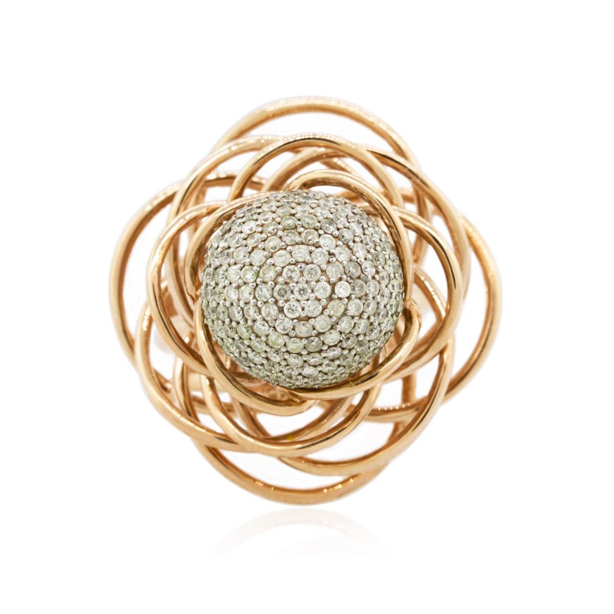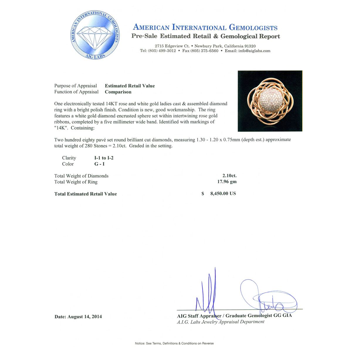 One electronically tested 14KT rose and white gold ladies cast & assembled diamond ring with a bright polish finish. Condition is new, good workmanship. The ring features a white gold diamond encrusted sphere set within intertwining rose gold ribbons, completed by a five millimeter wide band. Identified with markings of "14K". Containing: Two Hundred Eighty pav‚ set round brilliant cut diamonds, measuring 1.30 - 1.20 x 0.75mm (depth est.) approximate. Total Weight of 280 Stones = 2.10ct. Graded in the setting. Clarity: I-1 to I-2. Color: G - I. Total Weight of Diamonds 2.10ct. Total Weight of Ring 17.96gm. AIG Appraised at $8,450.00.
