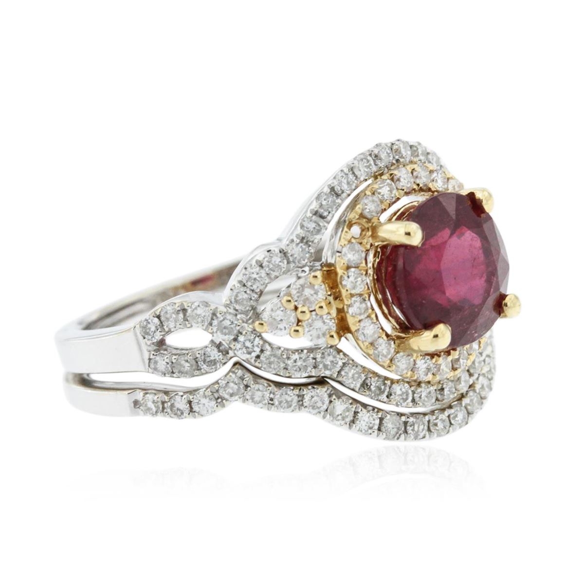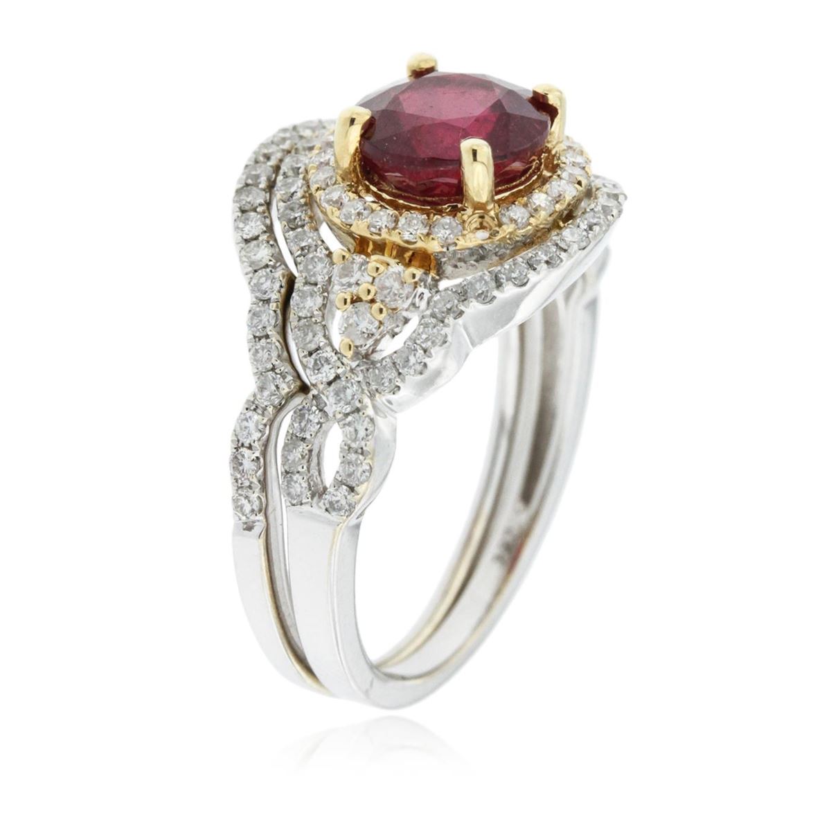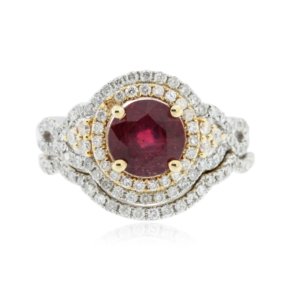 One electronically tested 14KT white and yellow gold Ladies combination cast & assembled wedding ring & wedding band with a bright polish finish. Condition is new. Identified with markings of "14K". Containing: Six prong set round brilliant cut diamonds, measuring 1.30 - 1.30 x 1.30mm (depth est.) approximate. Total Weight of 6 Stones = 0.08ct. Clarity: I-2 to I-3. Color: I - J, Cut is Very Good. Eighty-Seven prong set round brilliant cut diamonds, measuring 1.10 - 1.10 x 0.66mm (depth est.) approximate. Total Weight of 87 Stones = 1.50ct. Clarity: I-2 to I-3. Color: H - I, Cut is Good. One prong set round modified brilliant cut natural ruby, measuring 7.20 - 7.20 x 5.00 mm, exact weight 2.20ct., clarity is heavily included, type II, medium dark, moderately strong, strongly purplish red color, (GIA stpR 6/4), cut is good. Colored gemstones are presumed to have been subjected to commonly used color/clarity enhancement processes. Total Weight of Colored Stones 2.20ct. Total Weight of Diamonds 1.58ct. Total Weight of Ring & Wedding Band 5.90 grams. GGL Appraised at $5,065.00.