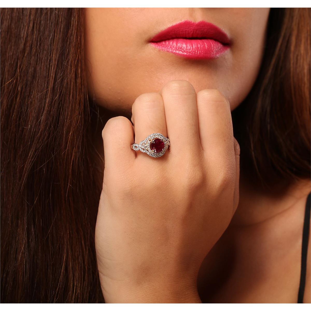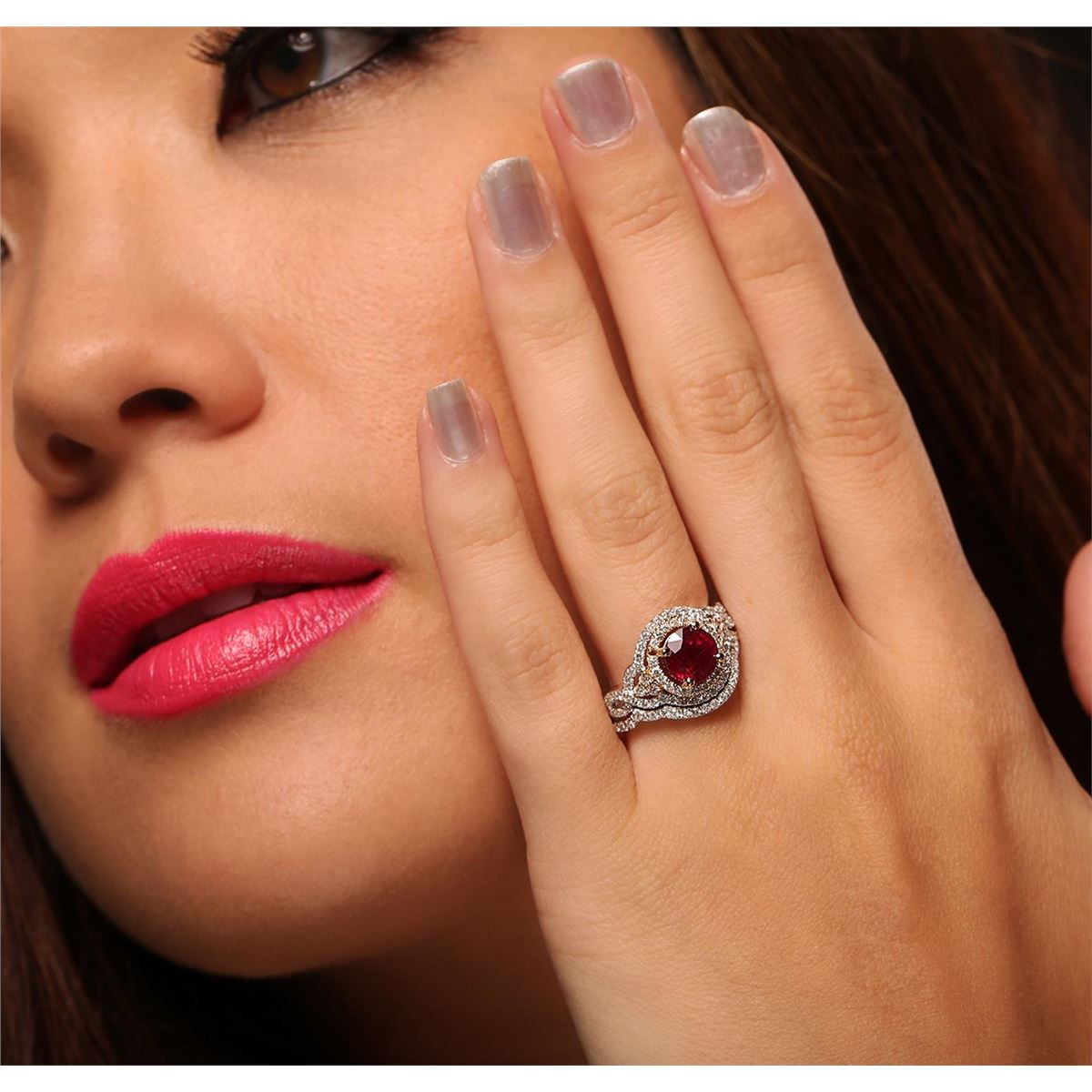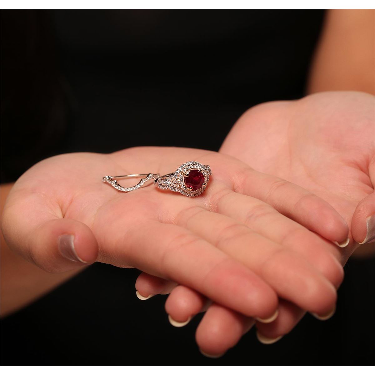 One electronically tested 14KT white and yellow gold Ladies combination cast & assembled wedding ring & wedding band with a bright polish finish. Condition is new. Identified with markings of "14K". Containing: Six prong set round brilliant cut diamonds, measuring 1.30 - 1.30 x 1.30mm (depth est.) approximate. Total Weight of 6 Stones = 0.08ct. Clarity: I-2 to I-3. Color: I - J, Cut is Very Good. Eighty-Seven prong set round brilliant cut diamonds, measuring 1.10 - 1.10 x 0.66mm (depth est.) approximate. Total Weight of 87 Stones = 1.50ct. Clarity: I-2 to I-3. Color: H - I, Cut is Good. One prong set round modified brilliant cut natural ruby, measuring 7.20 - 7.20 x 5.00 mm, exact weight 2.20ct., clarity is heavily included, type II, medium dark, moderately strong, strongly purplish red color, (GIA stpR 6/4), cut is good. Colored gemstones are presumed to have been subjected to commonly used color/clarity enhancement processes. Total Weight of Colored Stones 2.20ct. Total Weight of Diamonds 1.58ct. Total Weight of Ring & Wedding Band 5.90 grams. GGL Appraised at $5,065.00.