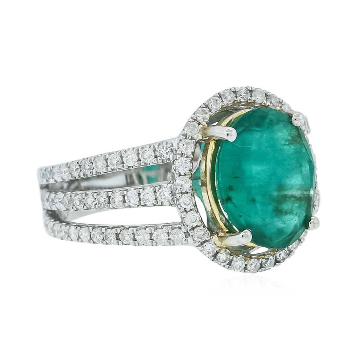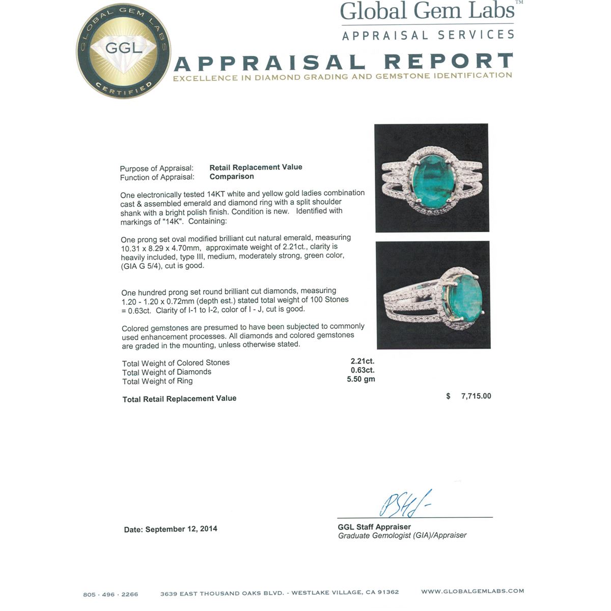 One electronically tested 14KT white and yellow gold ladies combination cast & assembled emerald and diamond ring with a split shoulder shank with a bright polish finish. Identified with markings of "14K". Condition is new. Containing: One prong set oval modified brilliant cut natural emerald, measuring 10.31 x 8.29 x 4.70mm, approximate weight of 2.21ct., clarity is heavily included, type III, medium, moderately strong, green color, (GIA G 5/4), cut is good. One Hundred prong set round brilliant cut diamonds, measuring 1.20 - 1.20 x 0.72mm (depth est.) stated total weight of 100 Stones = 0.63ct. Clarity: I-1 to I-2. Color: I - J, Cut is Good. Colored gemstones are presumed to have been subjected to commonly used enhancement processes. All diamonds and colored gemstones are graded in the mounting, unless otherwise stated total weight of Colored Stones 2.21ct. Total Weight of Diamonds 0.63ct. Total Weight of Ring 5.50 grams. GGL Appraised at $7,715.00.