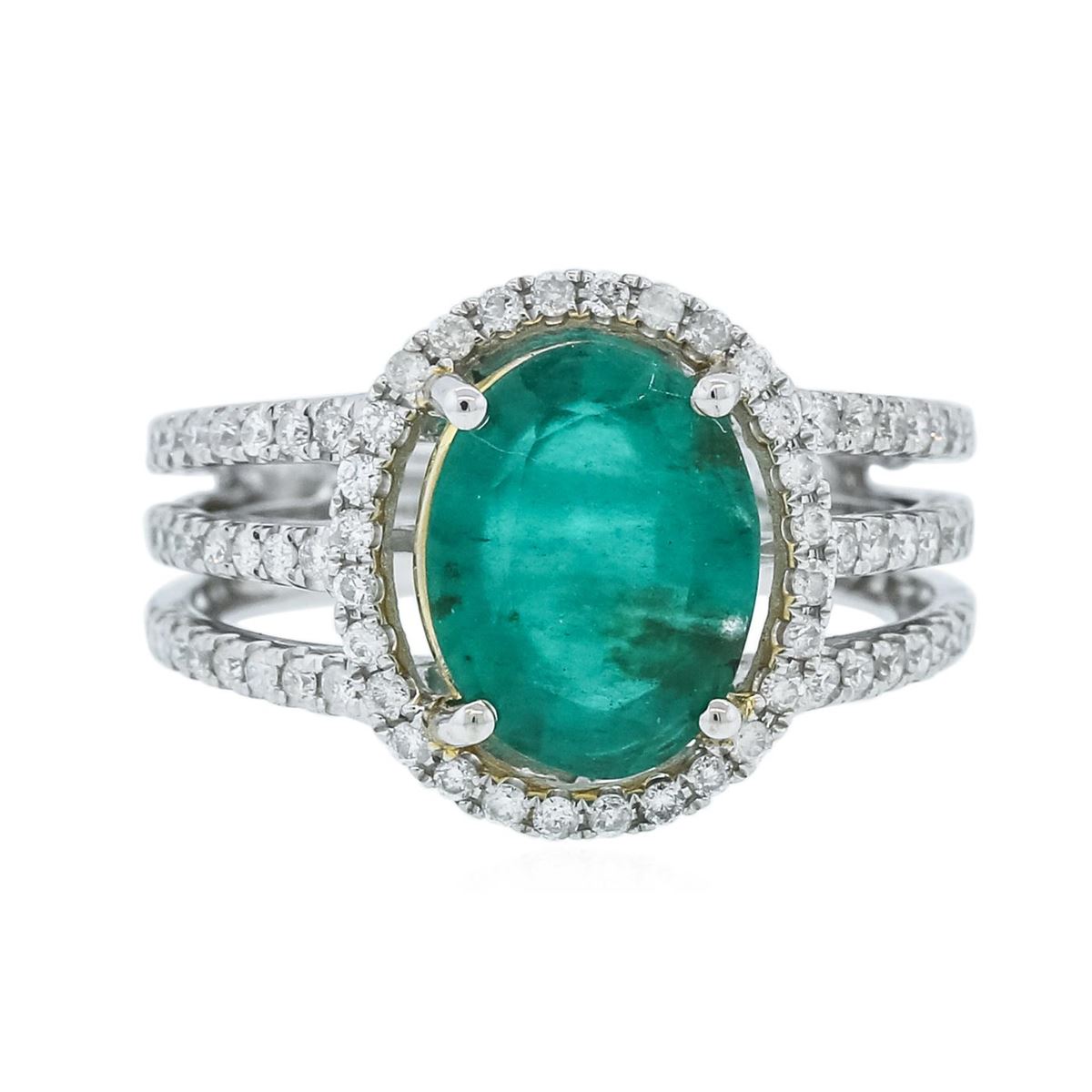 One electronically tested 14KT white and yellow gold ladies combination cast & assembled emerald and diamond ring with a split shoulder shank with a bright polish finish. Identified with markings of "14K". Condition is new. Containing: One prong set oval modified brilliant cut natural emerald, measuring 10.31 x 8.29 x 4.70mm, approximate weight of 2.21ct., clarity is heavily included, type III, medium, moderately strong, green color, (GIA G 5/4), cut is good. One Hundred prong set round brilliant cut diamonds, measuring 1.20 - 1.20 x 0.72mm (depth est.) stated total weight of 100 Stones = 0.63ct. Clarity: I-1 to I-2. Color: I - J, Cut is Good. Colored gemstones are presumed to have been subjected to commonly used enhancement processes. All diamonds and colored gemstones are graded in the mounting, unless otherwise stated total weight of Colored Stones 2.21ct. Total Weight of Diamonds 0.63ct. Total Weight of Ring 5.50 grams. GGL Appraised at $7,715.00.