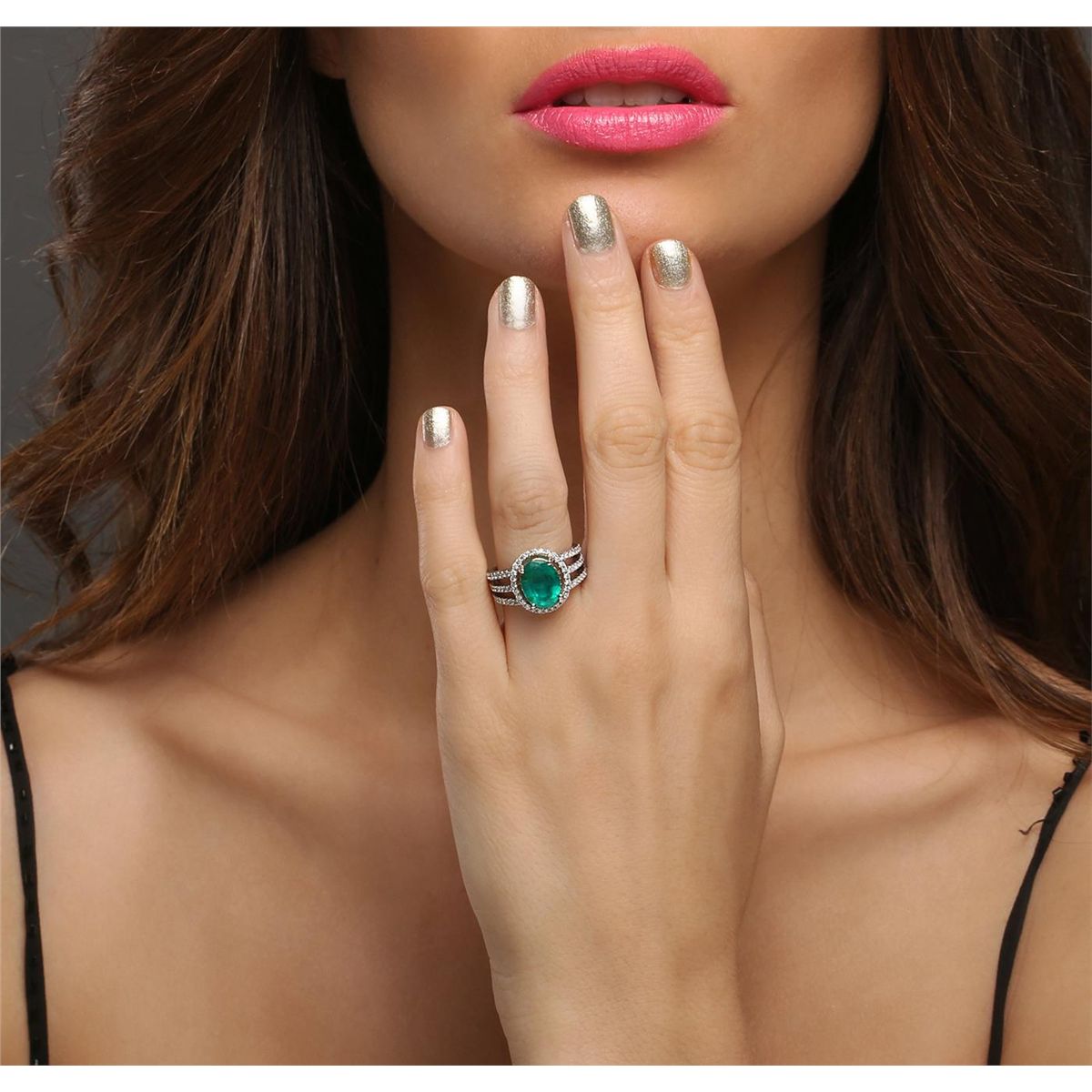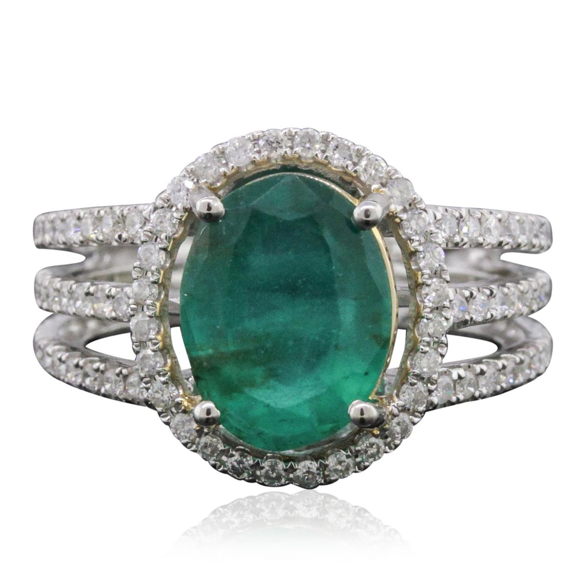 One electronically tested 14KT white and yellow gold ladies combination cast & assembled emerald and diamond ring with a split shoulder shank with a bright polish finish. Identified with markings of "14K". Condition is new. Containing: One prong set oval modified brilliant cut natural emerald, measuring 10.31 x 8.29 x 4.70mm, approximate weight of 2.21ct., clarity is heavily included, type III, medium, moderately strong, green color, (GIA G 5/4), cut is good. One Hundred prong set round brilliant cut diamonds, measuring 1.20 - 1.20 x 0.72mm (depth est.) stated total weight of 100 Stones = 0.63ct. Clarity: I-1 to I-2. Color: I - J, Cut is Good. Colored gemstones are presumed to have been subjected to commonly used enhancement processes. All diamonds and colored gemstones are graded in the mounting, unless otherwise stated total weight of Colored Stones 2.21ct. Total Weight of Diamonds 0.63ct. Total Weight of Ring 5.50 grams. GGL Appraised at $7,715.00.