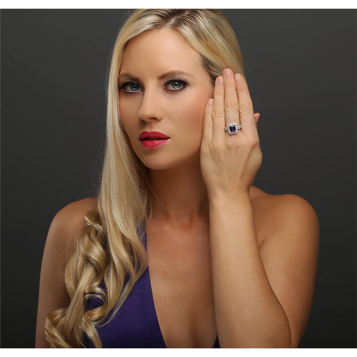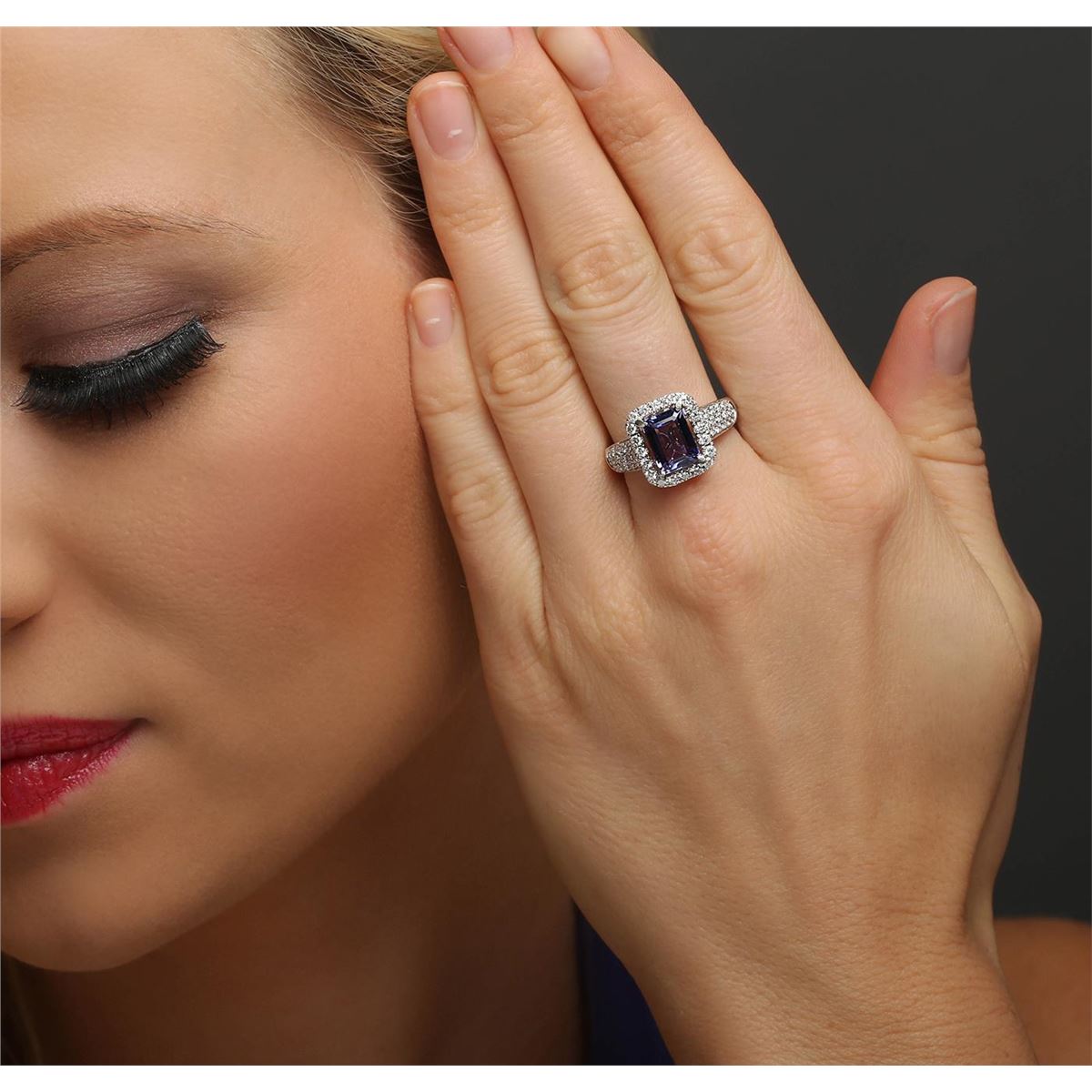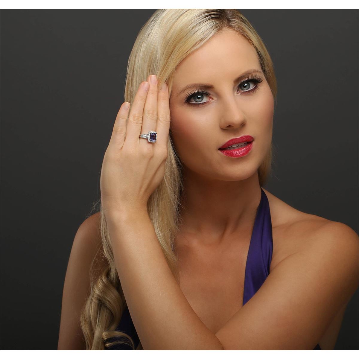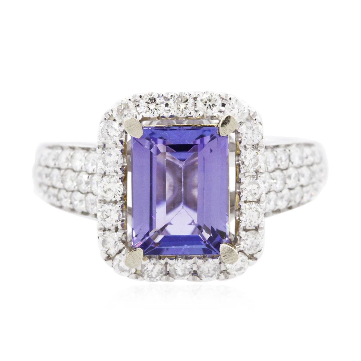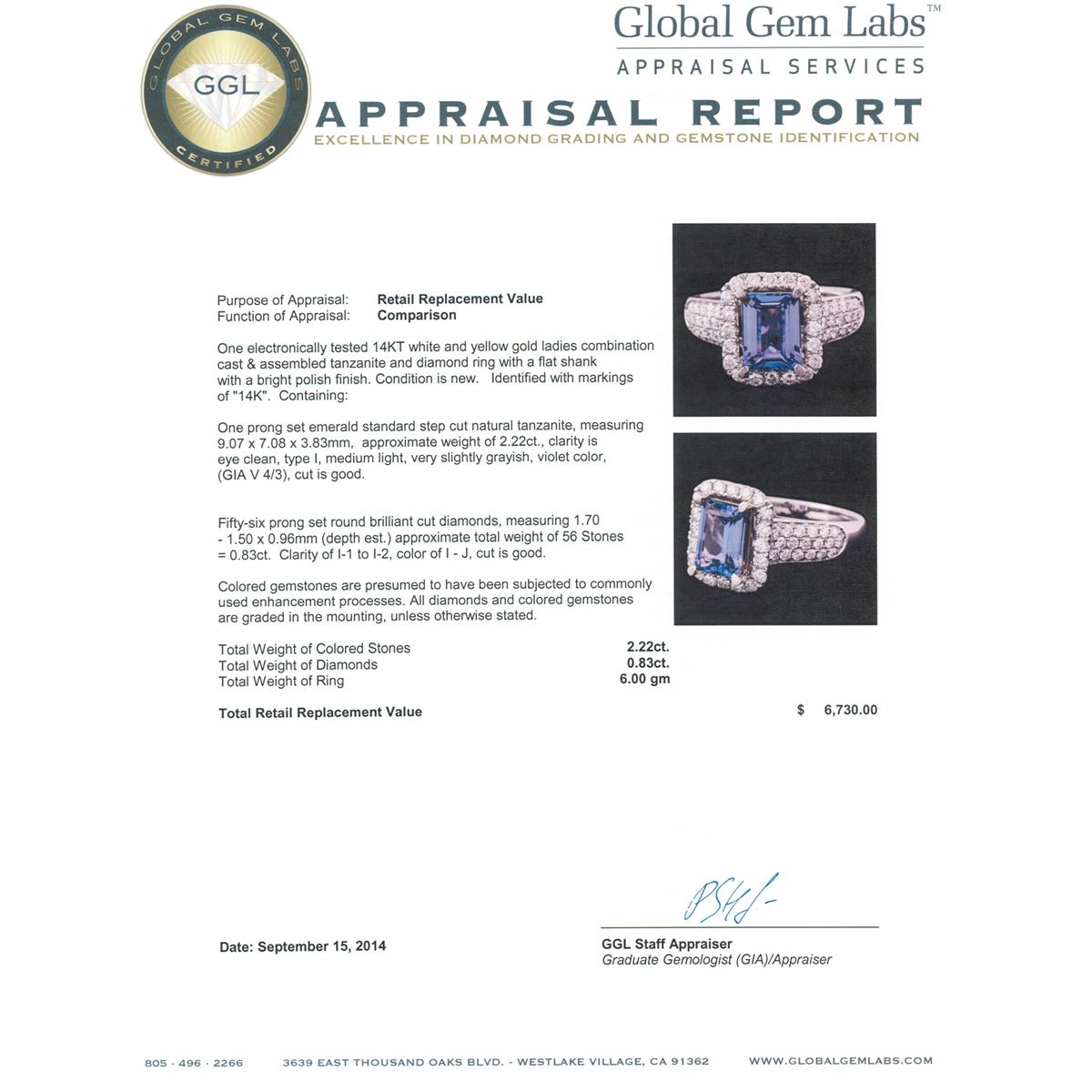 One electronically tested 14KT white and yellow gold ladies combination cast & assembled tanzanite and diamond ring with a flat shank with a bright polish finish. Identified with markings of "14K". Condition is new. Containing: One prong set emerald standard step cut natural tanzanite, measuring 9.07 x 7.08 x 3.83mm, approximate weight of 2.22ct., clarity is eye clean, type I, medium light, very slightly grayish, violet color, (GIA V 4/3), cut is good. Fifty-Six prong set round brilliant cut diamonds, measuring 1.70 - 1.50 x 0.96mm (depth est.) approximate total weight of 56 Stones = 0.83ct. Clarity: I-1 to I-2. Color: I - J, Cut is Good. Colored gemstones are presumed to have been subjected to commonly used enhancement processes. All diamonds and colored gemstones are graded in the mounting, unless otherwise stated total weight of Colored Stones 2.22ct. Total Weight of Diamonds 0.83ct. Total Weight of Ring 6.00 grams. GGL Appraised at $6,730.00.