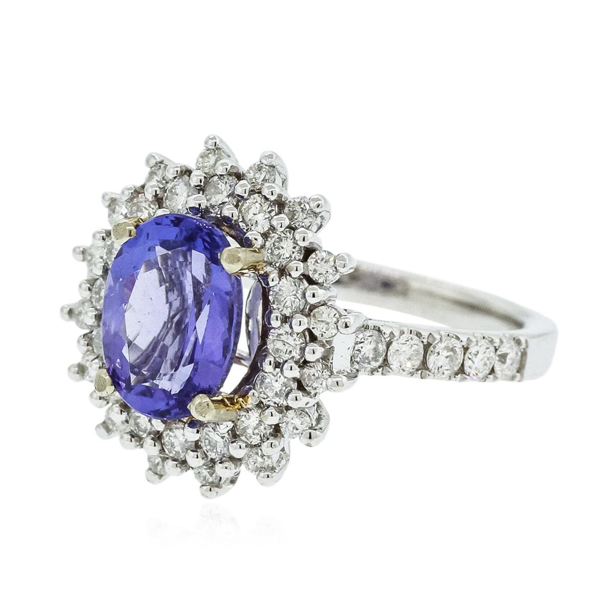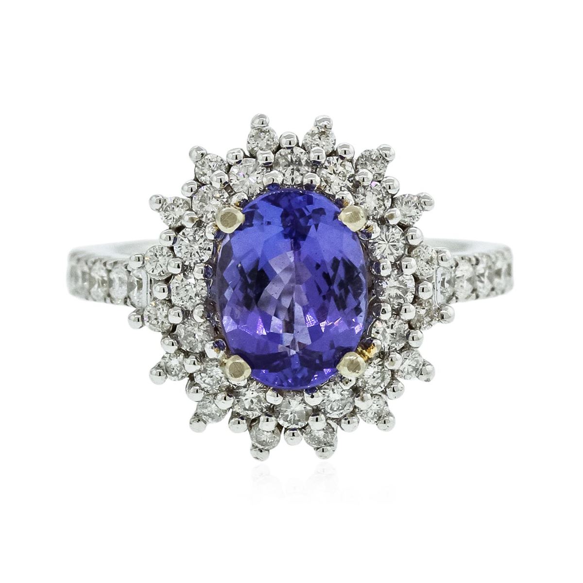 One electronically tested 14KT white and yellow gold Ladies combination cast & assembled ring with a bright polish finish. Identified with markings of "14K". Condition is excellent. Containing: One prong set oval modified brilliant cut natural tanzanite, measuring 9.50 x 7.30 x 4.75mm, approximate weight of 2.25ct., clarity is eye clean, type I, medium light, moderately strong, bluish violet color, (GIA bV 4/4), cut is good. Colored gemstones are presumed to have been subjected to commonly used and possible undetectable color/clarity enhancement processes. Forty-Two prong set round brilliant cut diamonds, measuring 2.00 - 1.50 x 1.05mm (depth est.) approximate total weight of 42 Stones = 1.00ct. Clarity of SI-2 to I-1, Color of G - H. Total Weight of Colored Stones 2.25ct. Total Weight of Diamonds 1.00ct. Total Weight of Ring 6.40gm. GGL Appraised at $7,405.00.
