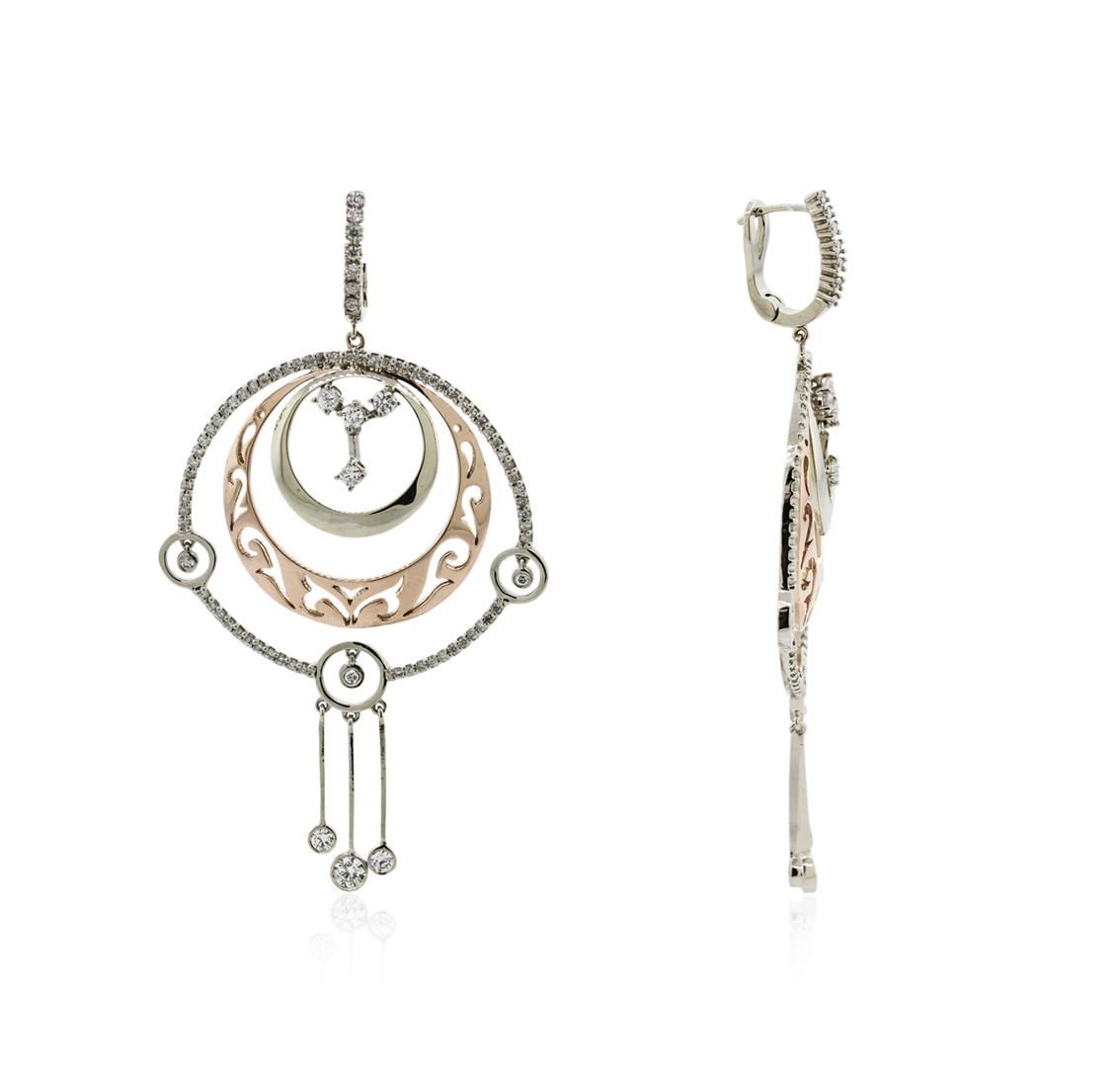 One pair electronically tested 14KT white and rose gold ladies cast diamond earrings with Omega clip backs with a bright polish finish. Identified with markings of "585". Condition is new. Containing: One Hundred Seventy prong set round brilliant cut diamonds, measuring 2.50 - 1.30 x 1.14mm (depth est.) approximate total weight of 170 Stones = 2.28ct. Clarity: SI-1 to I-1. Color: G - I, Cut is Good. All diamonds are graded in the mounting, unless otherwise stated. Total Weight of Diamonds 2.28ct. Total Weight of Earrings 19.40 grams. GGL Appraised at $4,535.00.