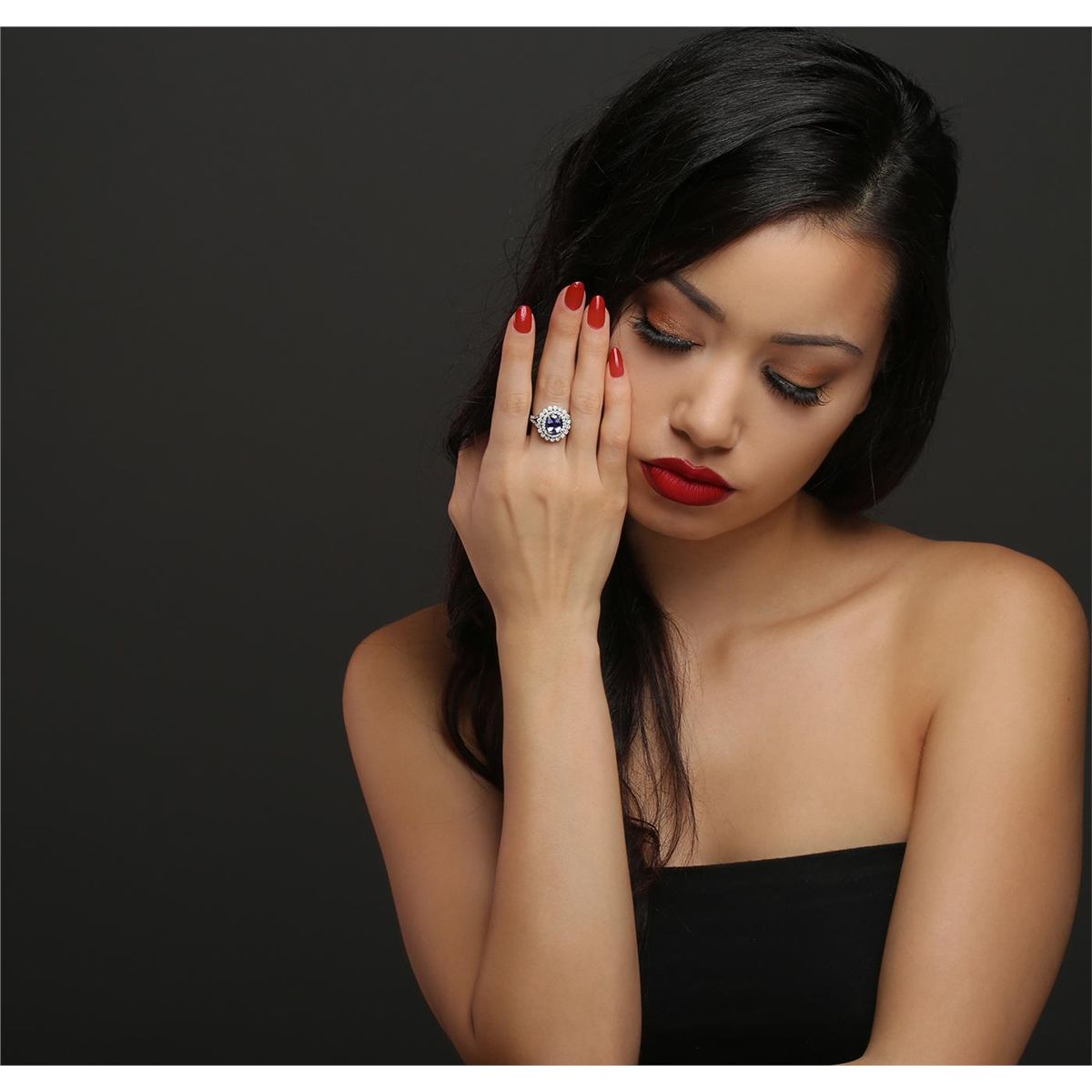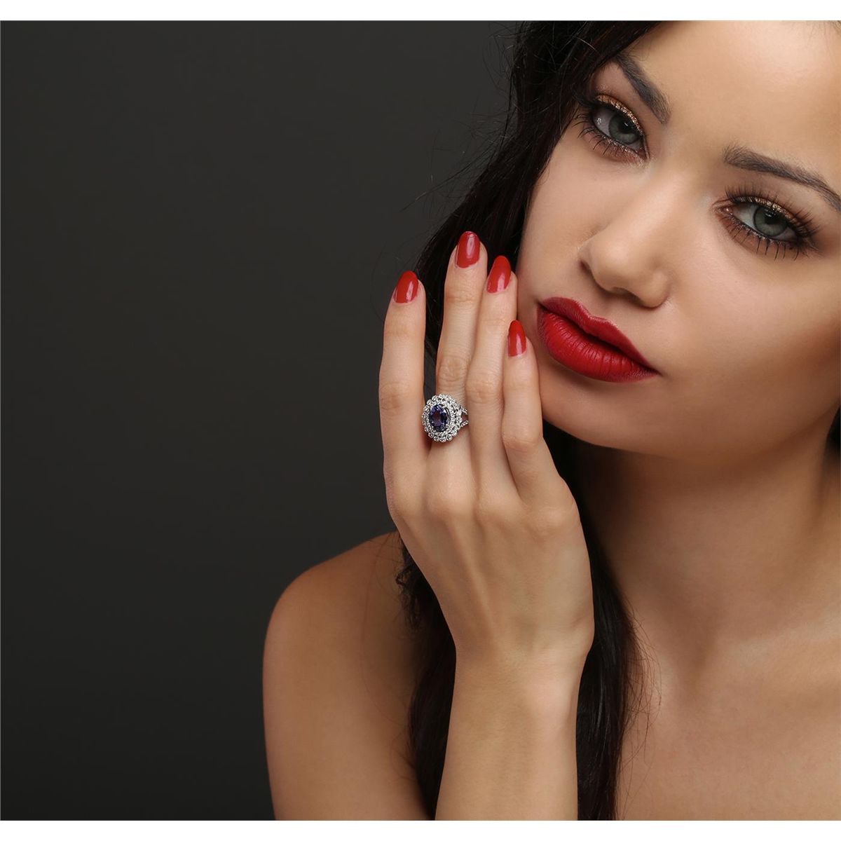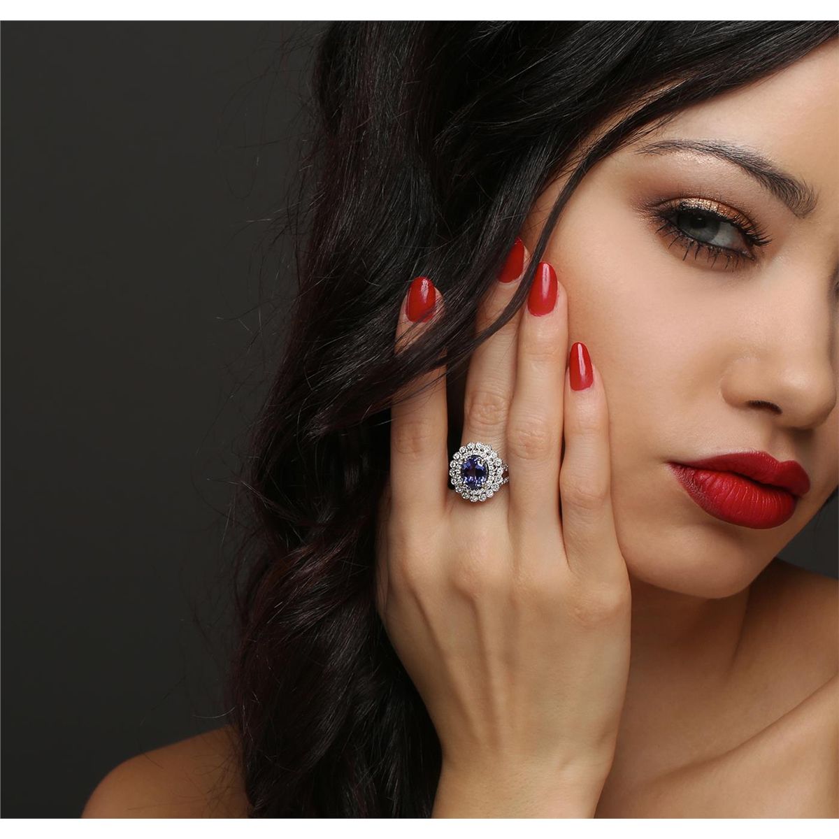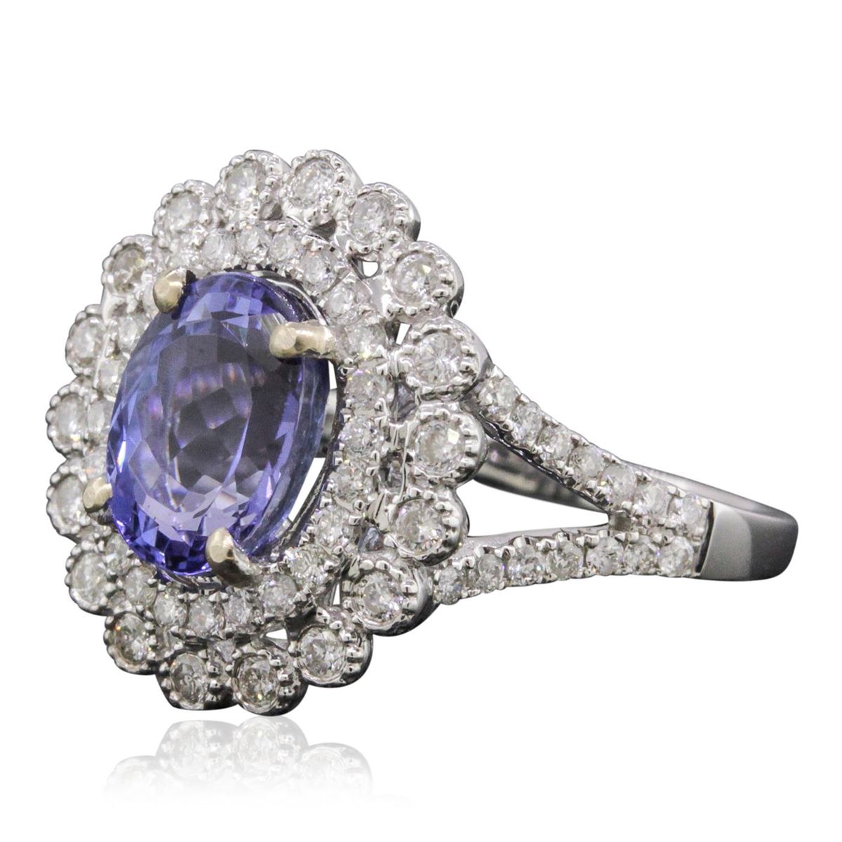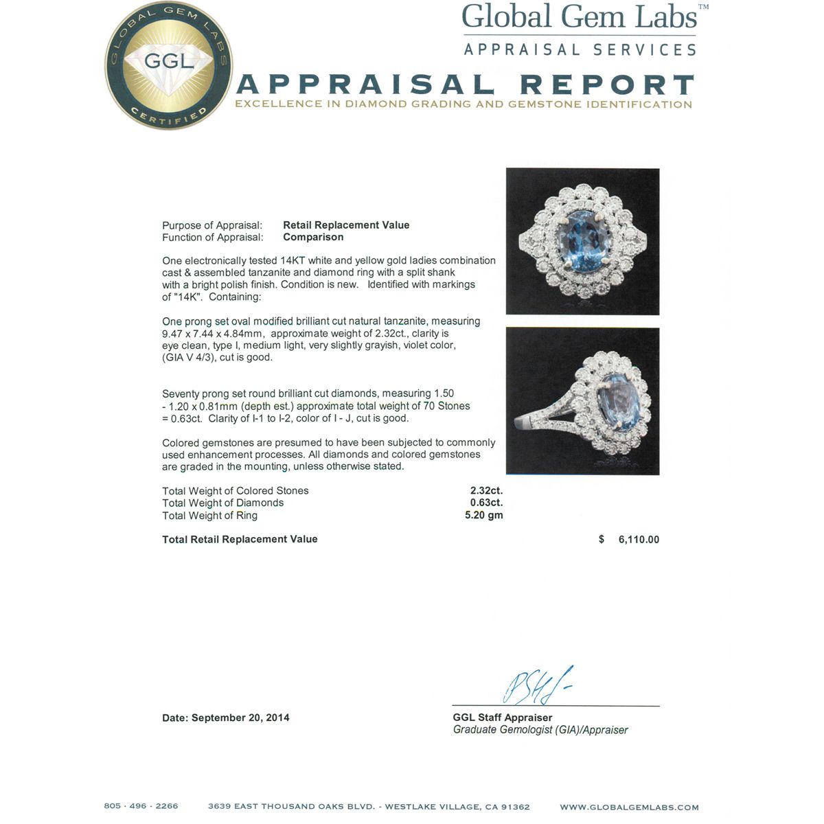 One electronically tested 14KT white and yellow gold ladies combination cast & assembled tanzanite and diamond ring with a split shank with a bright polish finish. Identified with markings of "14K". Condition is new. Containing: One prong set oval modified brilliant cut natural tanzanite, measuring 9.47 x 7.44 x 4.84mm, approximate weight of 2.32ct., clarity is eye clean, type I, medium light, very slightly grayish, violet color, (GIA V 4/3), cut is good. Seventy prong set round brilliant cut diamonds, measuring 1.50 - 1.20 x 0.81mm (depth est.) approximate total weight of 70 Stones = 0.63ct. Clarity: I-1 to I-2. Color: I - J, Cut is Good. Colored gemstones are presumed to have been subjected to commonly used enhancement processes. All diamonds and colored gemstones are graded in the mounting, unless otherwise stated. Total Weight of Colored Stones 2.32ct. Total Weight of Diamonds 0.63ct. Total Weight of Ring 5.20 grams. GGL Appraised at $6,110.00.