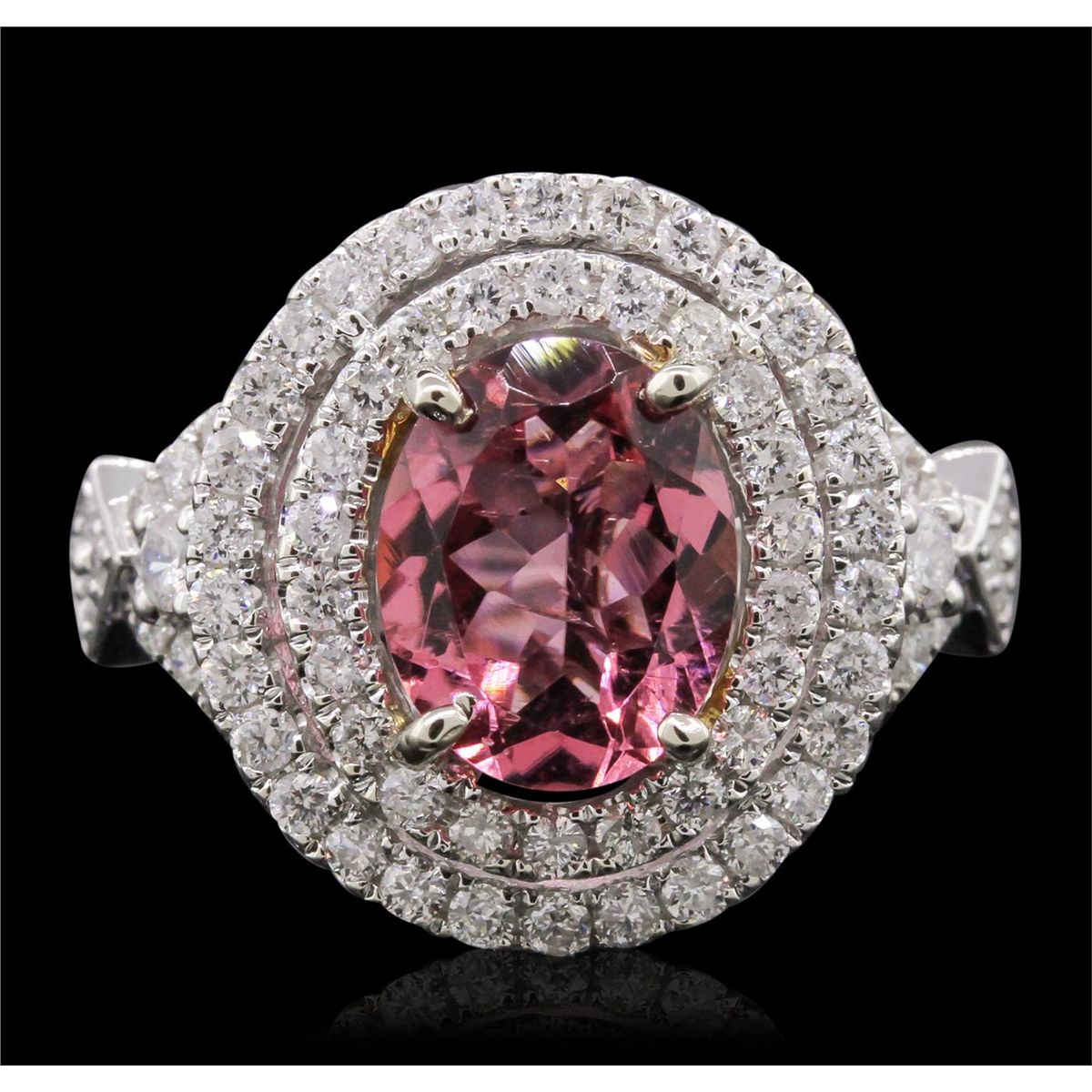 One electronically tested 14KT white and yellow gold Ladies combination cast & assembled ring with a high polish finish. Condition is new. Identified with markings of "14K". Containing: One prong set oval modified mixed cut natural pink tourmaline, measuring 10.00 x 8.00 x 4.00mm, approximate weight of 2.32ct., clarity is slightly included, type II, medium, moderately strong, reddish purple color, (GIA rP 5/4), cut is very good. Colored gemstones are presumed to have been subjected to commonly used color/clarity enhancement processes. Eight bead set round brilliant cut diamonds, measuring 1.00 - 1.00 x 0.60mm (depth est.) approximate. Total Weight of 8 Stones = 0.03ct. Clarity: SI-2 to I-1. Color: G - H, Cut is Good. Sixty-Eight prong set round brilliant cut diamonds, measuring 2.00 - 1.40 x 1.02mm (depth est.) approximate. Total Weight of 68 Stones = 1.11ct. Clarity: SI-2 to I-1. Color: G - H, Cut is Good. Total Weight of Colored Stones 2.32ct. Total Weight of Diamonds 1.14ct. Total Weight of Ring 6.00 grams. GGL Appraised at $7,760.00.