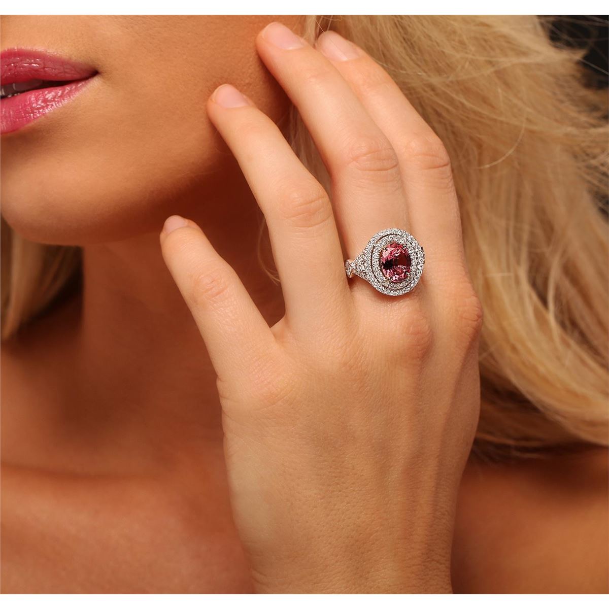 One electronically tested 14KT white and yellow gold Ladies combination cast & assembled ring with a high polish finish. Condition is new. Identified with markings of "14K". Containing: One prong set oval modified mixed cut natural pink tourmaline, measuring 10.00 x 8.00 x 4.00mm, approximate weight of 2.32ct., clarity is slightly included, type II, medium, moderately strong, reddish purple color, (GIA rP 5/4), cut is very good. Colored gemstones are presumed to have been subjected to commonly used color/clarity enhancement processes. Eight bead set round brilliant cut diamonds, measuring 1.00 - 1.00 x 0.60mm (depth est.) approximate. Total Weight of 8 Stones = 0.03ct. Clarity: SI-2 to I-1. Color: G - H, Cut is Good. Sixty-Eight prong set round brilliant cut diamonds, measuring 2.00 - 1.40 x 1.02mm (depth est.) approximate. Total Weight of 68 Stones = 1.11ct. Clarity: SI-2 to I-1. Color: G - H, Cut is Good. Total Weight of Colored Stones 2.32ct. Total Weight of Diamonds 1.14ct. Total Weight of Ring 6.00 grams. GGL Appraised at $7,760.00.