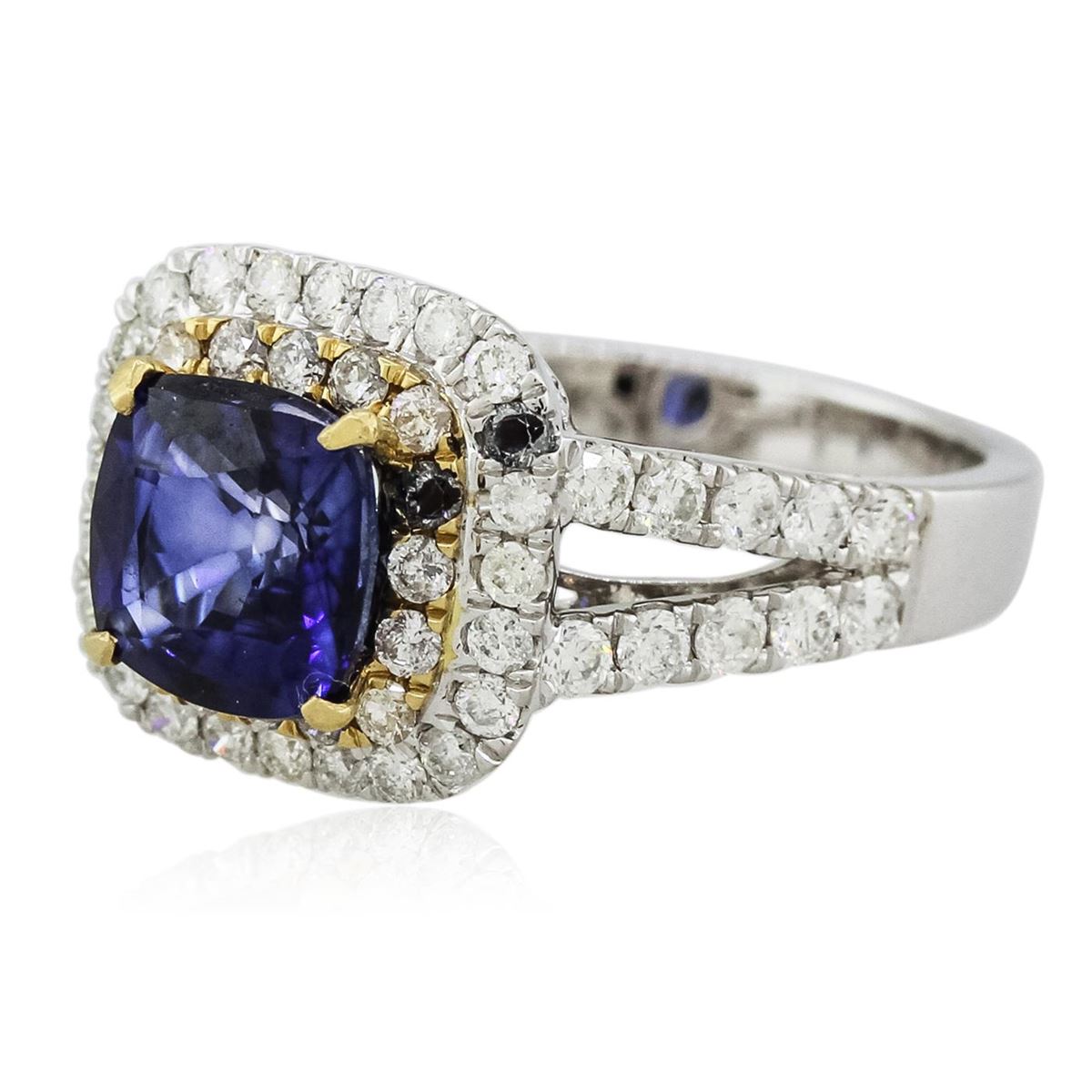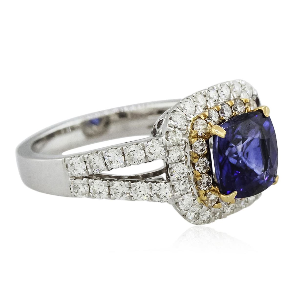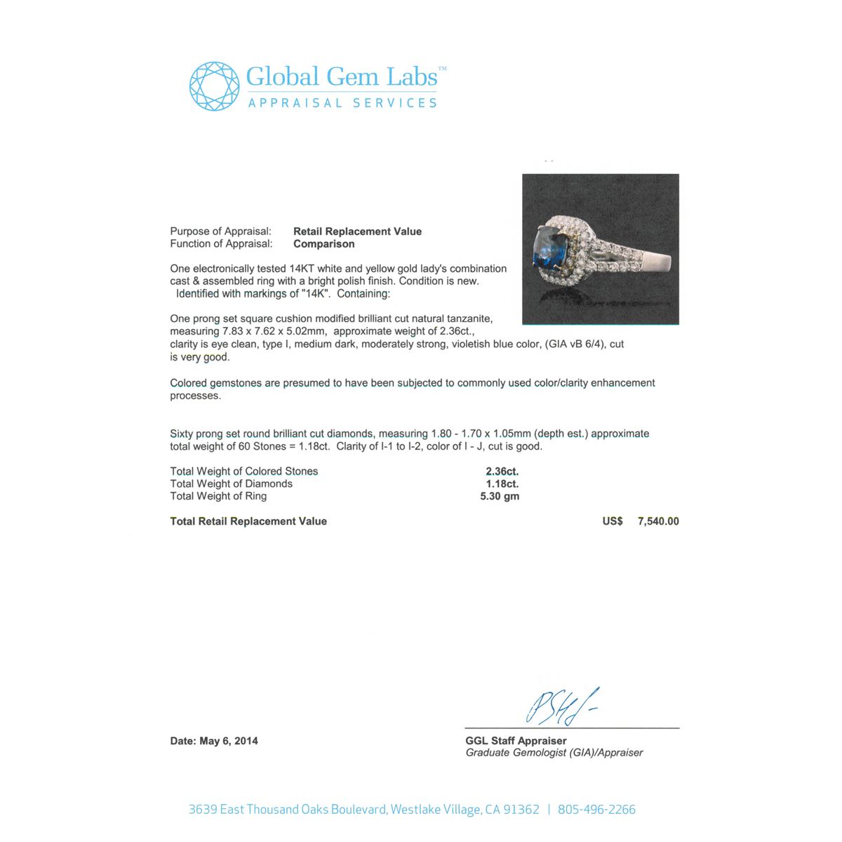 One electronically tested 14KT white and yellow gold Ladies combination cast & assembled ring with a bright polish finish. Condition is new. Identified with markings of "14K". Containing: One prong set square cushion modified brilliant cut natural tanzanite, measuring 7.83 x 7.62 x 5.02mm, approximate weight of 2.36ct., clarity is eye clean, type I, medium dark, moderately strong, violetish blue color, (GIA vB 6/4), cut is very good. Colored gemstones are presumed to have been subjected to commonly used color/clarity enhancement processes. Sixty prong set round brilliant cut diamonds, measuring 1.80 - 1.70 x 1.05mm (depth est.) approximate. Total Weight of 60 Stones = 1.18ct. . Clarity: I-1 to I-2. Color: I - J, Cut is Good. Total Weight of Colored Stones 2.36ct. Total Weight of Diamonds 1.18ct. Total Weight of Ring 5.30 grams. GGL Appraised at $7,540.00.