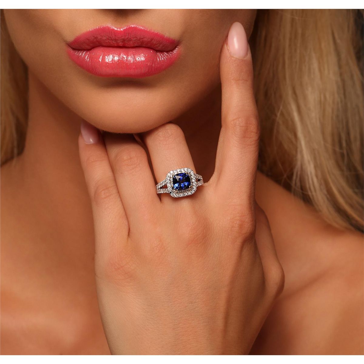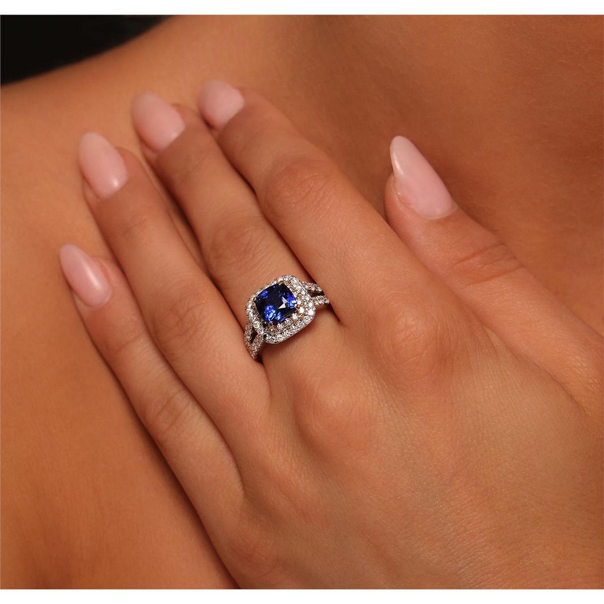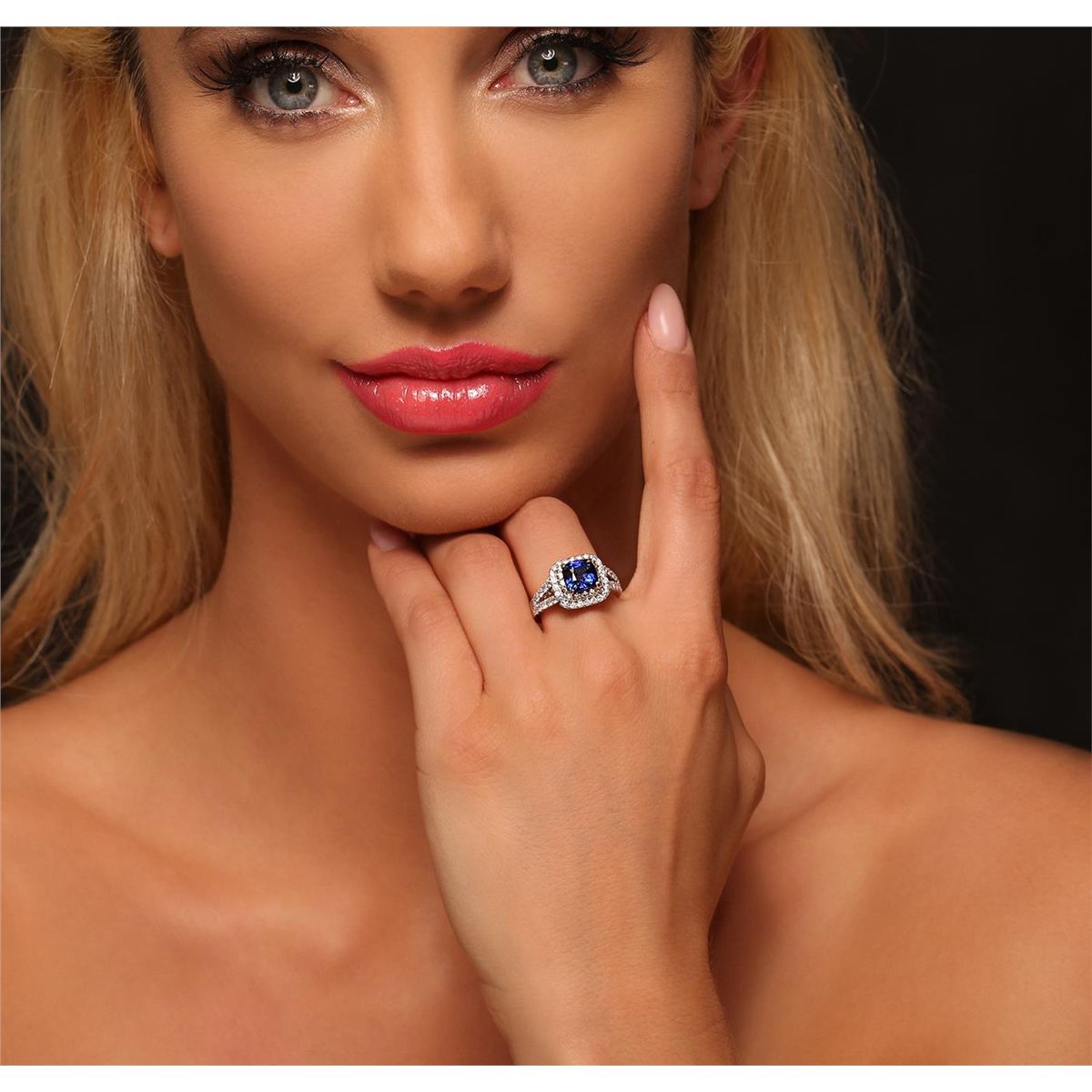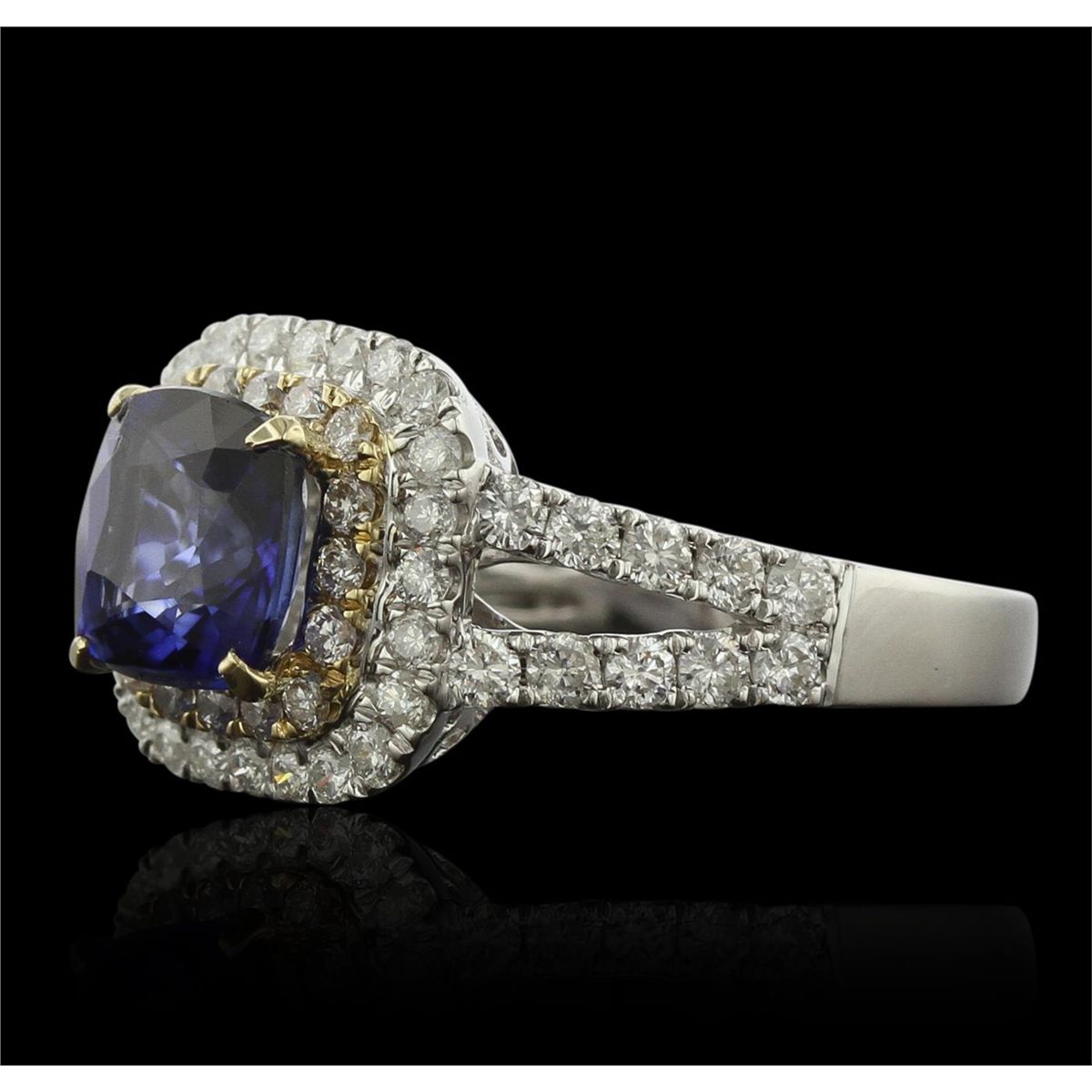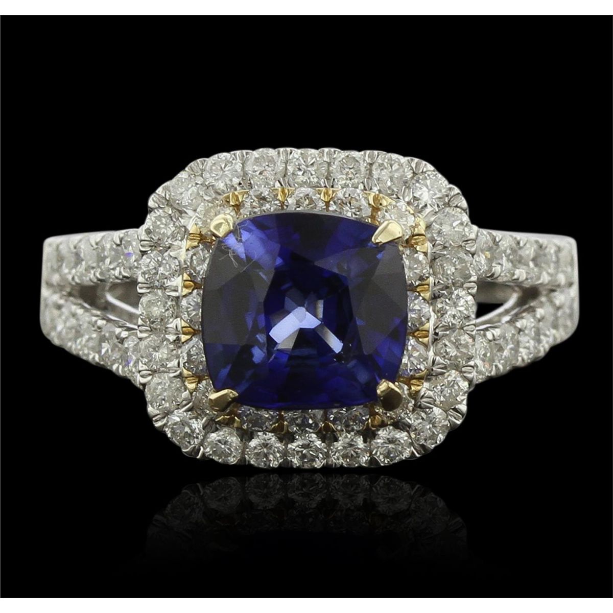 One electronically tested 14KT white and yellow gold Ladies combination cast & assembled ring with a bright polish finish. Condition is new. Identified with markings of "14K". Containing: One prong set square cushion modified brilliant cut natural tanzanite, measuring 7.83 x 7.62 x 5.02mm, approximate weight of 2.36ct., clarity is eye clean, type I, medium dark, moderately strong, violetish blue color, (GIA vB 6/4), cut is very good. Colored gemstones are presumed to have been subjected to commonly used color/clarity enhancement processes. Sixty prong set round brilliant cut diamonds, measuring 1.80 - 1.70 x 1.05mm (depth est.) approximate. Total Weight of 60 Stones = 1.18ct. . Clarity: I-1 to I-2. Color: I - J, Cut is Good. Total Weight of Colored Stones 2.36ct. Total Weight of Diamonds 1.18ct. Total Weight of Ring 5.30 grams. GGL Appraised at $7,540.00.