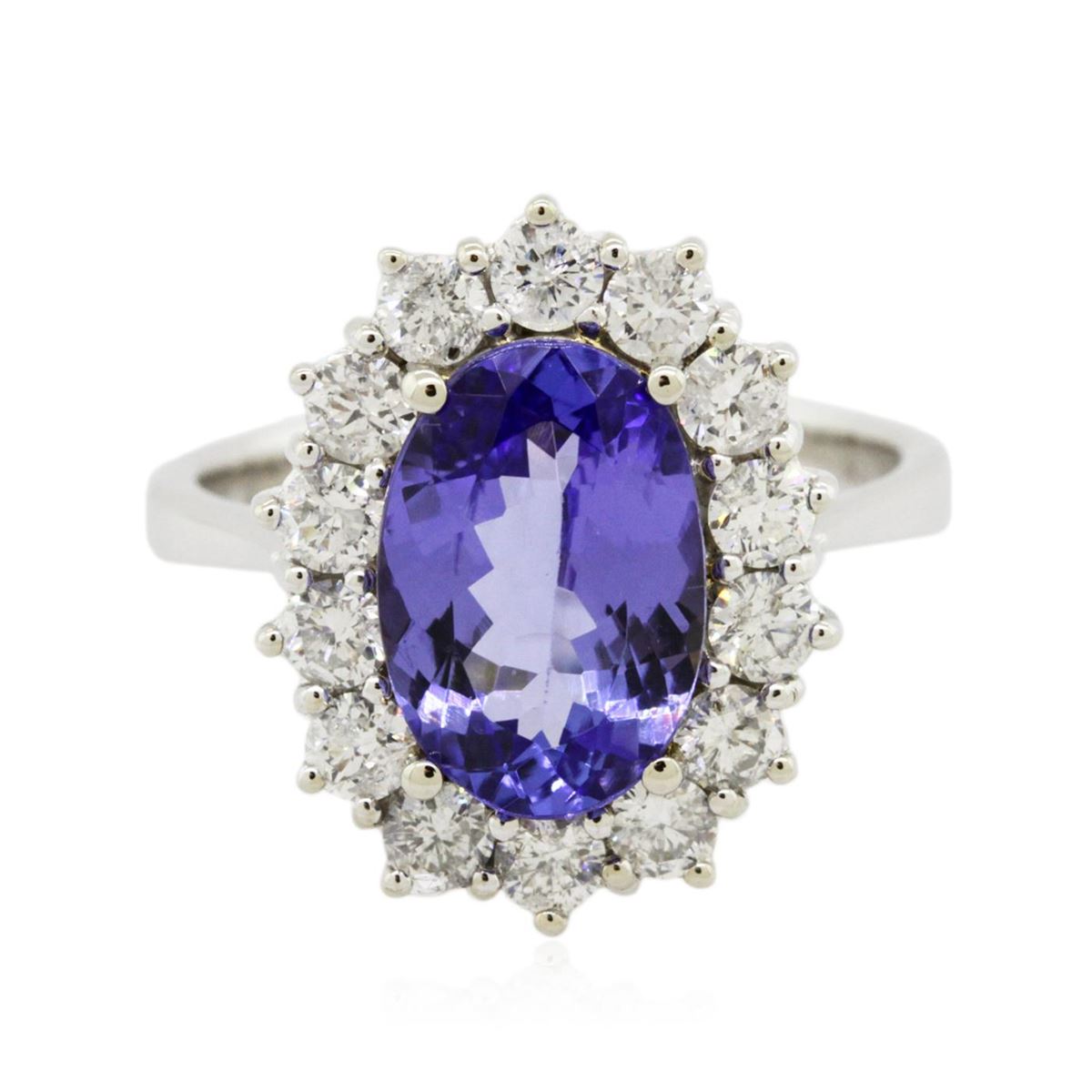One electronically tested 14KT white and yellow gold Ladies combination cast & assembled ring with a bright polish finish. Condition is new. Identified with markings of "14K". Containing: One prong set oval modified brilliant cut natural tanzanite, measuring 11.00 x 7.00 x 4.39mm, approximate weight of 2.38ct., clarity is eye clean, type I, medium, moderately strong, bluish violet color, (GIA bV 5/4), cut is good. Colored gemstones are presumed to have been subjected to commonly used color/clarity enhancement processes. Fourteen prong set round brilliant cut diamonds, measuring 2.50 - 2.50 x 1.50mm (depth est.) approximate. Total Weight of 14 Stones = 0.80ct. Clarity: I-1. Color: I - J, Cut is Good. Total Weight of Colored Stones 2.38ct. Total Weight of Diamonds 0.80ct. Total Weight of Ring 5.50 grams. GGL Appraised at $6,980.00.
