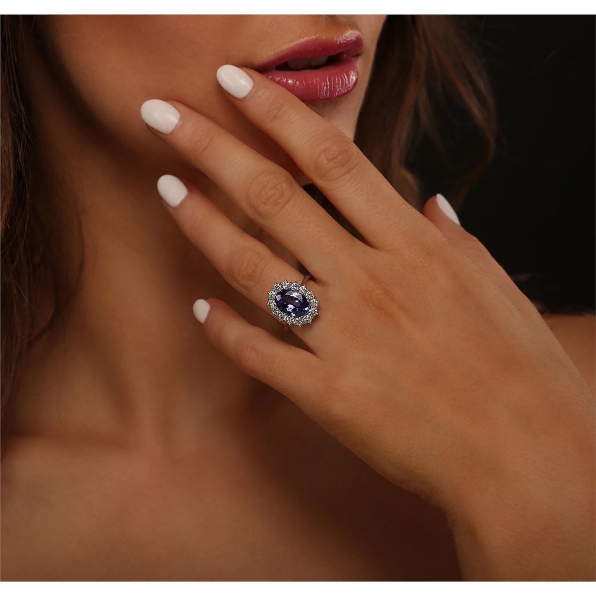 One electronically tested 14KT white and yellow gold Ladies combination cast & assembled ring with a bright polish finish. Condition is new. Identified with markings of "14K". Containing: One prong set oval modified brilliant cut natural tanzanite, measuring 11.00 x 7.00 x 4.39mm, approximate weight of 2.38ct., clarity is eye clean, type I, medium, moderately strong, bluish violet color, (GIA bV 5/4), cut is good. Colored gemstones are presumed to have been subjected to commonly used color/clarity enhancement processes. Fourteen prong set round brilliant cut diamonds, measuring 2.50 - 2.50 x 1.50mm (depth est.) approximate. Total Weight of 14 Stones = 0.80ct. Clarity: I-1. Color: I - J, Cut is Good. Total Weight of Colored Stones 2.38ct. Total Weight of Diamonds 0.80ct. Total Weight of Ring 5.50 grams. GGL Appraised at $6,980.00.