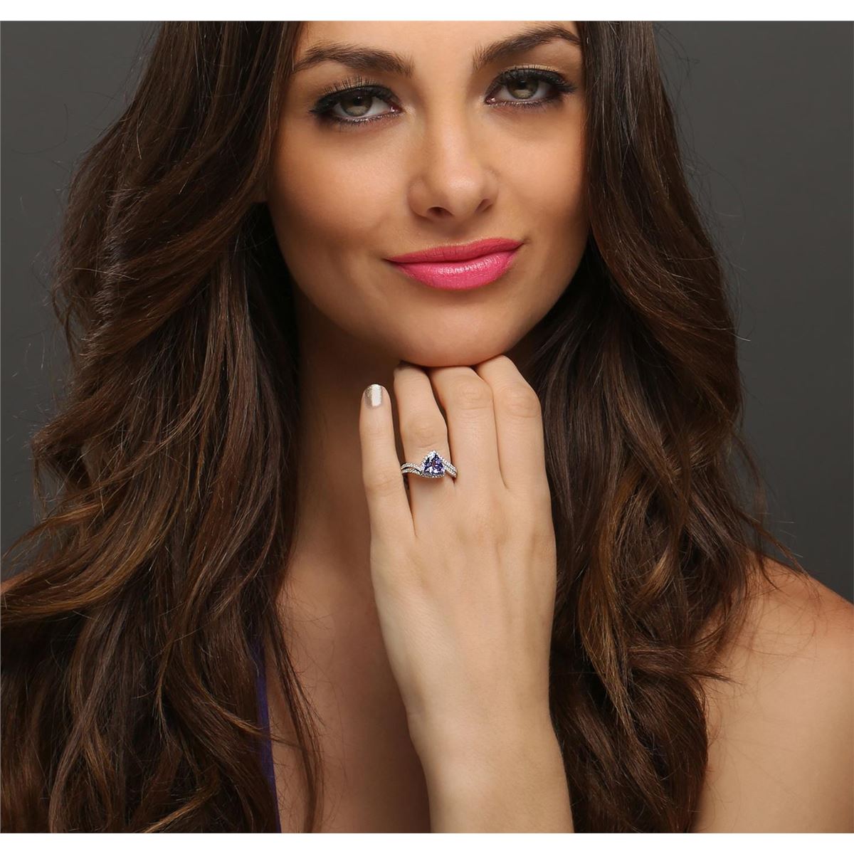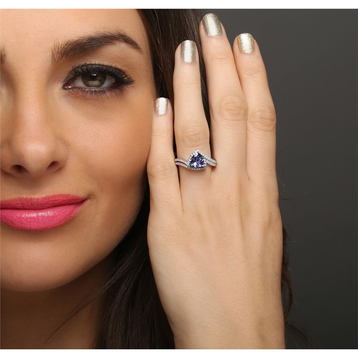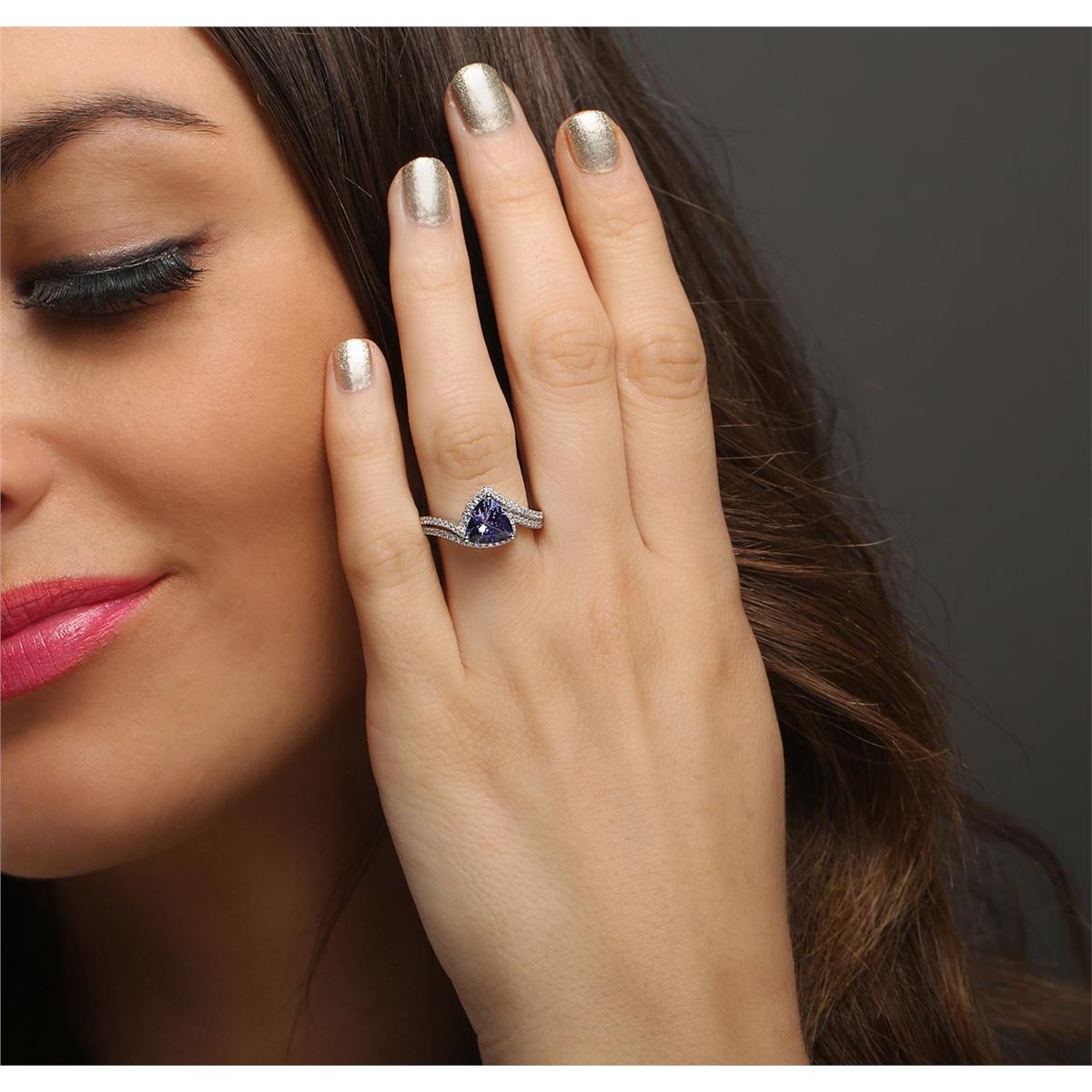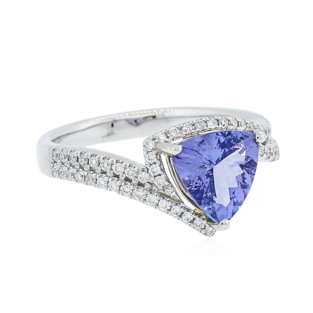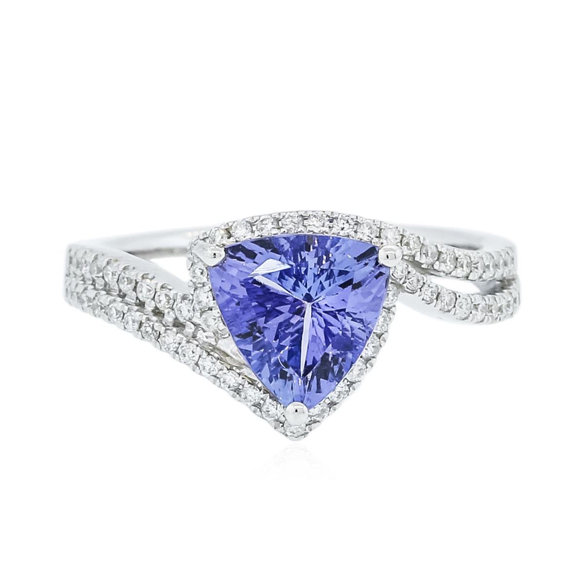 One electronically tested 14KT white and yellow gold ladies combination cast & assembled tanzanite and diamond ring with a flat shank with a bright polish finish. Identified with markings of "14K". Condition is new. Containing: One prong set triangle modified brilliant cut natural tanzanite, measuring 8.50 x 8.50 x 5.62mm, approximate weight of 2.45ct., clarity is eye clean, type I, medium light, very slightly grayish, violet color, (GIA V 4/3), cut is good. Sixty-Three prong set round brilliant cut diamonds, measuring 1.10 - 1.10 x 0.66mm (depth est.) stated total weight of 63 Stones = 0.30ct. Clarity: I-1 to I-2. Color: I - J, Cut is Good. Colored gemstones are presumed to have been subjected to commonly used enhancement processes. All diamonds and colored gemstones are graded in the mounting, unless otherwise stated total weight of Colored Stones 2.45ct. Total Weight of Diamonds 0.30ct. Total Weight of Ring 4.20 grams. GGL Appraised at $5,900.00.