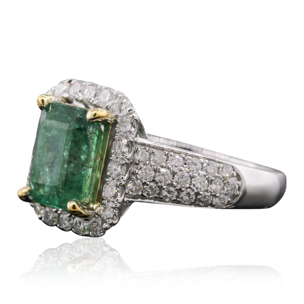 One electronically tested 14KT white and yellow gold Ladies combination cast & assembled ring with a high polish finish. Condition is new. Identified with markings of "14K". Containing: One prong set emerald standard step cut natural emerald, measuring 9.00 x 7.00 x 5.40mm, approximate weight of 2.50ct., clarity is heavily included, type III, medium light, very slightly grayish, bluish green color, (GIA bG 4/3), cut is good. Colored gemstones are presumed to have been subjected to commonly used color/clarity enhancement processes. Fifty-Six bead set round brilliant cut diamonds, measuring 1.80 - 1.40 x 0.96mm (depth est.) approximate. Total Weight of 56 Stones = 0.99ct. Clarity: I-1 to I-2. Color: G - H, Cut is Good. Total Weight of Colored Stones 2.50ct. Total Weight of Diamonds 0.99ct. Total Weight of Ring 5.80 grams. GGL Appraised at $8,890.00.