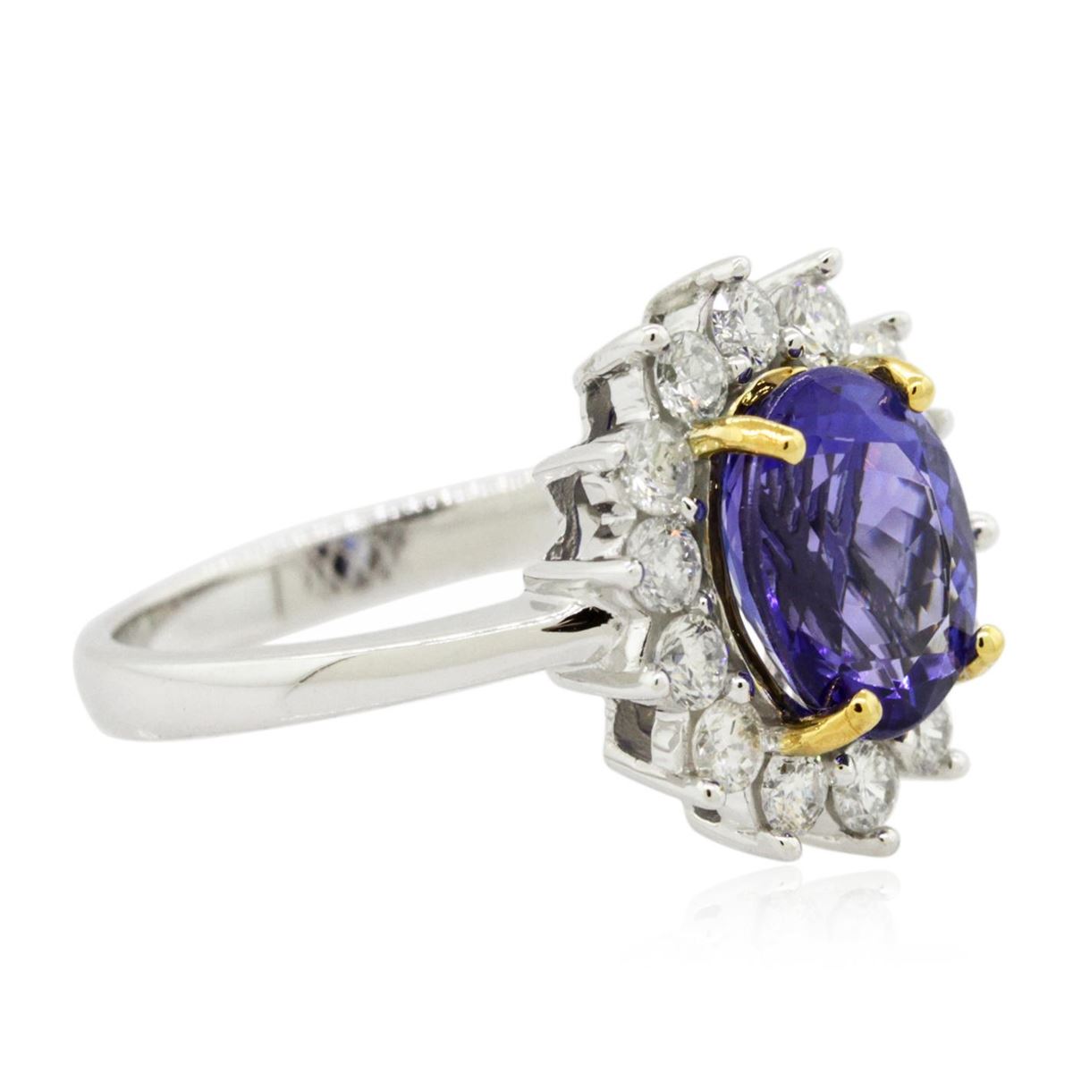One electronically tested 14KT white and yellow gold Ladies combination cast & assembled ring with a bright polish finish. Condition is new. Identified with markings of "14K". Containing: One prong set oval modified brilliant cut natural tanzanite, measuring 9.40 x 7.80 x 5.07mm, approximate weight of 2.51ct., clarity is eye clean, type I, medium, moderately strong, violetish blue color, (GIA vB 5/4), cut is good. Colored gemstones are presumed to have been subjected to commonly used color/clarity enhancement processes. Fourteen prong set round brilliant cut diamonds, measuring 2.20 - 2.20 x 1.32mm (depth est.) approximate. Total Weight of 14 Stones = 0.55ct. . Clarity: SI-2 to I-1. Color: H - I, Cut is Good. . Total Weight of Colored Stones 2.51ct. Total Weight of Diamonds 0.55ct. Total Weight of Ring 4.50 grams. GGL Appraised at $6,640.00.