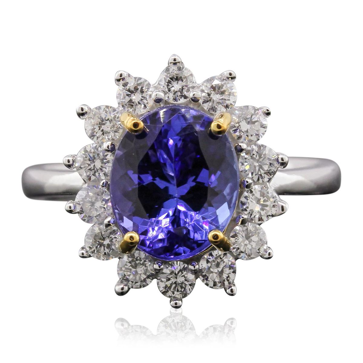 One electronically tested 14KT white and yellow gold Ladies combination cast & assembled ring with a bright polish finish. Condition is new. Identified with markings of "14K". Containing: One prong set oval modified brilliant cut natural tanzanite, measuring 9.40 x 7.80 x 5.07mm, approximate weight of 2.51ct., clarity is eye clean, type I, medium, moderately strong, violetish blue color, (GIA vB 5/4), cut is good. Colored gemstones are presumed to have been subjected to commonly used color/clarity enhancement processes. Fourteen prong set round brilliant cut diamonds, measuring 2.20 - 2.20 x 1.32mm (depth est.) approximate. Total Weight of 14 Stones = 0.55ct. . Clarity: SI-2 to I-1. Color: H - I, Cut is Good. . Total Weight of Colored Stones 2.51ct. Total Weight of Diamonds 0.55ct. Total Weight of Ring 4.50 grams. GGL Appraised at $6,640.00.