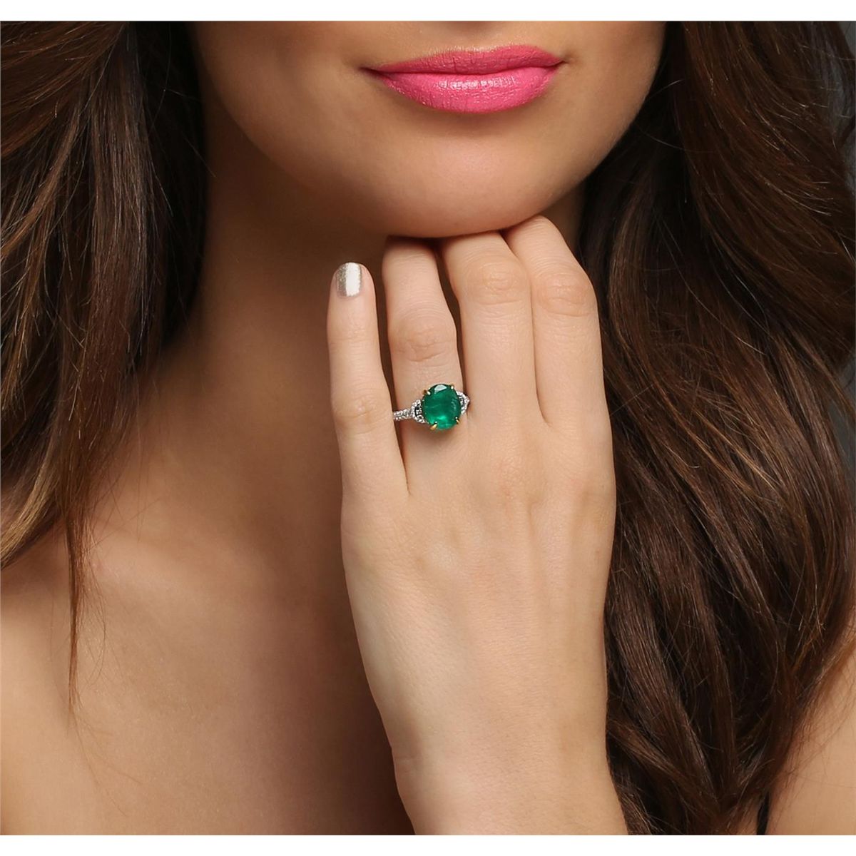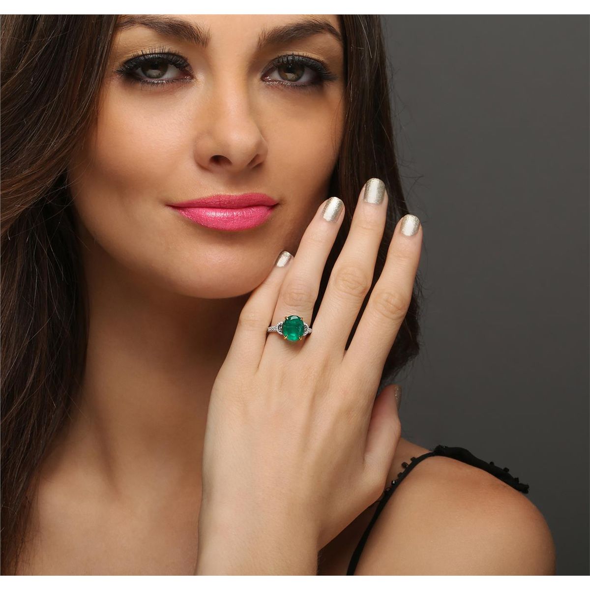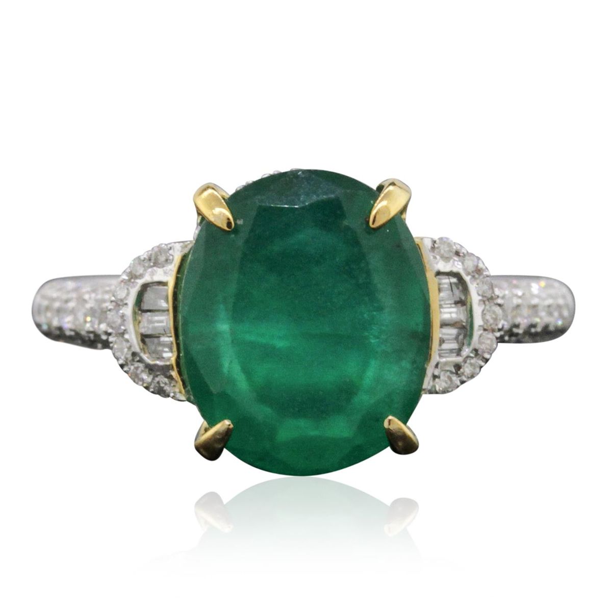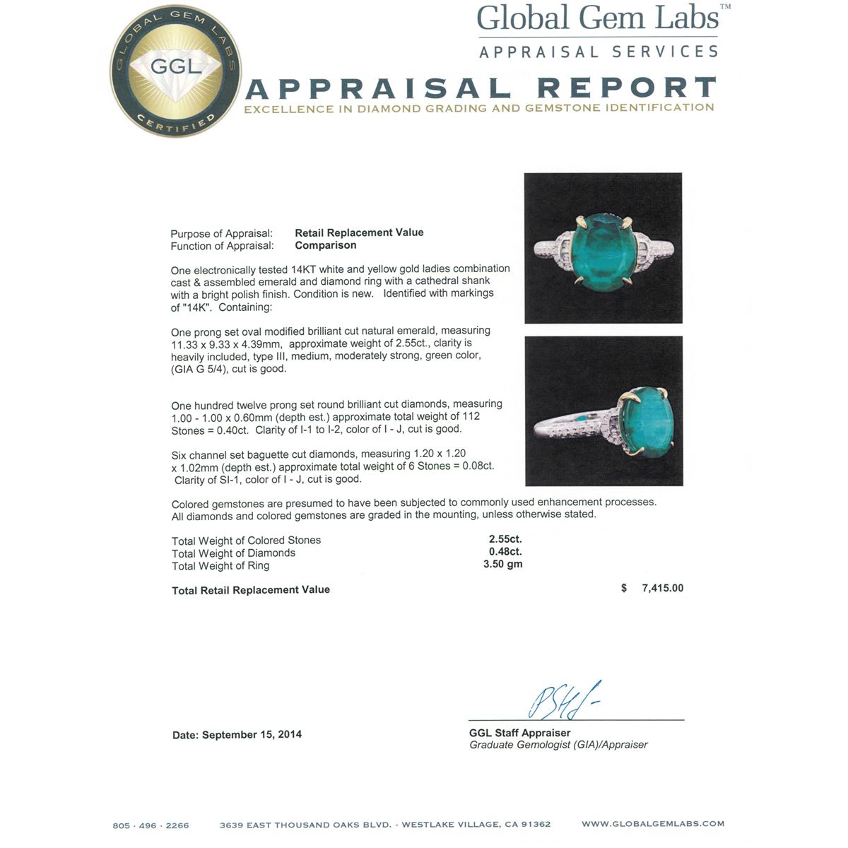 One electronically tested 14KT white and yellow gold ladies combination cast & assembled emerald and diamond ring with a cathedral shank with a bright polish finish. Identified with markings of "14K". Condition is new. Containing: One prong set oval modified brilliant cut natural emerald, measuring 11.33 x 9.33 x 4.39mm, approximate weight of 2.55ct., clarity is heavily included, type III, medium, moderately strong, green color, (GIA G 5/4), cut is good. One Hundred Twelve prong set round brilliant cut diamonds, measuring 1.00 - 1.00 x 0.60mm (depth est.) approximate total weight of 112 Stones = 0.40ct. Clarity: I-1 to I-2. Color: I - J, Cut is Good. Six channel set baguette cut diamonds, measuring 1.20 x 1.20 x 1.02mm (depth est.) approximate total weight of 6 Stones = 0.08ct. Clarity: SI-1. Color: I - J, Cut is Good. Colored gemstones are presumed to have been subjected to commonly used enhancement processes. All diamonds and colored gemstones are graded in the mounting, unless otherwise stated total weight of Colored Stones 2.55ct. Total Weight of Diamonds 0.48ct. Total Weight of Ring 3.50 grams. GGL Appraised at $7,415.00.