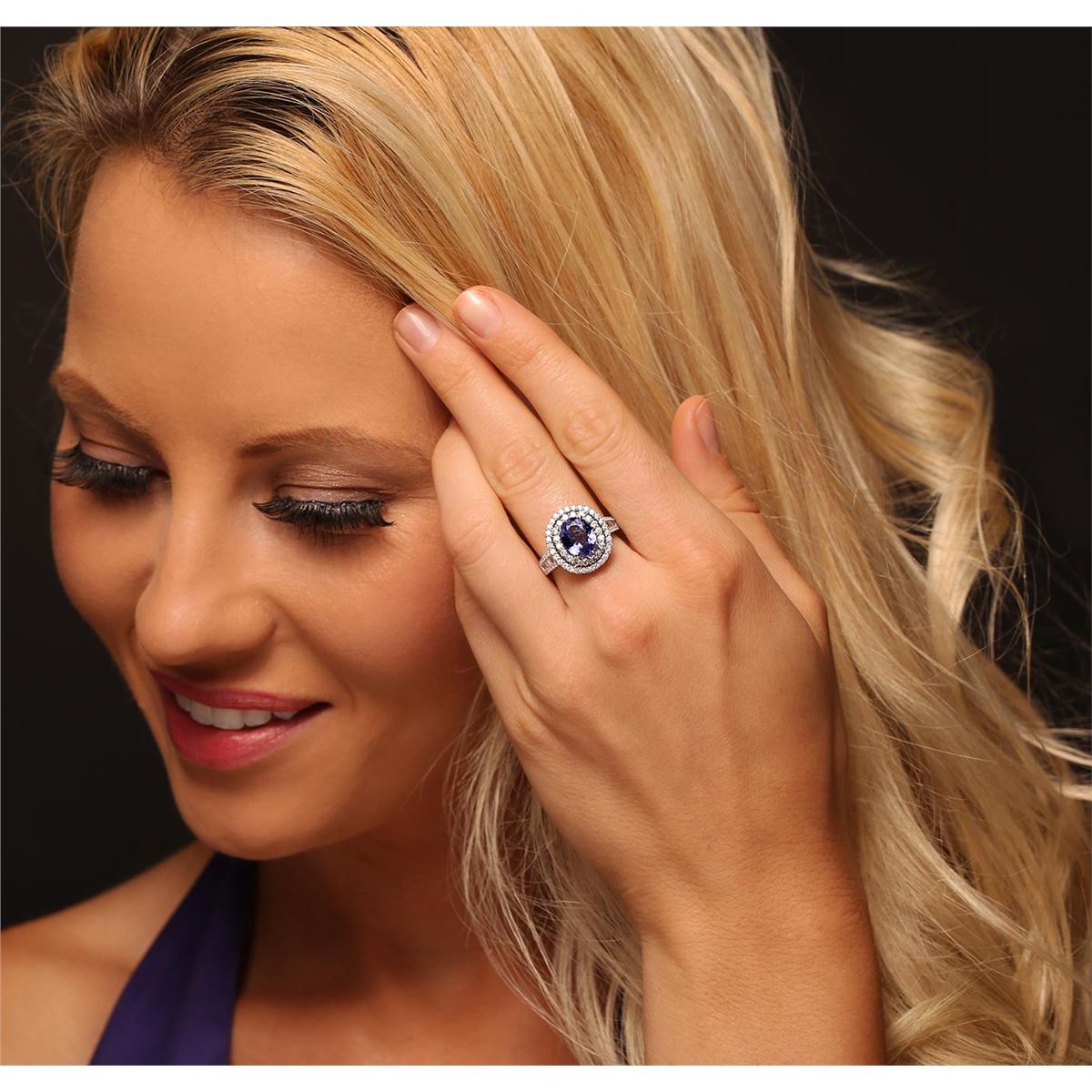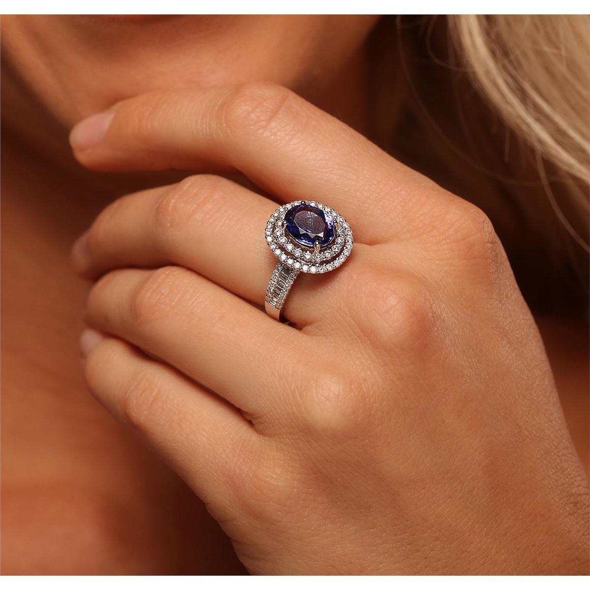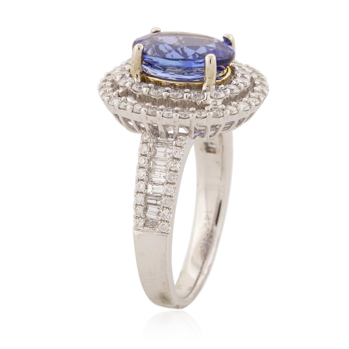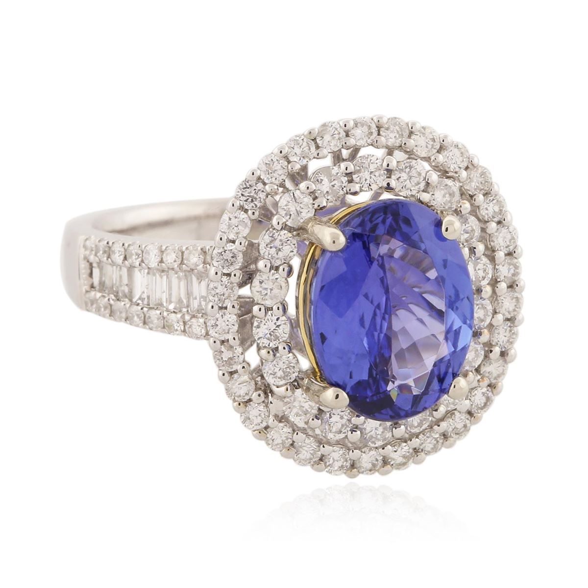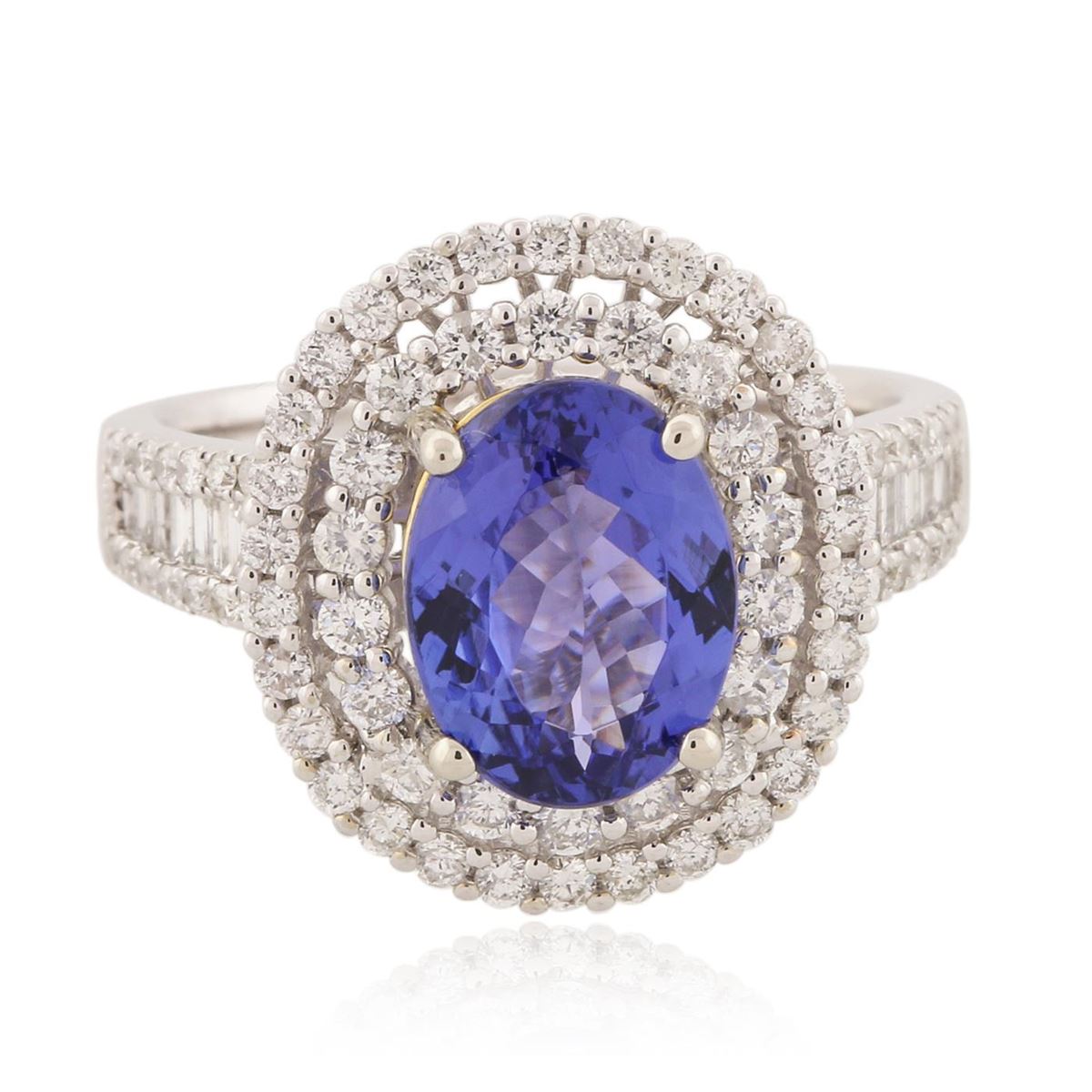 One electronically tested 14KT white and yellow gold Ladies combination cast & assembled fashion ring with a bright polish finish. Condition is new. Identified with markings of "14K". Containing: One prong set oval modified mixed cut natural tanzanite, measuring 10.00 x 8.00 x 5.20mm, approximate weight of 2.63ct., clarity is eye clean, type I, medium light, very slightly grayish, bluish violet color, (GIA bV 4/3), cut is very good. Colored gemstones are presumed to have been subjected to commonly used color/clarity enhancement processes. Fourteen channel set baguette cut diamonds, measuring 2.50 x 1.50 x 1.28mm (depth est.) approximate. Total Weight of 14 Stones = 0.70ct. Clarity: SI-1 to SI-2. Color: H - I, Cut is Good. Eighty prong set round brilliant cut diamonds, measuring 1.40 - 1.10 x 0.75mm (depth est.) approximate. Total Weight of 80 Stones = 0.57ct. Clarity: I-1 to I-2. Color: H - I, Cut is Good. Total Weight of Colored Stones 2.63ct. Total Weight of Diamonds 1.27ct. Total Weight of Ring 6.00 grams. GGL Appraised at $8,700.00.