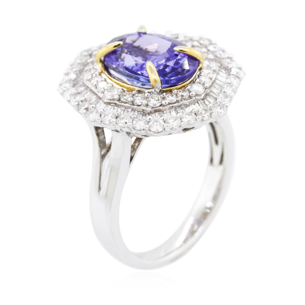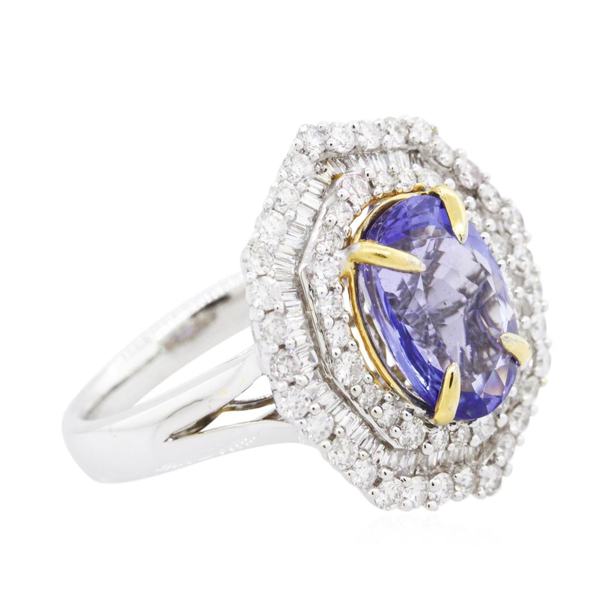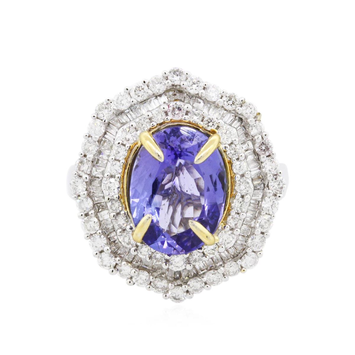One electronically tested 14KT white and yellow gold ladies combination cast & assembled tanzanite and diamond ring with a split shank with a bright polish finish. Identified with markings of "14K". Condition is new. Containing: One prong set oval modified brilliant cut natural tanzanite, measuring 11.36 x 8.52 x 3.97mm, approximate weight of 2.63ct., clarity is eye clean, type I, medium, very slightly grayish, violet color, (GIA V 5/3), cut is good. Fifty-Six prong set round brilliant cut diamonds, measuring 1.70 - 1.30 x 0.90mm (depth est.) approximate total weight of 56 Stones = 0.69ct. Clarity: SI-2 to I-2. Color: I - J, Cut is Good. Fifty-Six channel set baguette cut diamonds, measuring 1.30 x 1.10 x 0.94mm (depth est.) approximate total weight of 56 Stones = 0.69ct. Clarity: SI-1. Color: H - I, Cut is Good. Colored gemstones are presumed to have been subjected to commonly used enhancement processes. All diamonds and colored gemstones are graded in the mounting, unless otherwise stated total weight of Colored Stones 2.63ct. Total Weight of Diamonds 1.38ct. Total Weight of Ring 6.40 grams. GGL Appraised at $9,200.00.