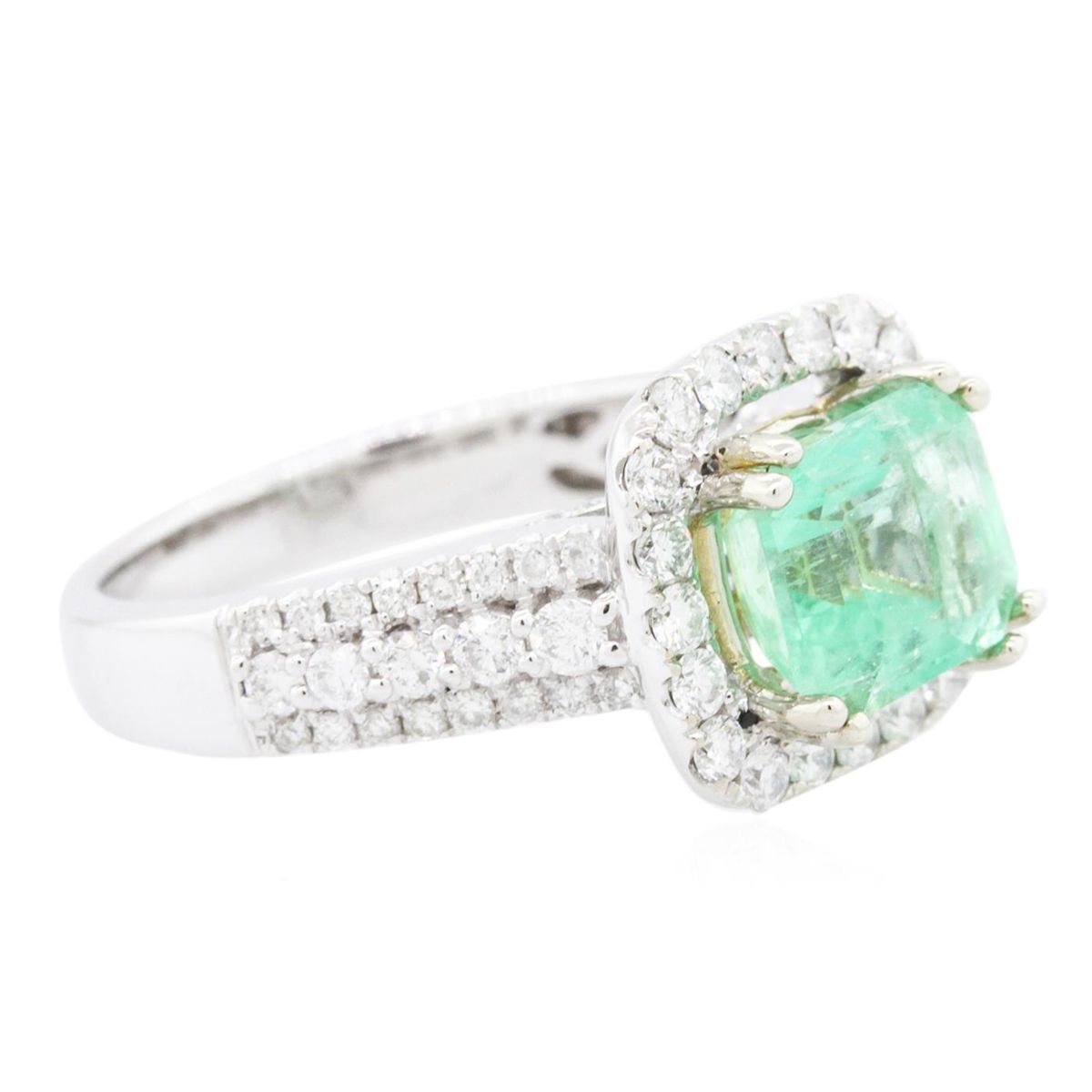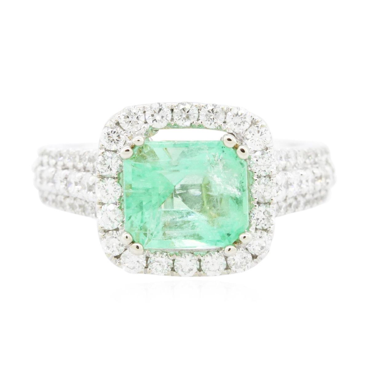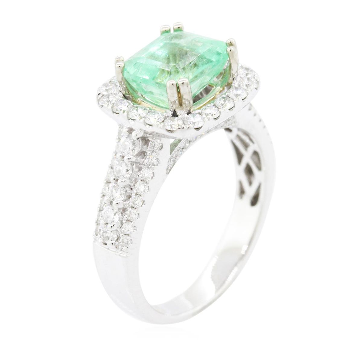One electronically tested 14KT white and yellow gold ladies combination cast & assembled emerald and diamond ring with a flat shank with a bright polish finish. Identified with markings of "14K". Condition is new. Containing: One prong set emerald standard step cut natural emerald, measuring 8.38 x 7.25 x 6.15mm, approximate weight of 2.74ct., clarity is slightly included, type III, light, very slightly grayish, bluish green color, (GIA bG 3/3), cut is good. Sixty-Two prong set round brilliant cut diamonds, measuring 1.90 - 1.20 x 0.93mm (depth est.) approximate total weight of 62 Stones = 0.84ct. Clarity: I-1 to I-2. Color: I - J, Cut is Good. Colored gemstones are presumed to have been subjected to commonly used enhancement processes. All diamonds and colored gemstones are graded in the mounting, unless otherwise stated total weight of Colored Stones 2.74ct. Total Weight of Diamonds 0.84ct. Total Weight of Ring 5.80 grams. GGL Appraised at $9,270.00.