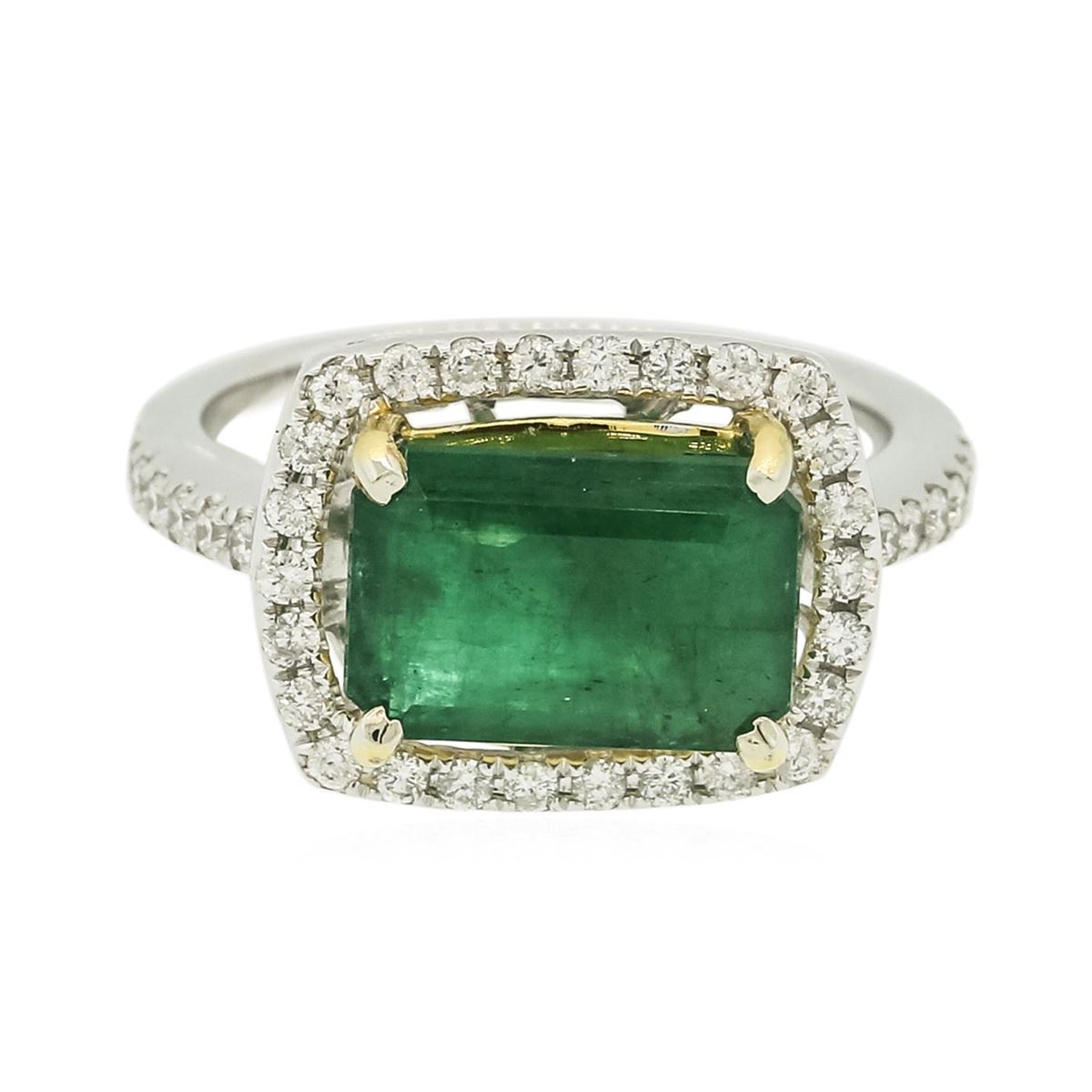 One electronically tested 14KT white and yellow gold ladies combination cast & assembled ring with a bright polish finish. Identified with markings of "14K". Condition is new. Containing: One prong set emerald standard step cut natural emerald, measuring 11.16 x 7.58 x 4.46mm, approximate weight of 2.77ct., clarity is heavily included, type III, medium dark, moderately strong, green color, (GIA G 6/4), cut is good. Forty prong set round brilliant cut diamonds, measuring 1.40 - 1.30 x 0.81mm (depth est.) approximate total weight of 40 Stones = 0.36ct. Clarity: I-1 to I-2. Color: I - J, Cut is Good. Colored gemstones are presumed to have been subjected to commonly used enhancement processes. All diamonds and colored gemstones are graded in the mounting, unless otherwise stated. Total Weight of Colored Stones 2.77ct. Total Weight of Diamonds 0.36ct. Total Weight of Ring 5.40 grams. GGL Appraised at $7,765.00.