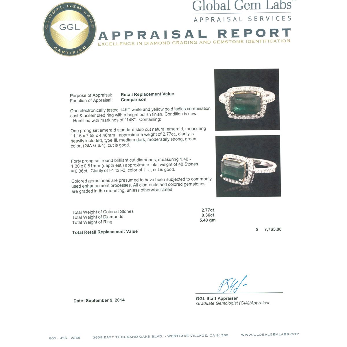 One electronically tested 14KT white and yellow gold ladies combination cast & assembled ring with a bright polish finish. Identified with markings of "14K". Condition is new. Containing: One prong set emerald standard step cut natural emerald, measuring 11.16 x 7.58 x 4.46mm, approximate weight of 2.77ct., clarity is heavily included, type III, medium dark, moderately strong, green color, (GIA G 6/4), cut is good. Forty prong set round brilliant cut diamonds, measuring 1.40 - 1.30 x 0.81mm (depth est.) approximate total weight of 40 Stones = 0.36ct. Clarity: I-1 to I-2. Color: I - J, Cut is Good. Colored gemstones are presumed to have been subjected to commonly used enhancement processes. All diamonds and colored gemstones are graded in the mounting, unless otherwise stated. Total Weight of Colored Stones 2.77ct. Total Weight of Diamonds 0.36ct. Total Weight of Ring 5.40 grams. GGL Appraised at $7,765.00.