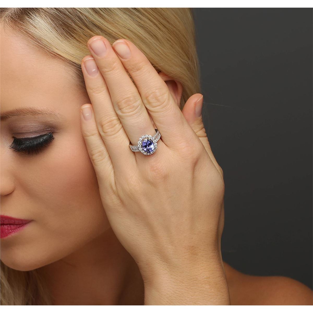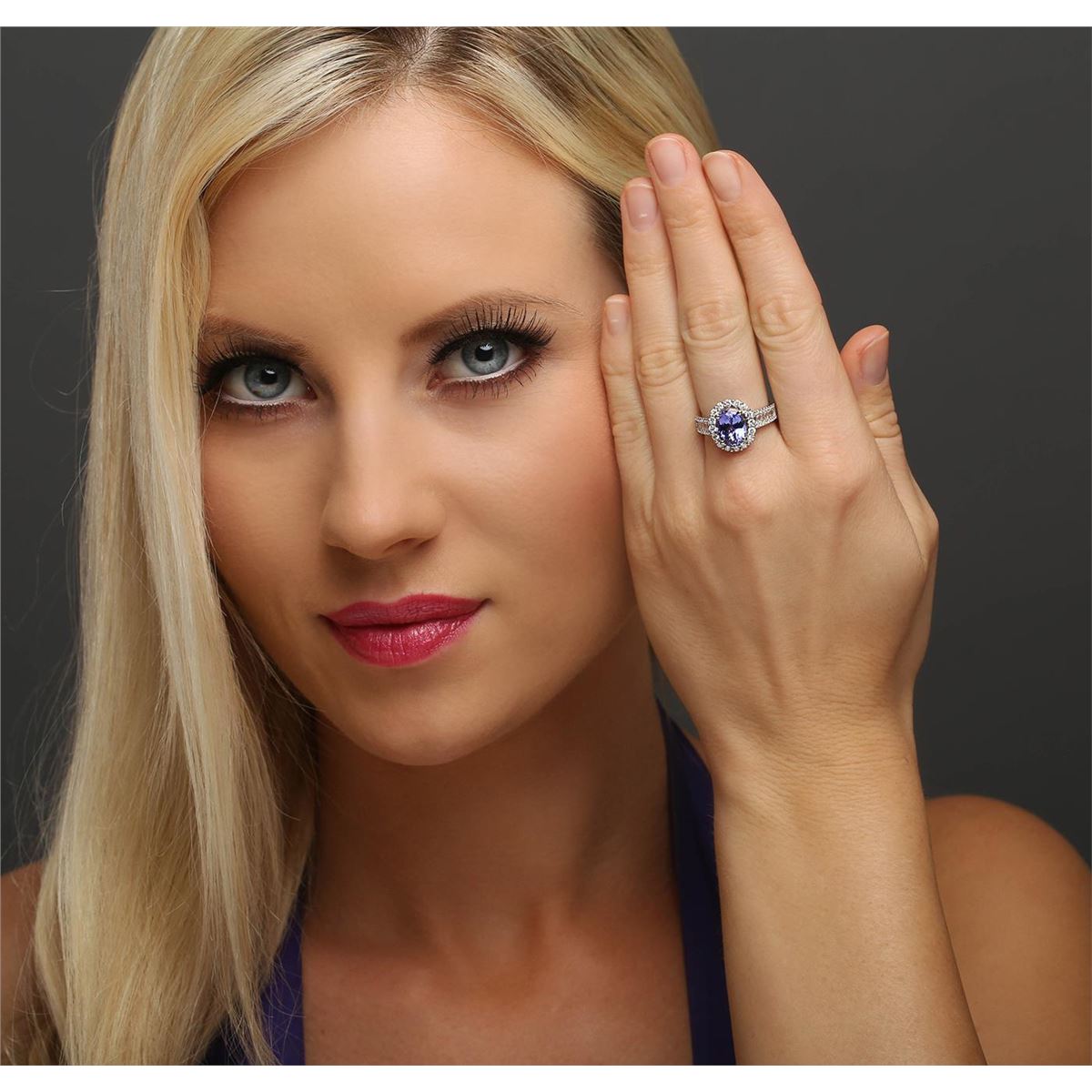 One electronically tested 14KT white and yellow gold ladies combination cast & assembled tanzanite and diamond ring with a flat shank with a bright polish finish. Identified with markings of "14K". Condition is new. Containing: One prong set oval modified brilliant cut natural tanzanite, measuring 9.59 x 7.55 x 5.68mm, approximate weight of 2.80ct., clarity is eye clean, type I, medium light, moderately strong, violet color, (GIA V 4/4), cut is good. Fifty-Six prong set round brilliant cut diamonds, measuring 1.90 - 1.00 x 0.87mm (depth est.) approximate total weight of 56 Stones = 0.62ct. Clarity: I-1 to I-2. Color: I - J, Cut is Good. Colored gemstones are presumed to have been subjected to commonly used enhancement processes. All diamonds and colored gemstones are graded in the mounting, unless otherwise stated total weight of Colored Stones 2.80ct. Total Weight of Diamonds 0.62ct. Total Weight of Ring 5.50 grams. GGL Appraised at $7,145.00.