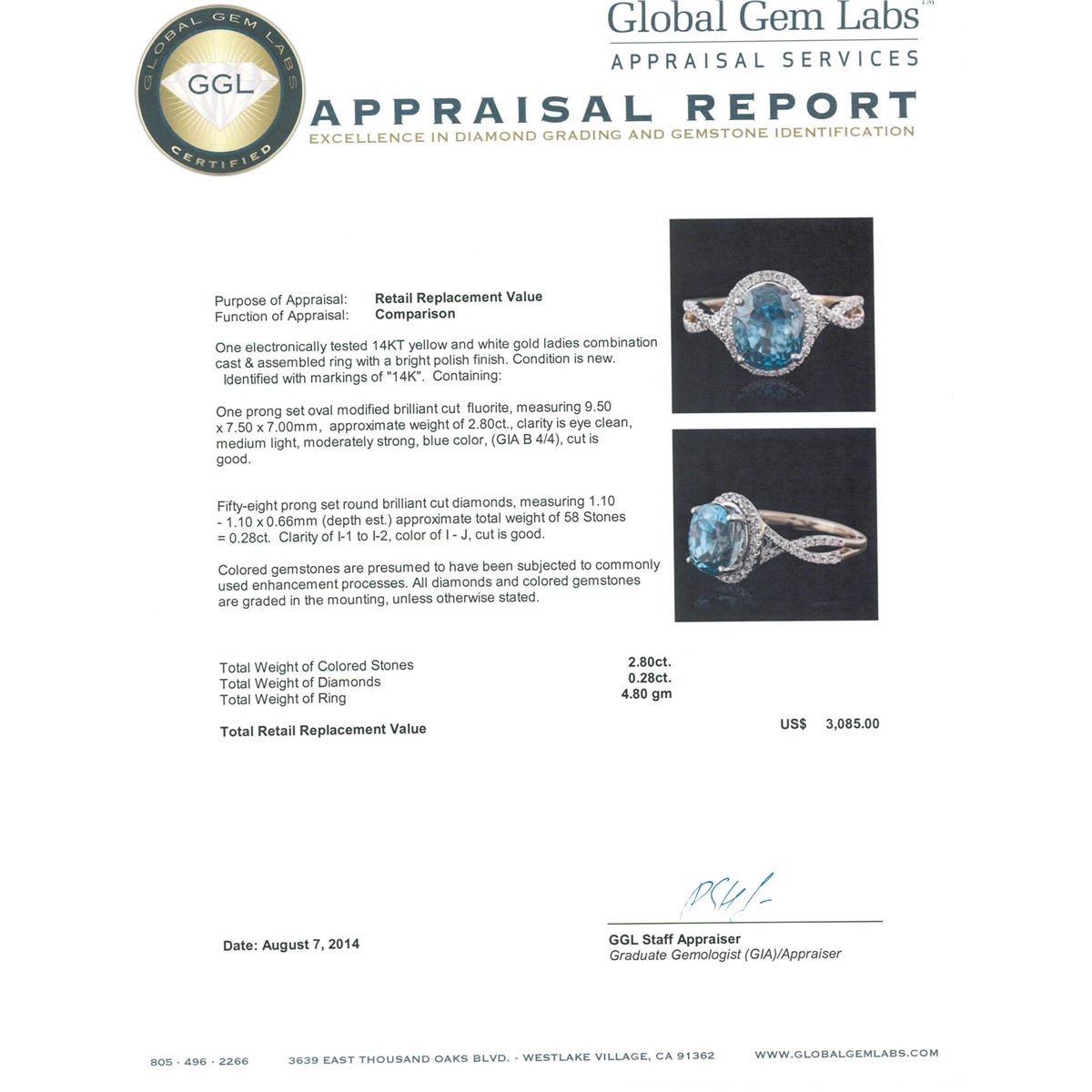 One electronically tested 14KT yellow and white gold ladies combination cast & assembled ring with a bright polish finish. Identified with markings of "14K". Condition is new. Containing: One prong set oval modified brilliant cut fluorite, measuring 9.50 x 7.50 x 7.00mm, approximate weight of 2.80ct., clarity is eye clean, medium light, moderately strong, blue color, (GIA B 4/4), cut is good. Fifty-Eight prong set round brilliant cut diamonds, measuring 1.10 - 1.10 x 0.66mm (depth est.) approximate total weight of 58 Stones = 0.28ct. Clarity: I-1 to I-2. Color: I - J, Cut is Good. Colored gemstones are presumed to have been subjected to commonly used enhancement processes. All diamonds and colored gemstones are graded in the mounting, unless otherwise stated. Total Weight of Colored Stones 2.80ct. Total Weight of Diamonds 0.28ct. Total Weight of Ring 4.80 grams. GGL Appraised at $3,085.00.