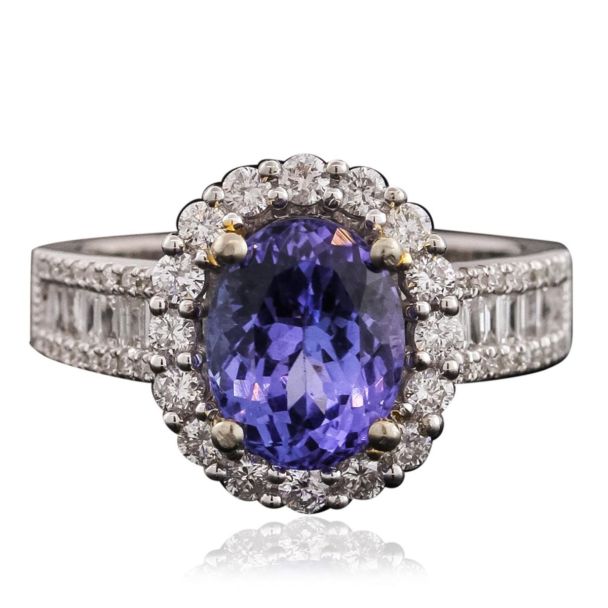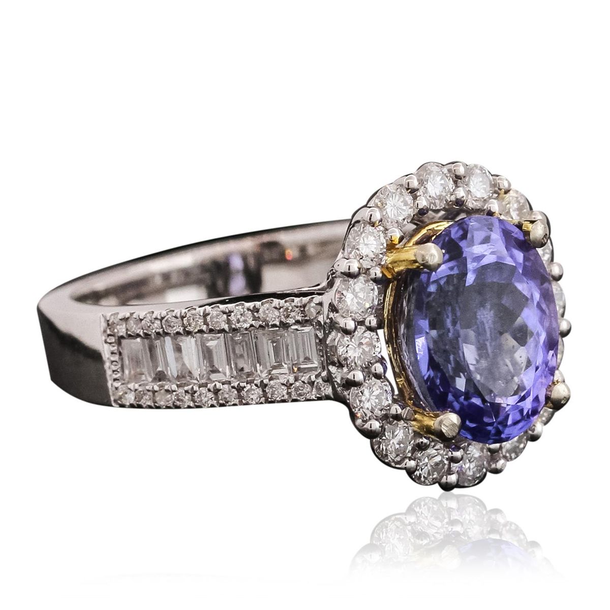 One electronically tested 14KT white and yellow gold ladies combination cast & assembled tanzanite and diamond ring with a flat shank with a bright polish finish. Identified with markings of "14K". Condition is new. Containing: One prong set oval modified brilliant cut natural tanzanite, measuring 9.59 x 7.55 x 5.68mm, approximate weight of 2.80ct., clarity is eye clean, type I, medium light, moderately strong, violet color, (GIA V 4/4), cut is good. Fifty-Six prong set round brilliant cut diamonds, measuring 1.90 - 1.00 x 0.87mm (depth est.) approximate total weight of 56 Stones = 0.62ct. Clarity: I-1 to I-2. Color: I - J, Cut is Good. Colored gemstones are presumed to have been subjected to commonly used enhancement processes. All diamonds and colored gemstones are graded in the mounting, unless otherwise stated total weight of Colored Stones 2.80ct. Total Weight of Diamonds 0.62ct. Total Weight of Ring 5.50 grams. GGL Appraised at $7,145.00.