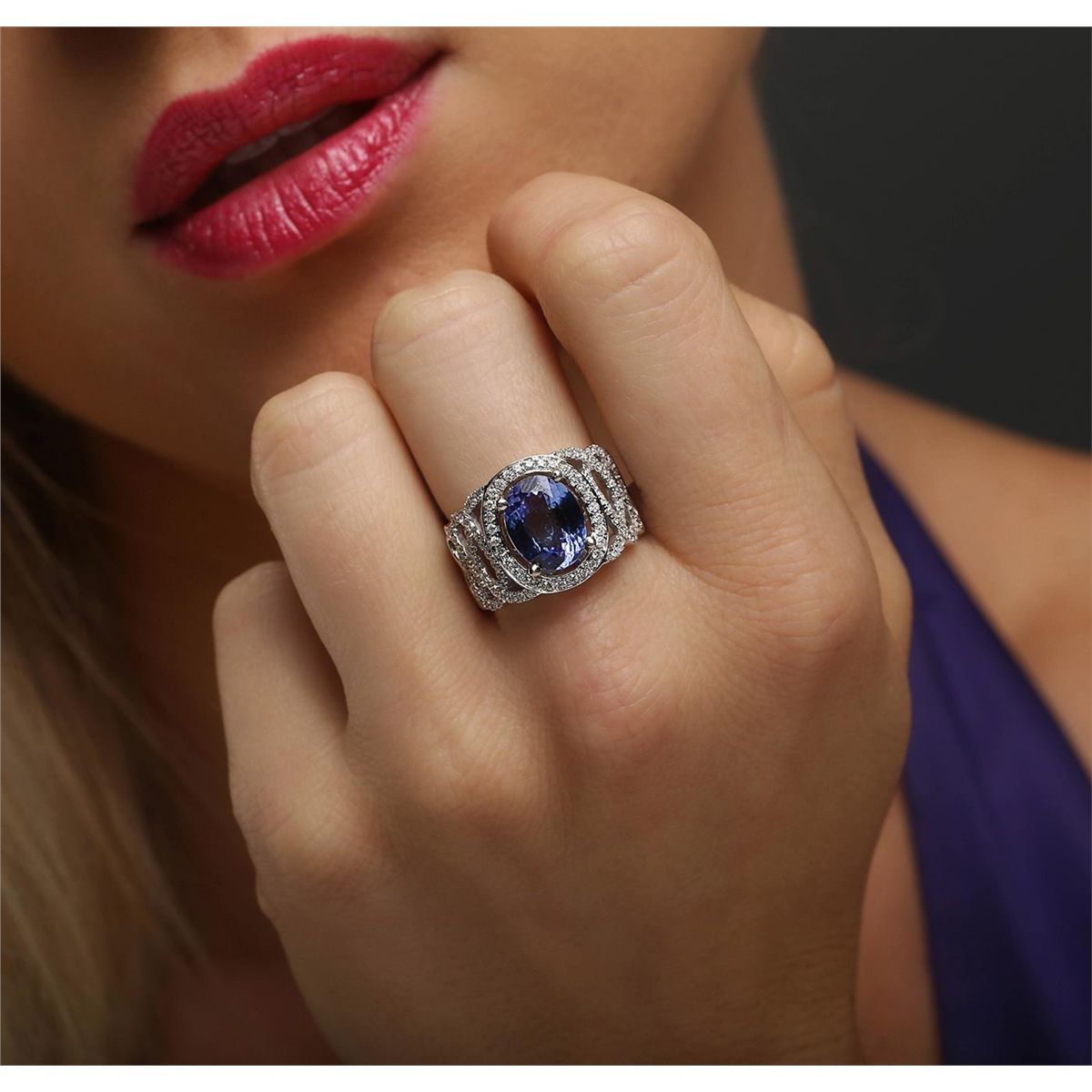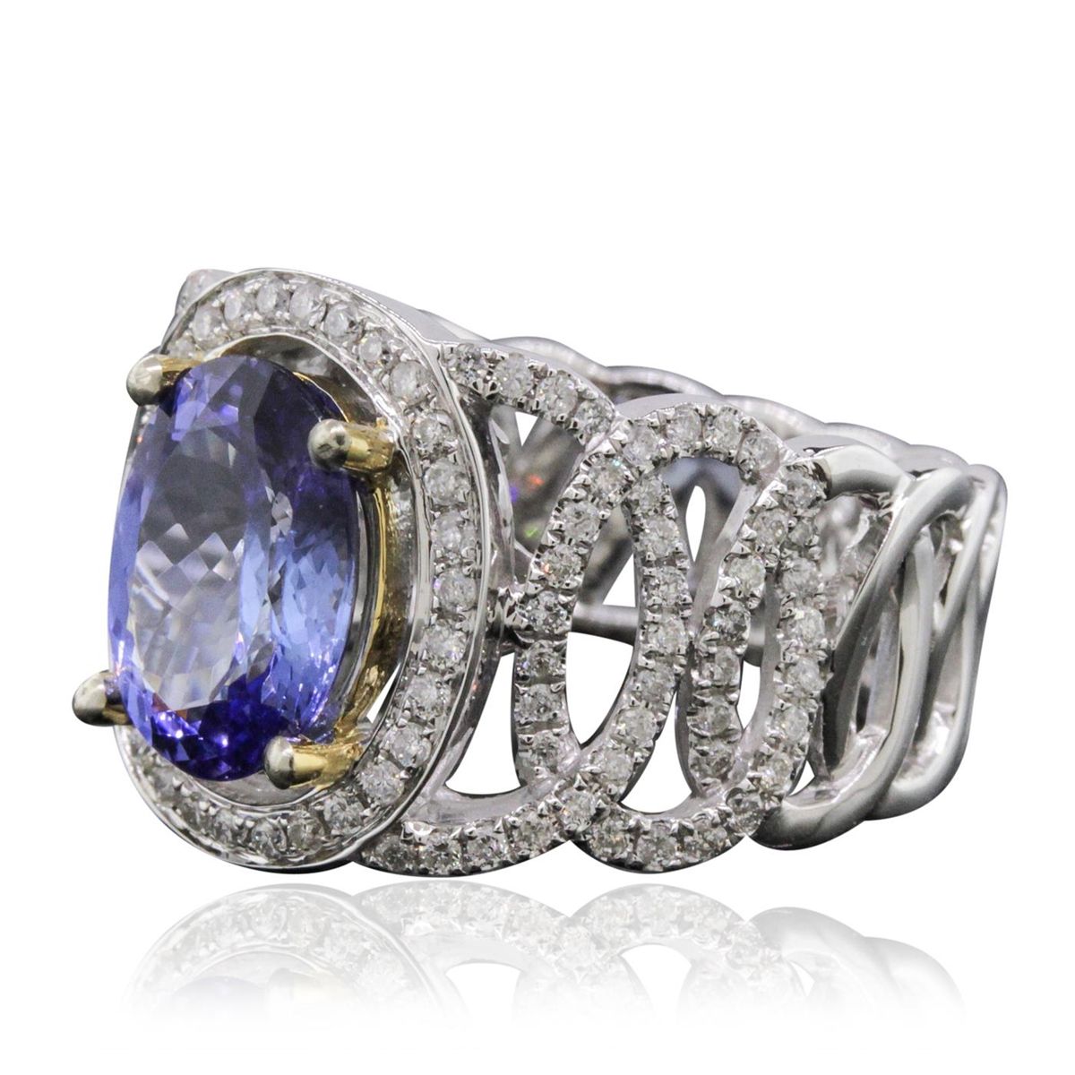 One electronically tested 14KT white and yellow gold ladies combination cast & assembled tanzanite and diamond ring with a tapered shank with a bright polish finish. Identified with markings of "14K". Condition is new. Containing: One prong set oval modified brilliant cut natural tanzanite, measuring 10.74 x 8.46 x 4.67mm, approximate weight of 2.88ct., clarity is eye clean, type I, medium light, very slightly grayish, violet color, (GIA V 4/3), cut is good. One Hundred Sixteen prong set round brilliant cut diamonds, measuring 1.30 - 1.30 x 0.78mm (depth est.) approximate total weight of 116 Stones = 0.93ct. Clarity: I-1 to I-2. Color: I - J, Cut is Good. Colored gemstones are presumed to have been subjected to commonly used enhancement processes. All diamonds and colored gemstones are graded in the mounting, unless otherwise stated total weight of Colored Stones 2.88ct. Total Weight of Diamonds 0.93ct. Total Weight of Ring 7.90 grams. GGL Appraised at $8,705.00.