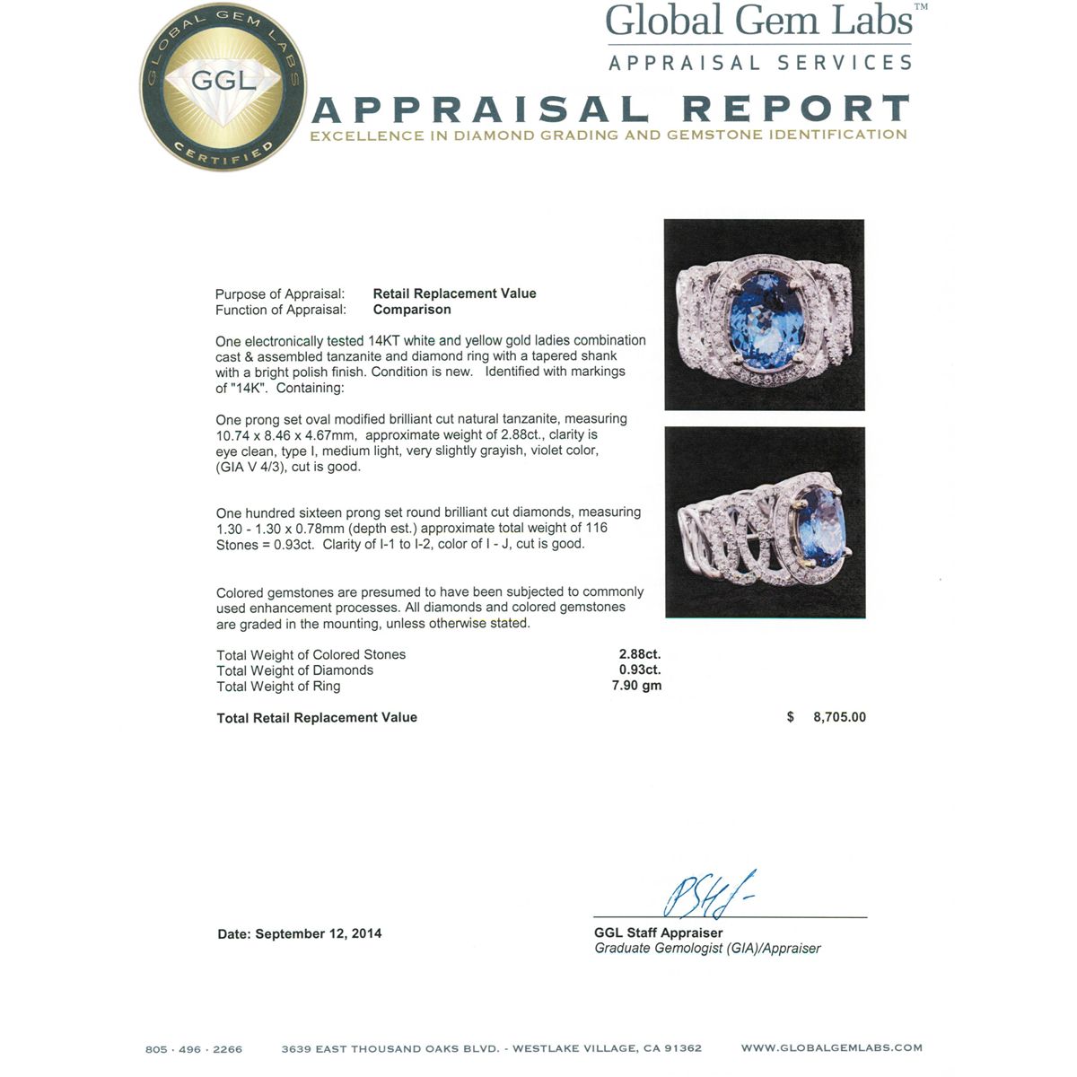 One electronically tested 14KT white and yellow gold ladies combination cast & assembled tanzanite and diamond ring with a tapered shank with a bright polish finish. Identified with markings of "14K". Condition is new. Containing: One prong set oval modified brilliant cut natural tanzanite, measuring 10.74 x 8.46 x 4.67mm, approximate weight of 2.88ct., clarity is eye clean, type I, medium light, very slightly grayish, violet color, (GIA V 4/3), cut is good. One Hundred Sixteen prong set round brilliant cut diamonds, measuring 1.30 - 1.30 x 0.78mm (depth est.) approximate total weight of 116 Stones = 0.93ct. Clarity: I-1 to I-2. Color: I - J, Cut is Good. Colored gemstones are presumed to have been subjected to commonly used enhancement processes. All diamonds and colored gemstones are graded in the mounting, unless otherwise stated total weight of Colored Stones 2.88ct. Total Weight of Diamonds 0.93ct. Total Weight of Ring 7.90 grams. GGL Appraised at $8,705.00.